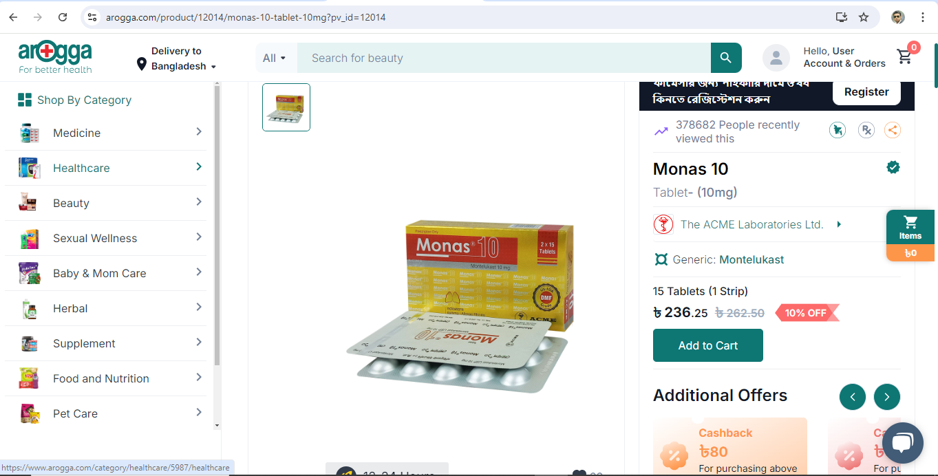 এখানে আমি Montelukast গ্রুপের Monas 10 লিখে সার্চ করলাম। সাথে সাথে মূল্য ও কোম্পানির নাম সহ সেই ঔষুধের ছবি চলে আসলো। এখানে ডান পাশে দেখতে পাচ্ছেন এক বক্স ঔষুধের দাম ২৩৬ টাকা দেখাচ্ছে। এটা হচ্ছে যারা এখান থেকে ফার্মেসির জন্য ঔষুধ কিনবে, তাদের জন্য পাইকারি দাম। কিন্তুৃ খুচরো বাজারের দাম হলো এক বক্সের দাম ২৬২ টাকা। এখান থেকে ফার্মেসির জন্য পাইকারি ঔষুধ কিনলে ১০% ডিস্কাউন্ট দেওয়া হয়। যদি খুচরো বাজারে এক বক্স ঔষুধের দাম ২৬২ টাকা হয় তাহলে একটি বক্সে ৩০টি ট্যাবলেট থাকে। প্রতি ট্যাবলেটের দাম পড়ে পায় ৯ টাকা করে।