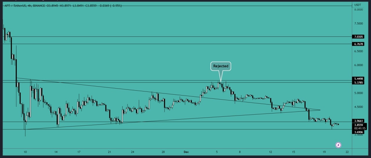 APT analysisdogesatoshi (30)in #apt • 3 years ago APT analysis: APT broke the triangle in a downward direction. Price is testing the major support of the $3.70-$3.95 area. A break below $3.75 is extremely bearish and we see a heavy dump. Don't rush for new entries and wait for some time. #crypto #analysis