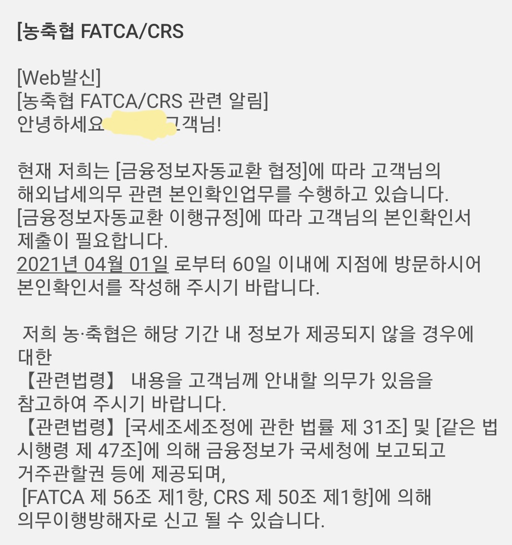 최근에 거래은행에서 FATCA/CRS라며 해외납세의무가 있는지 신고하라고 하네요. 이게 뭐죠? 제명의로 누군가 해외계좌를 만들어 이용하고 있다는 건지? 전화하니 안하면 미국 국세청으로 정보가 넘어간다느니 계좌가 문제 있을 수 있다. 조세법이 바뀌었다..등 뭔가 협박당한다는 느낌이 듭니다.