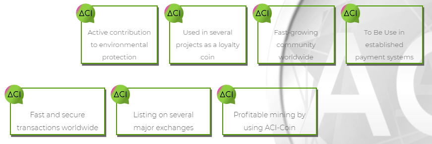 The ACI coin is intended as a means of payment for various projects dealing with water treatment systems and hydrogen technologies and is also used for cashback programs.