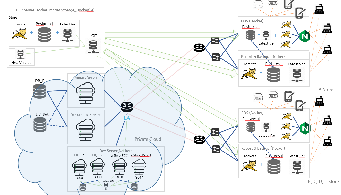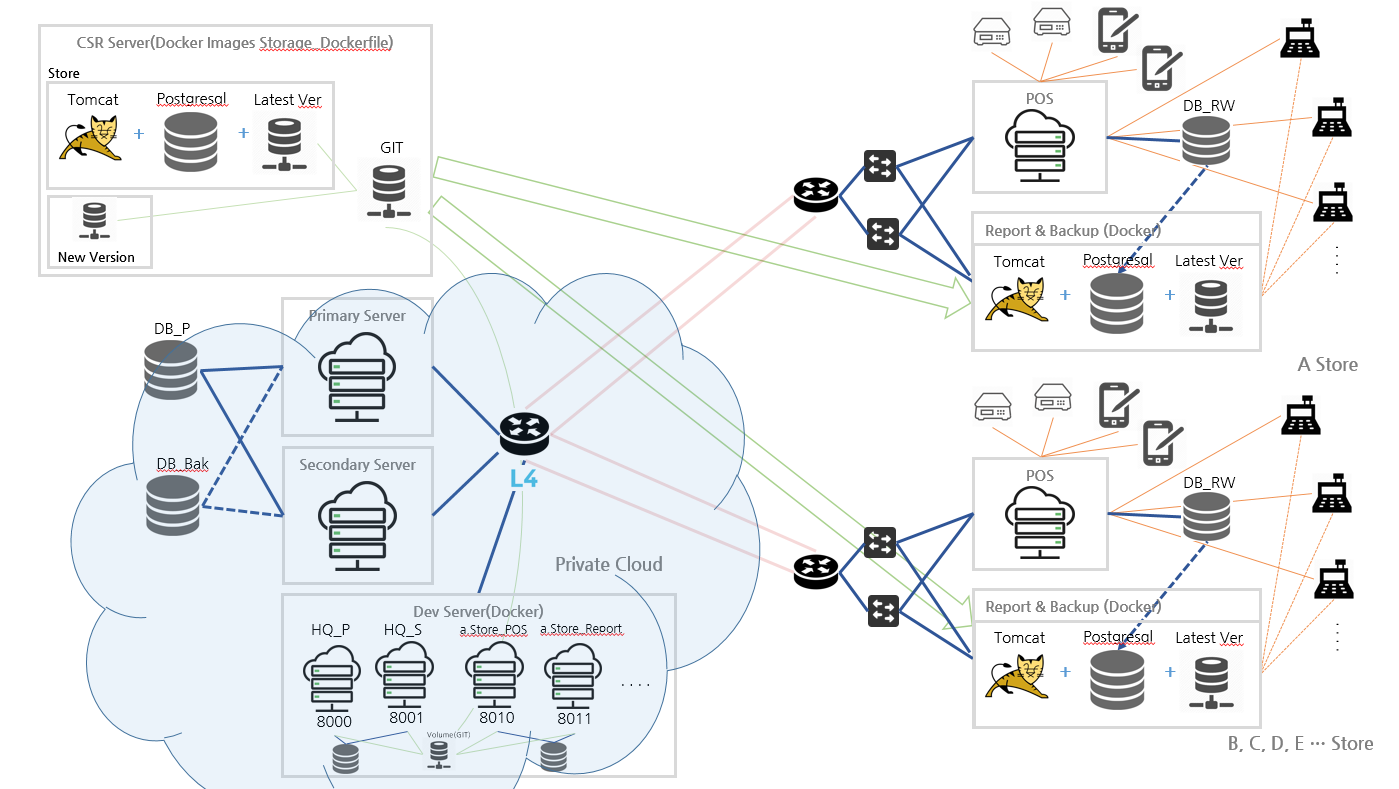 - 본부 시스템, 점포_POS, 점포_Report, 개발, DB#1~5 으로 총 9 개의 서비스각 각각 포트로 실행됨