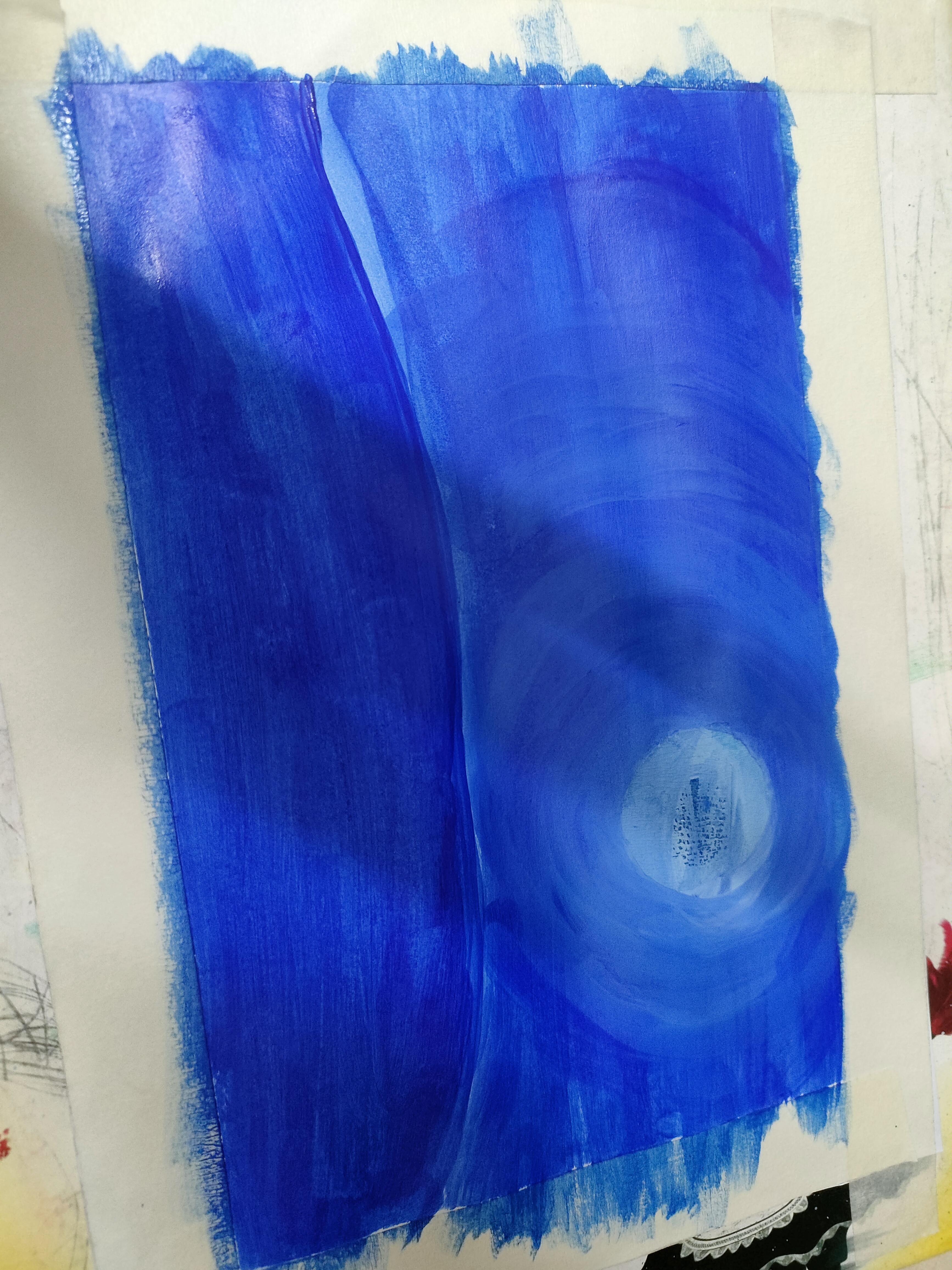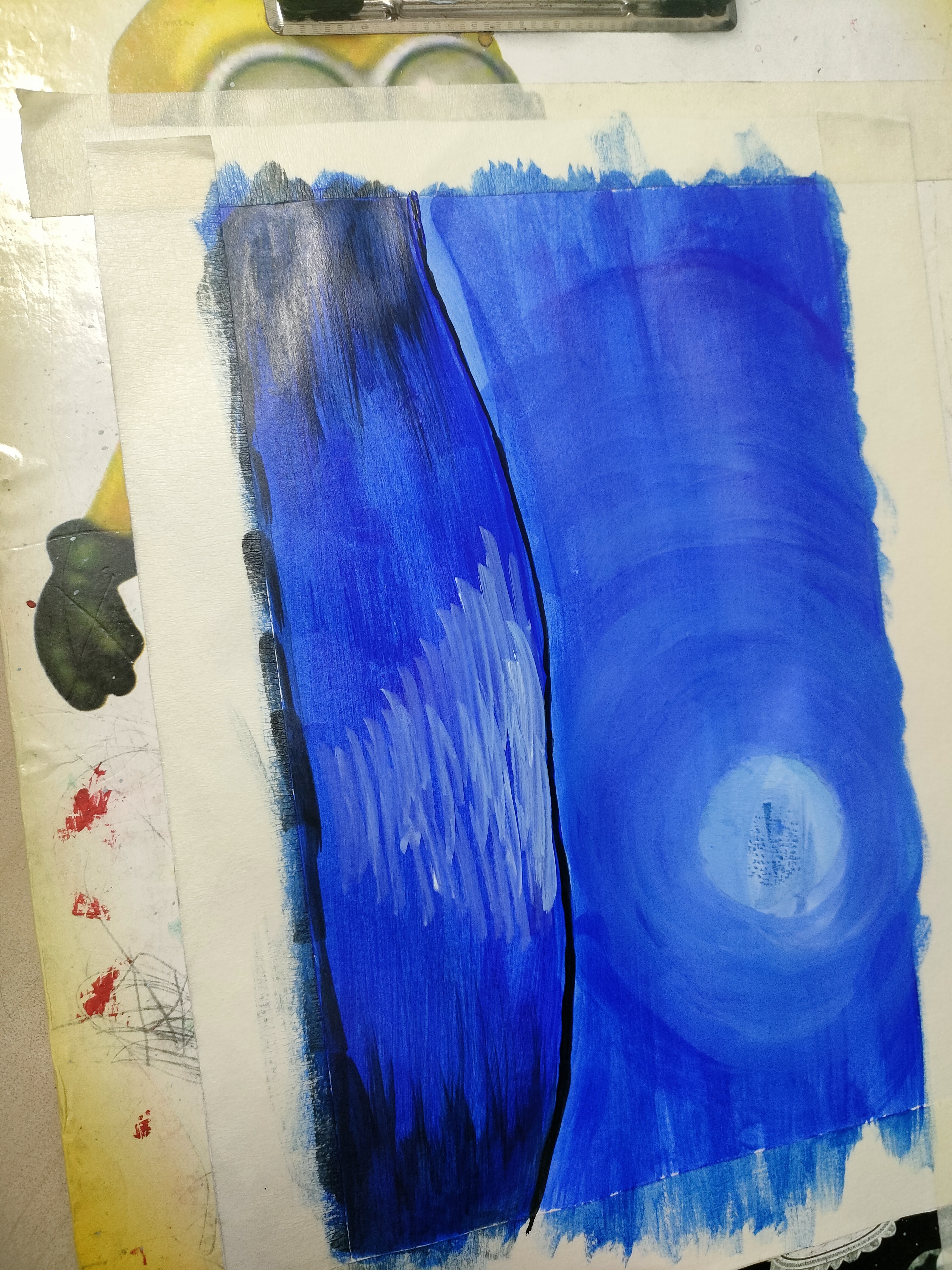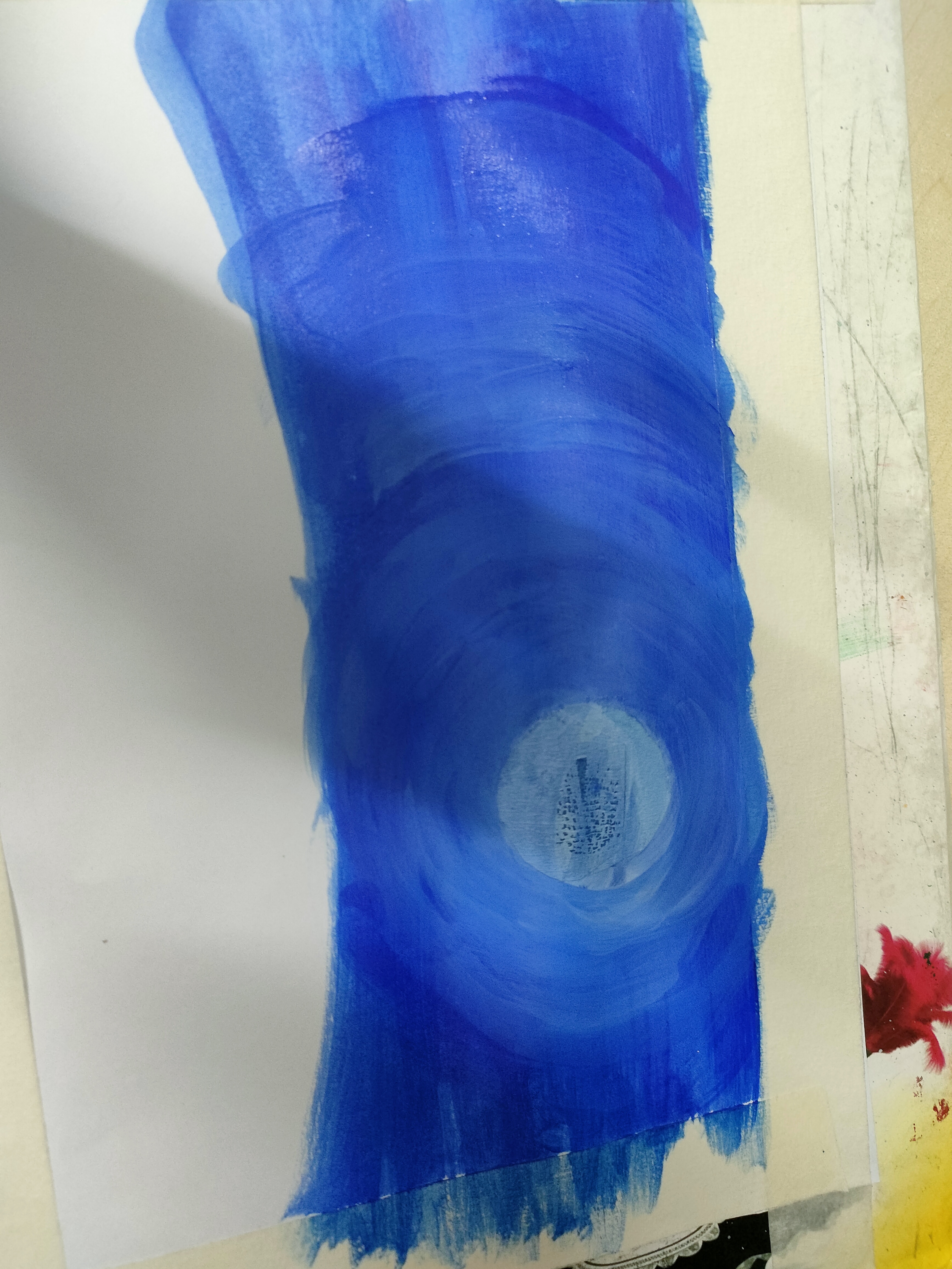 প্রথমে একটি পেপারের চারপাশে মাসকিন টেপ লাগিয়ে নিয়েছি। উপরের অংশে নীল কালারের রং করেছি।এখন সাদা রং দিয়ে নীল কালারের উপর এভাবে গোলগোল ঘুরিয়ে রং করেছি।