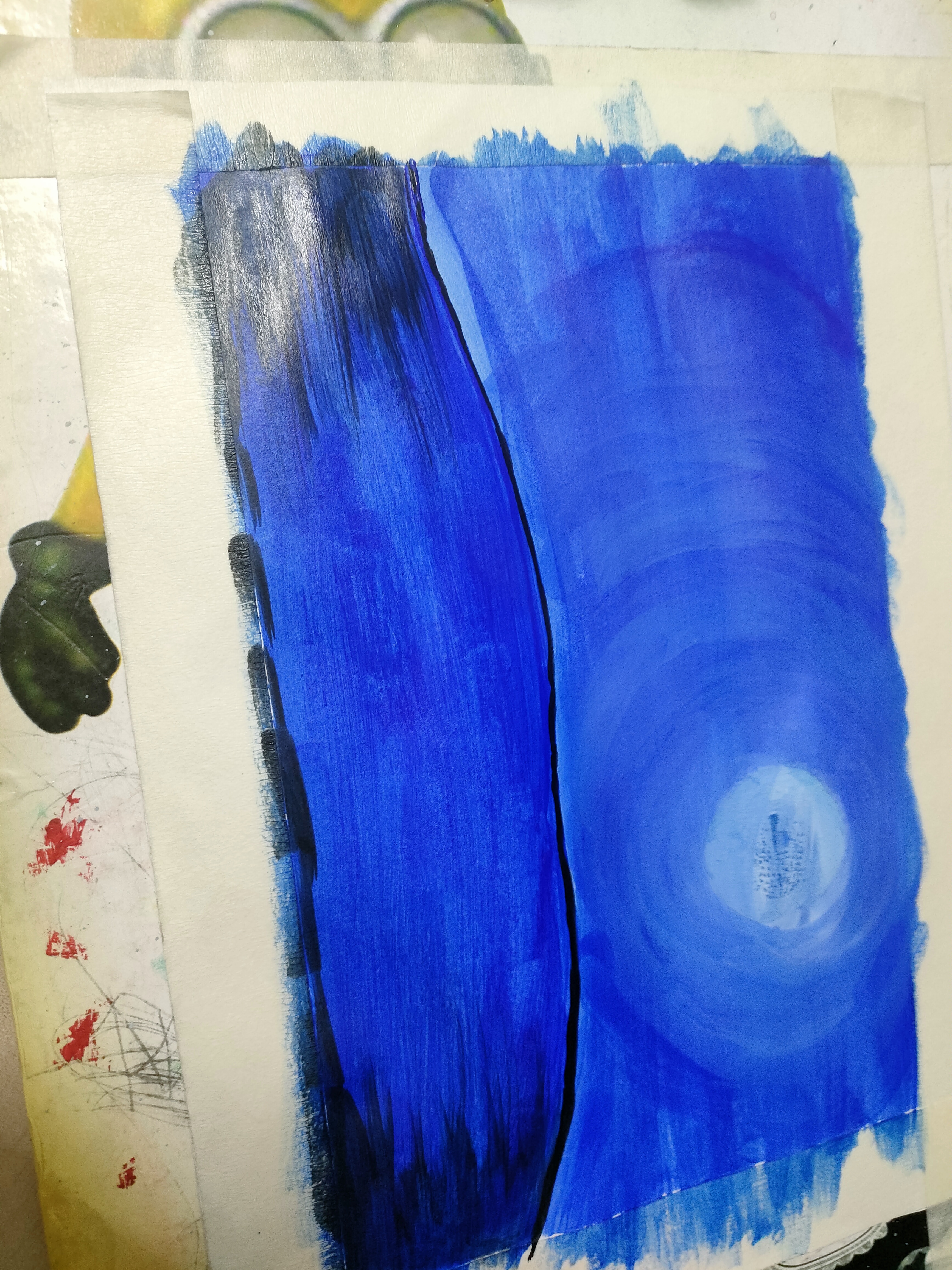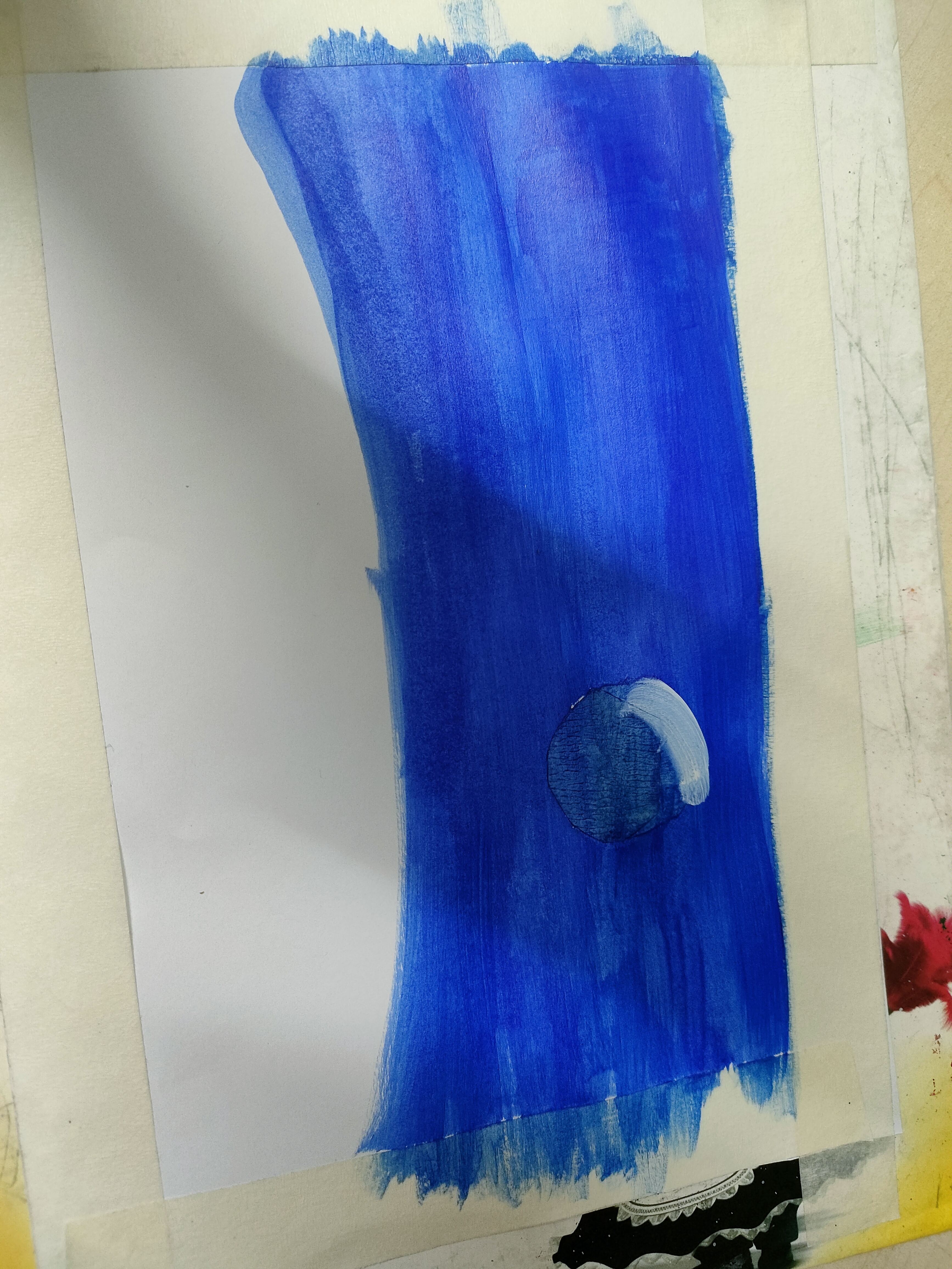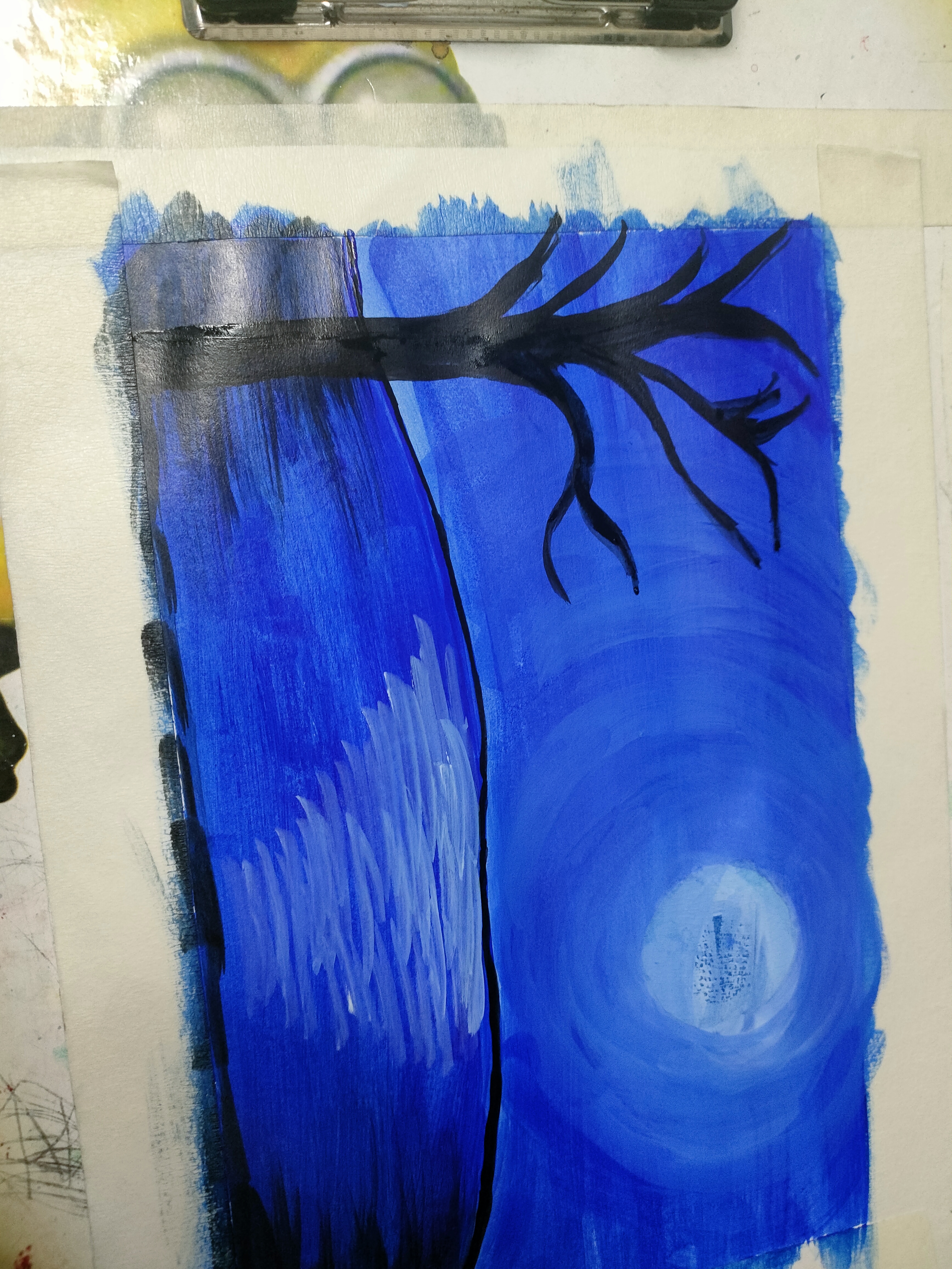 প্রথমে একটি পেপারের চারপাশে মাসকিন টেপ লাগিয়ে নিয়েছি। উপরের অংশে নীল কালারের রং করেছি।এখন সাদা রং দিয়ে নীল কালারের উপর এভাবে গোলগোল ঘুরিয়ে রং করেছি।