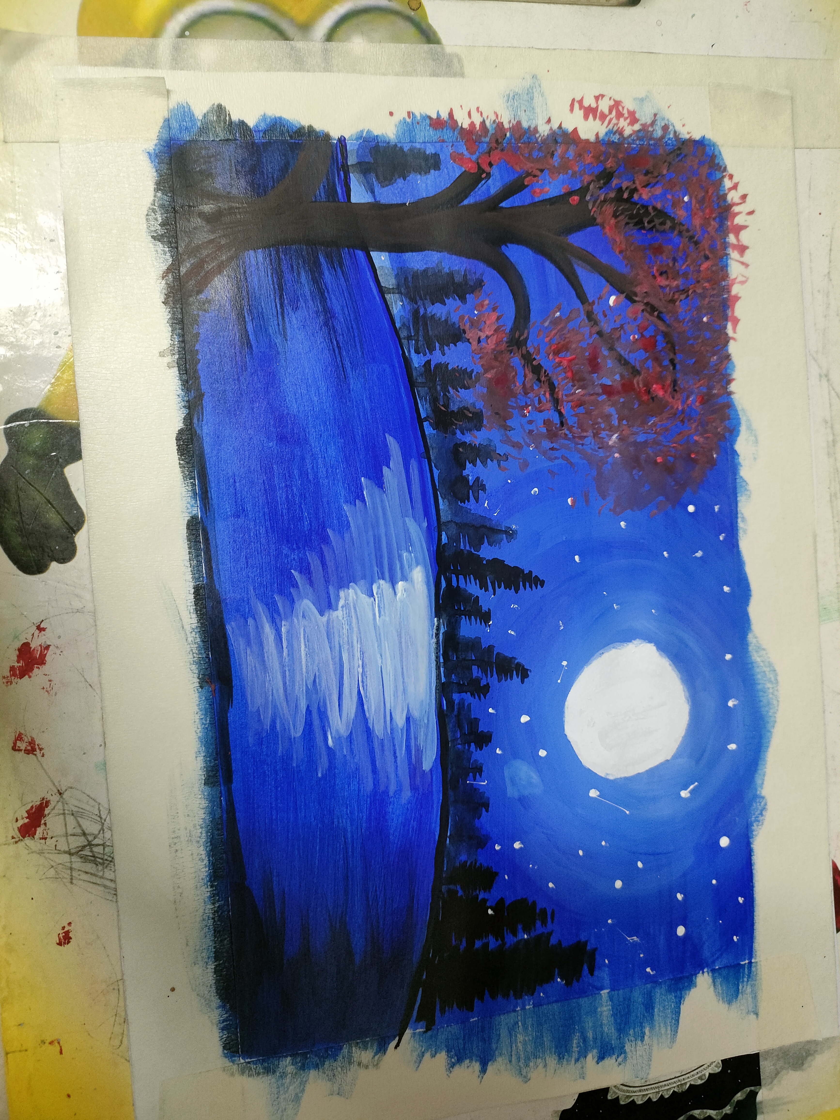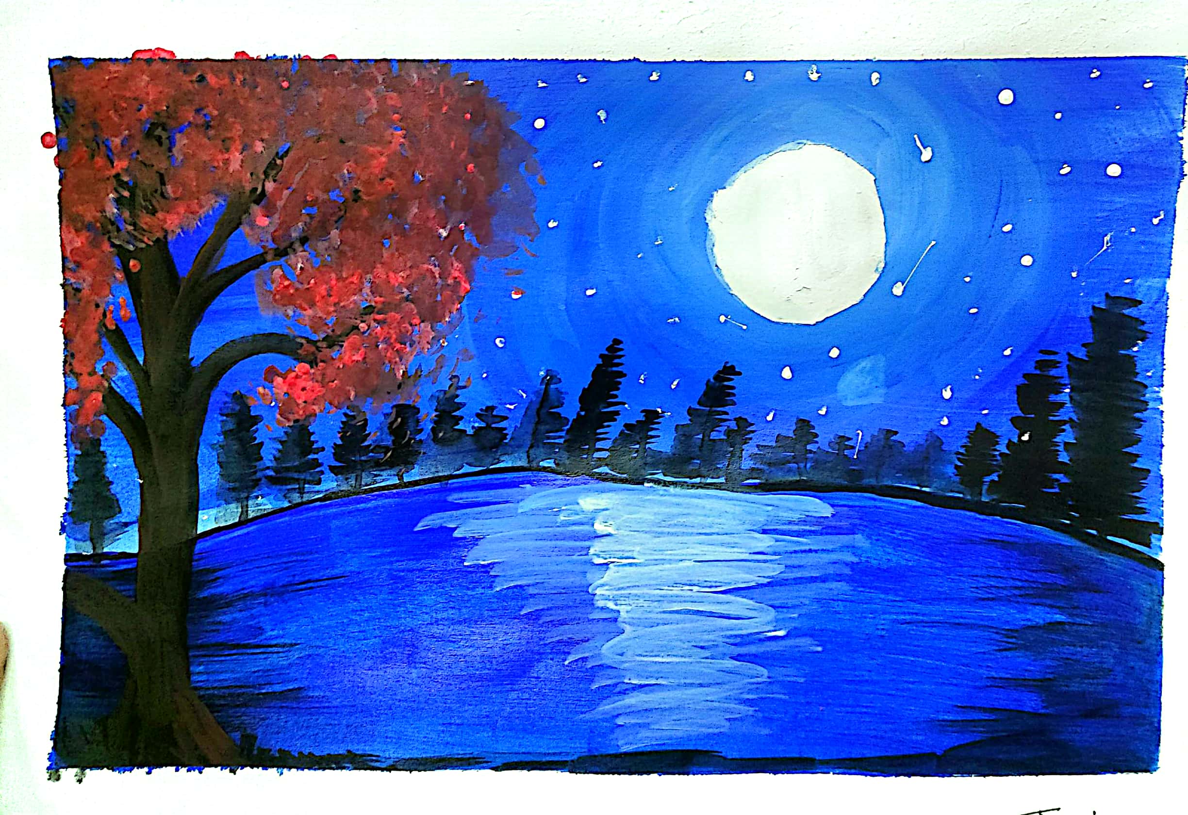 এখন গাছে লাল লাল কিছু ফুল এঁকেছি এবং চাঁদটিকে সাদা রং করেছি। পানিতে আরো কিছু সাদা রং করেছি।