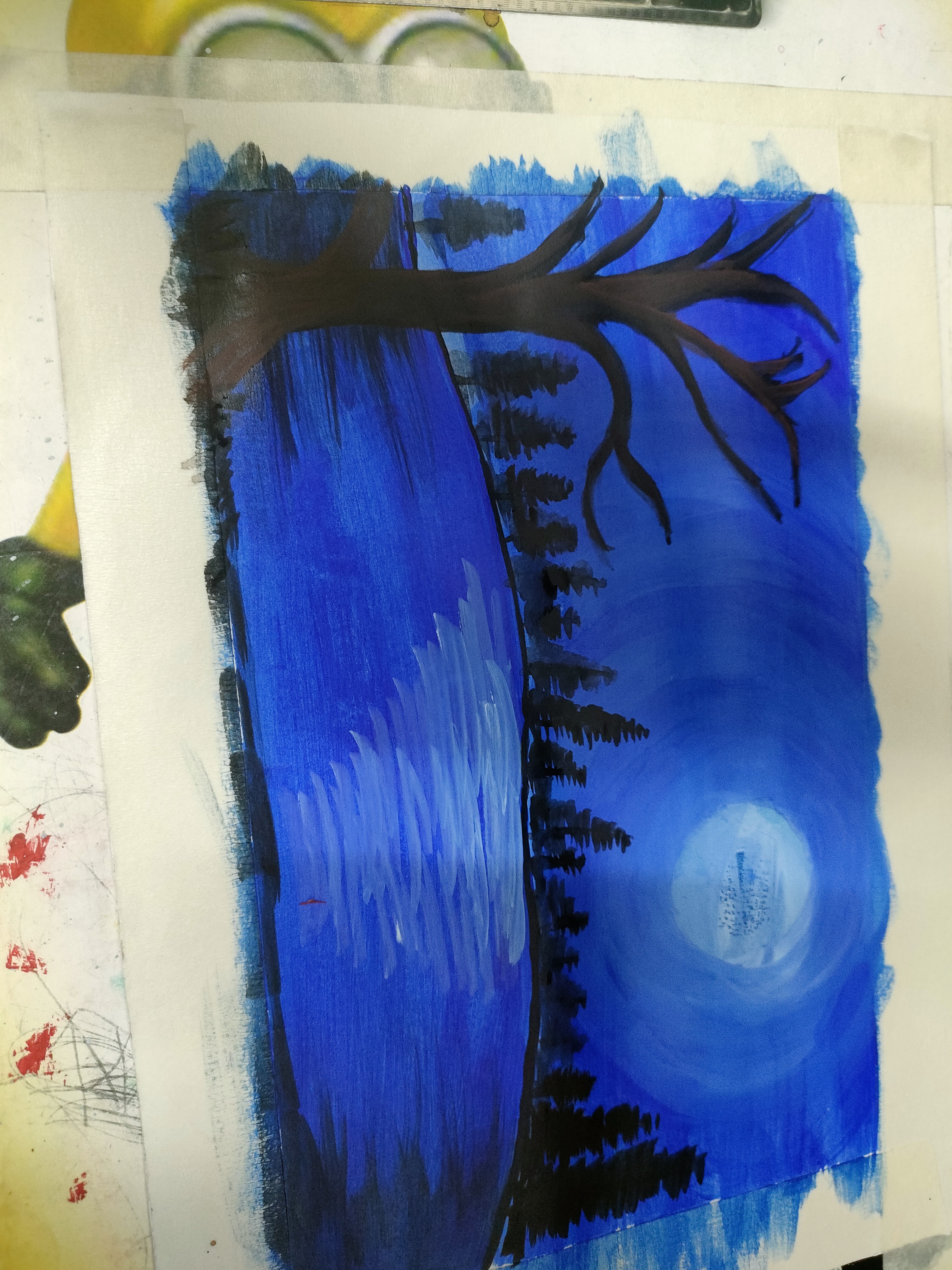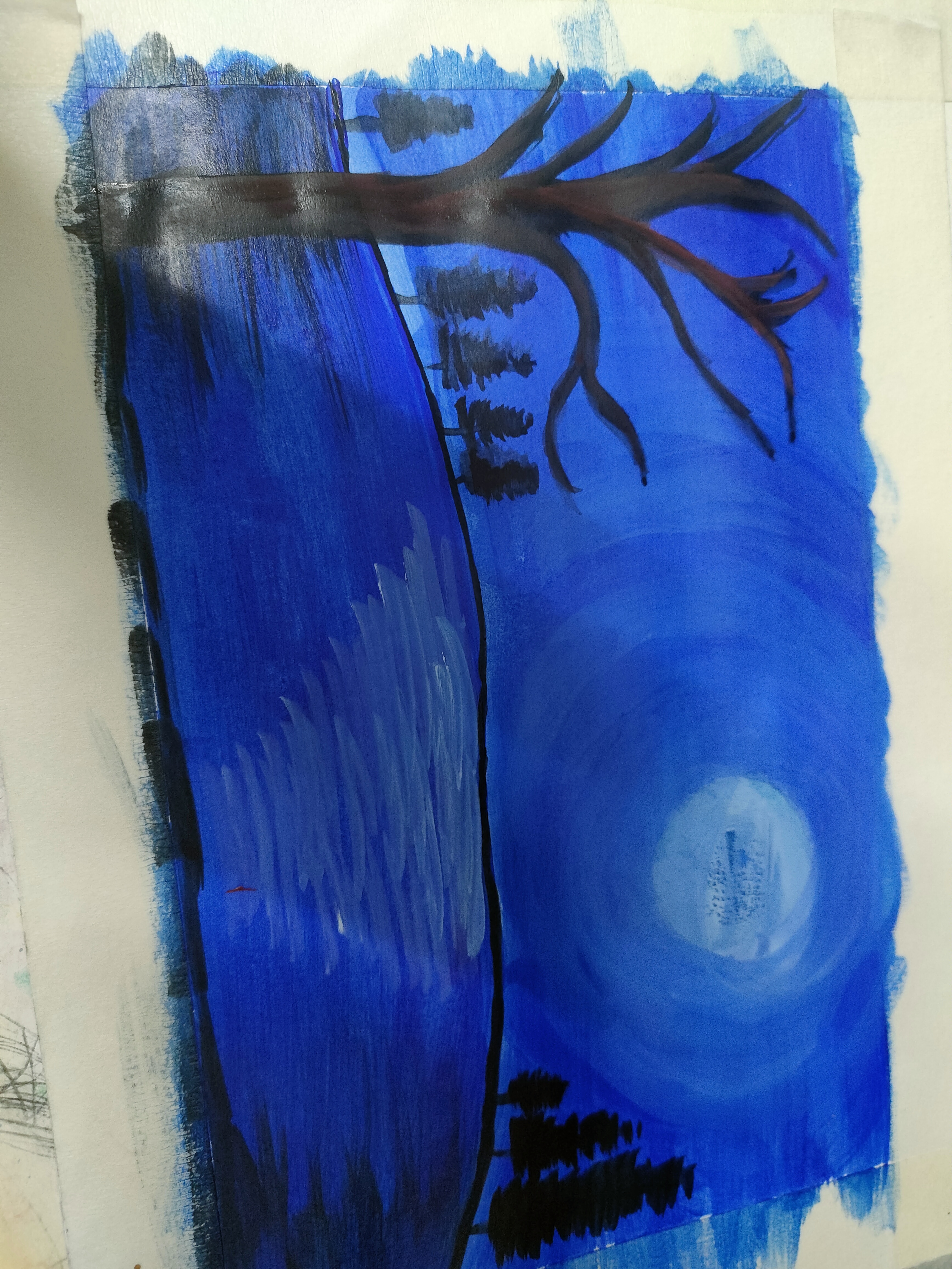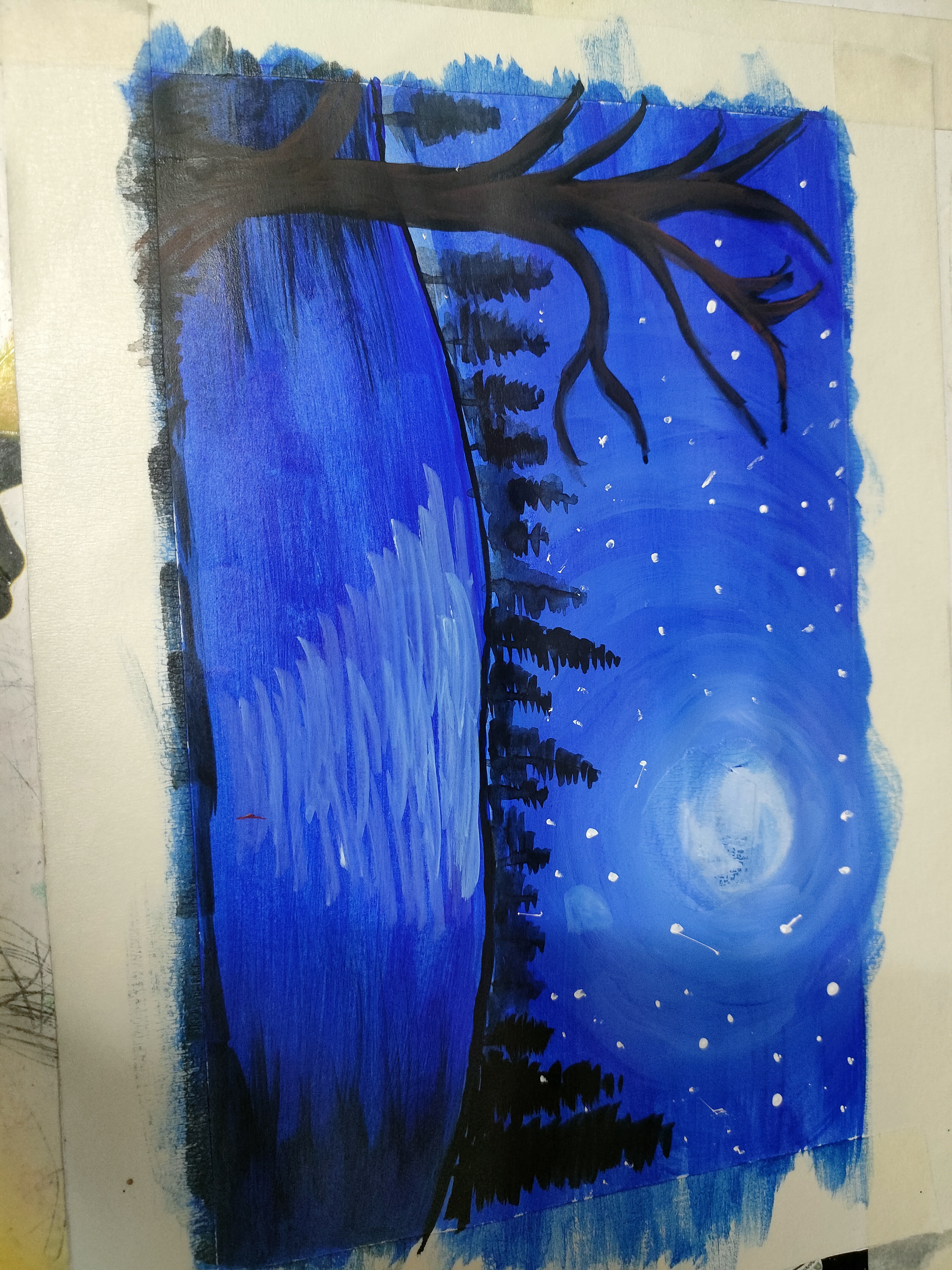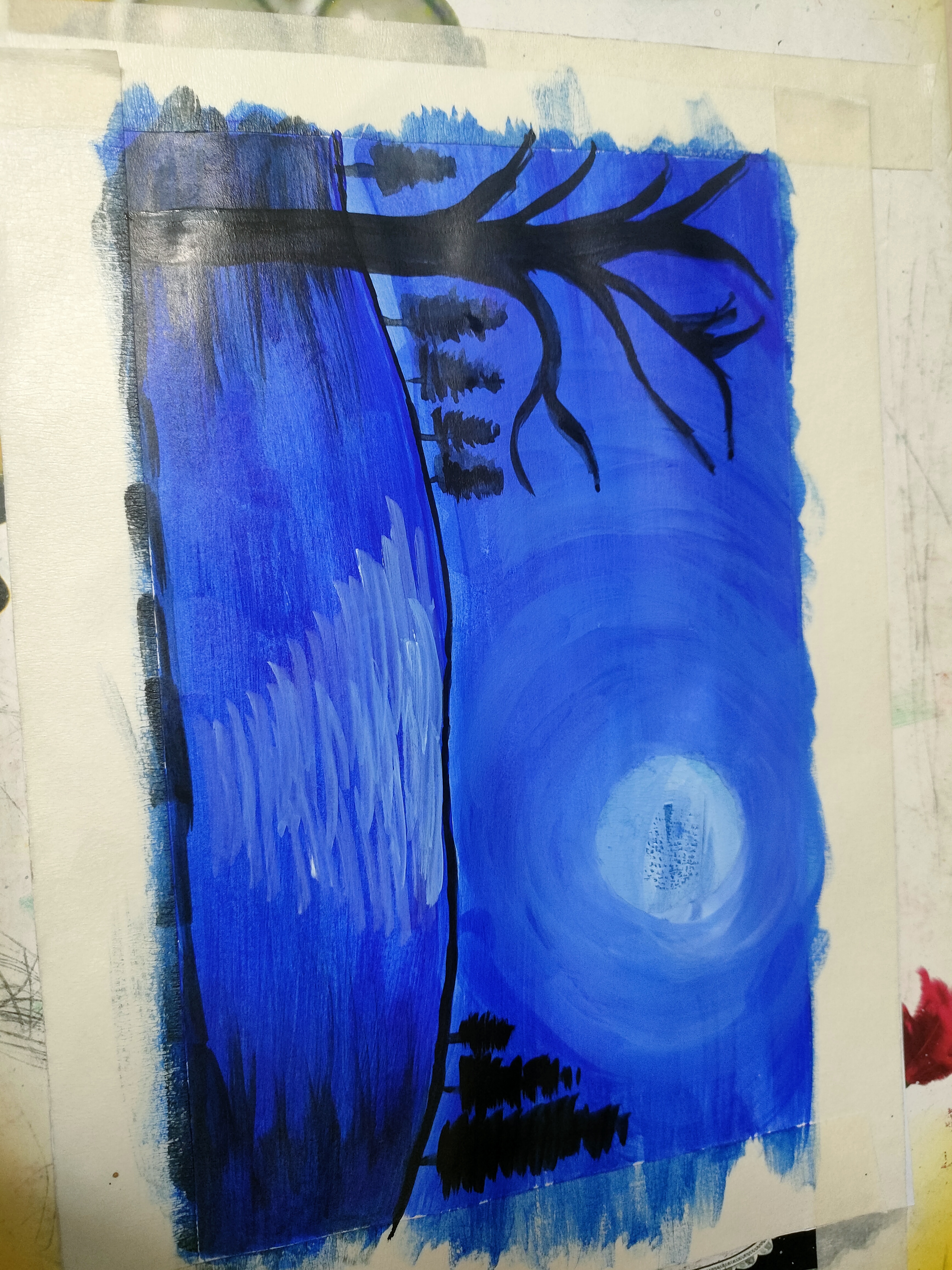 এখন পানিতে চাঁদের আলো দেখানোর জন্য সাদা রং করেছি এবং বাম সাইডে একটি গাছের গোড়া এঁকেছি।