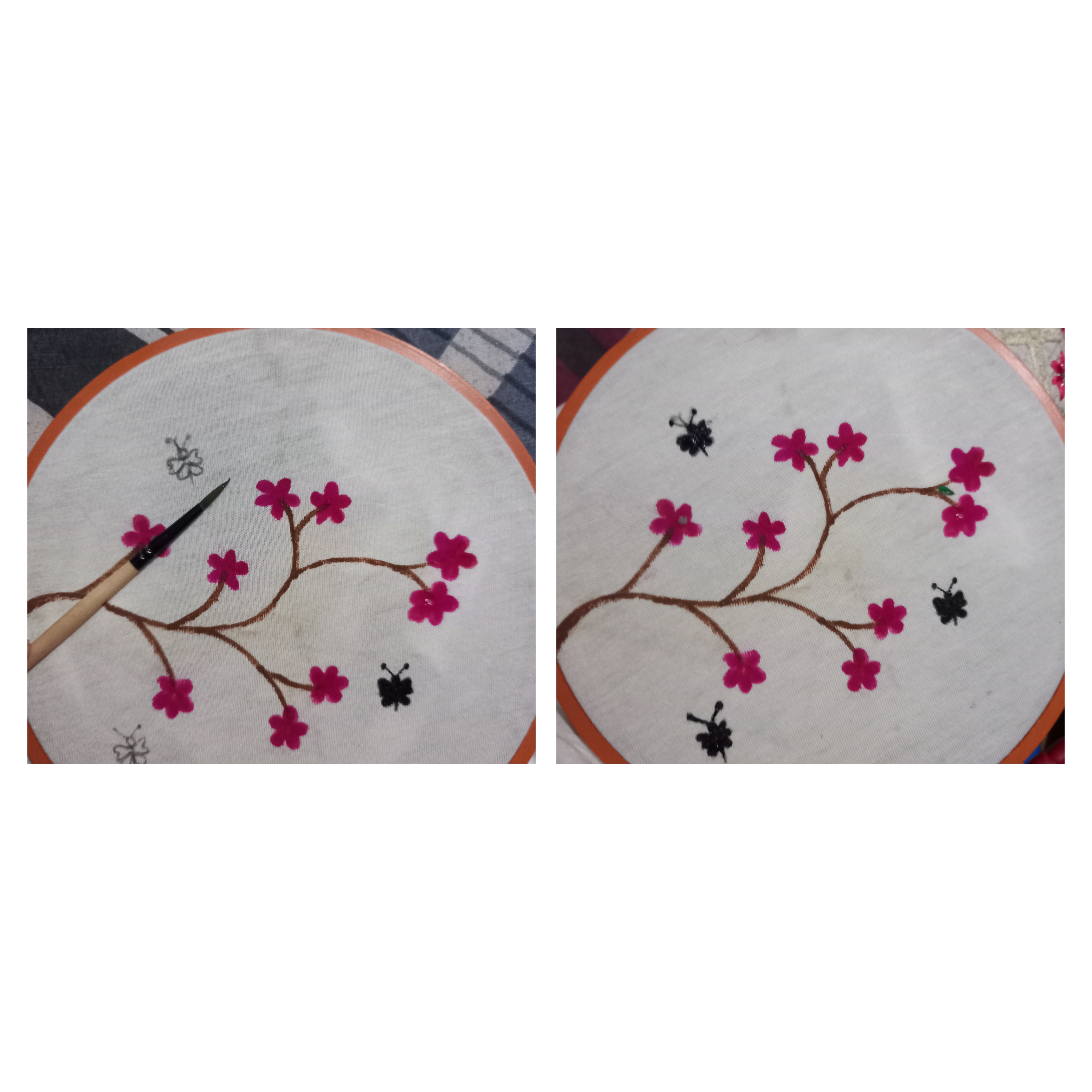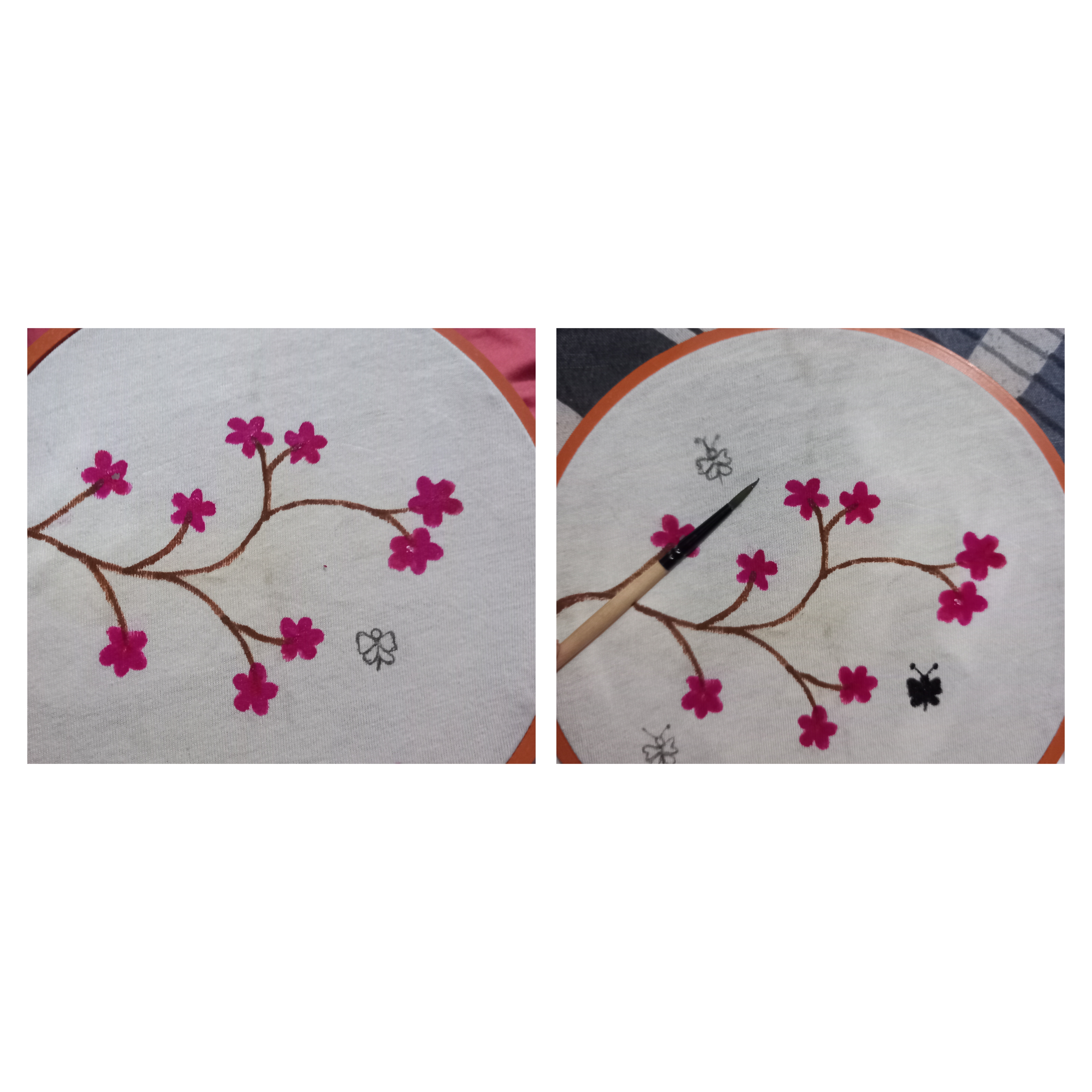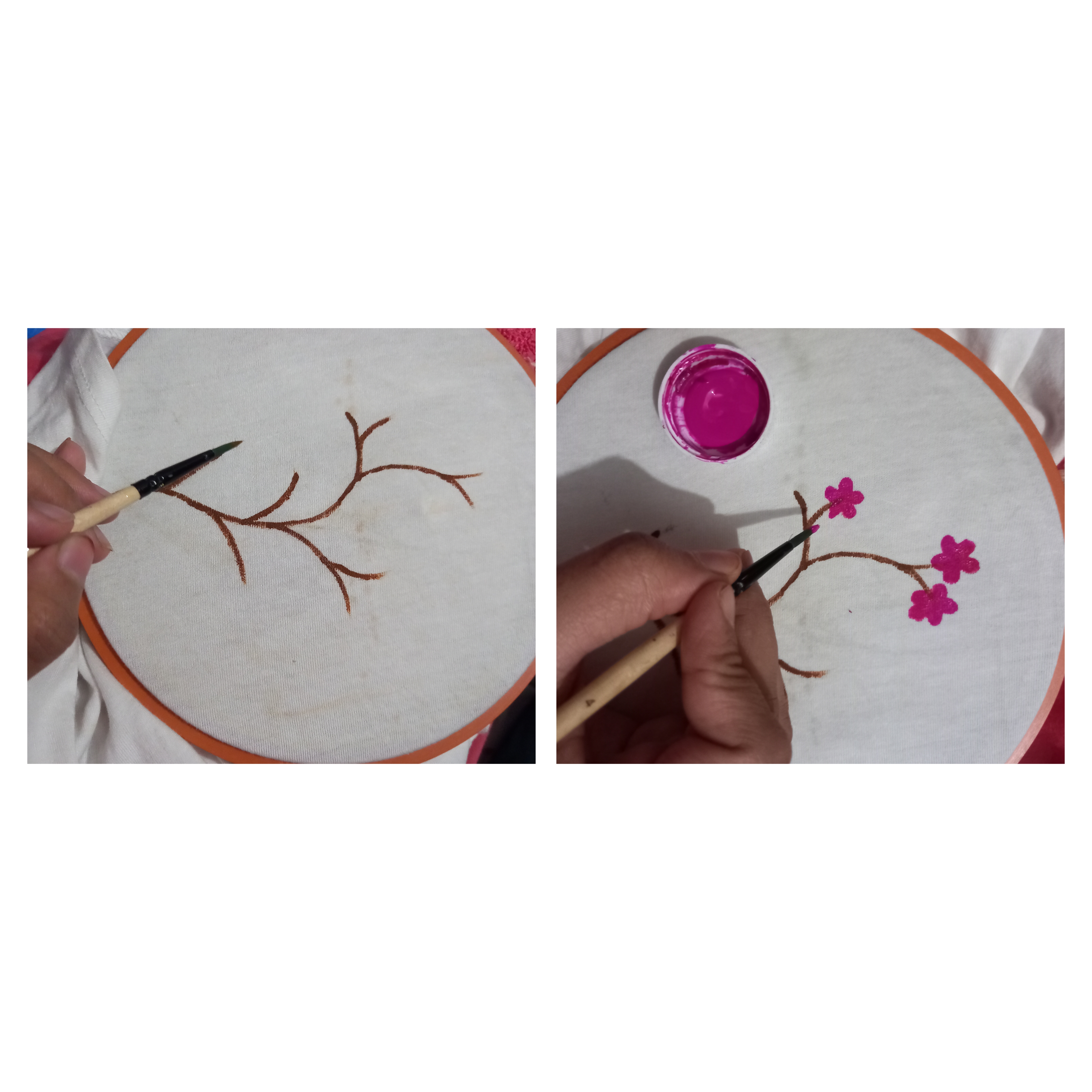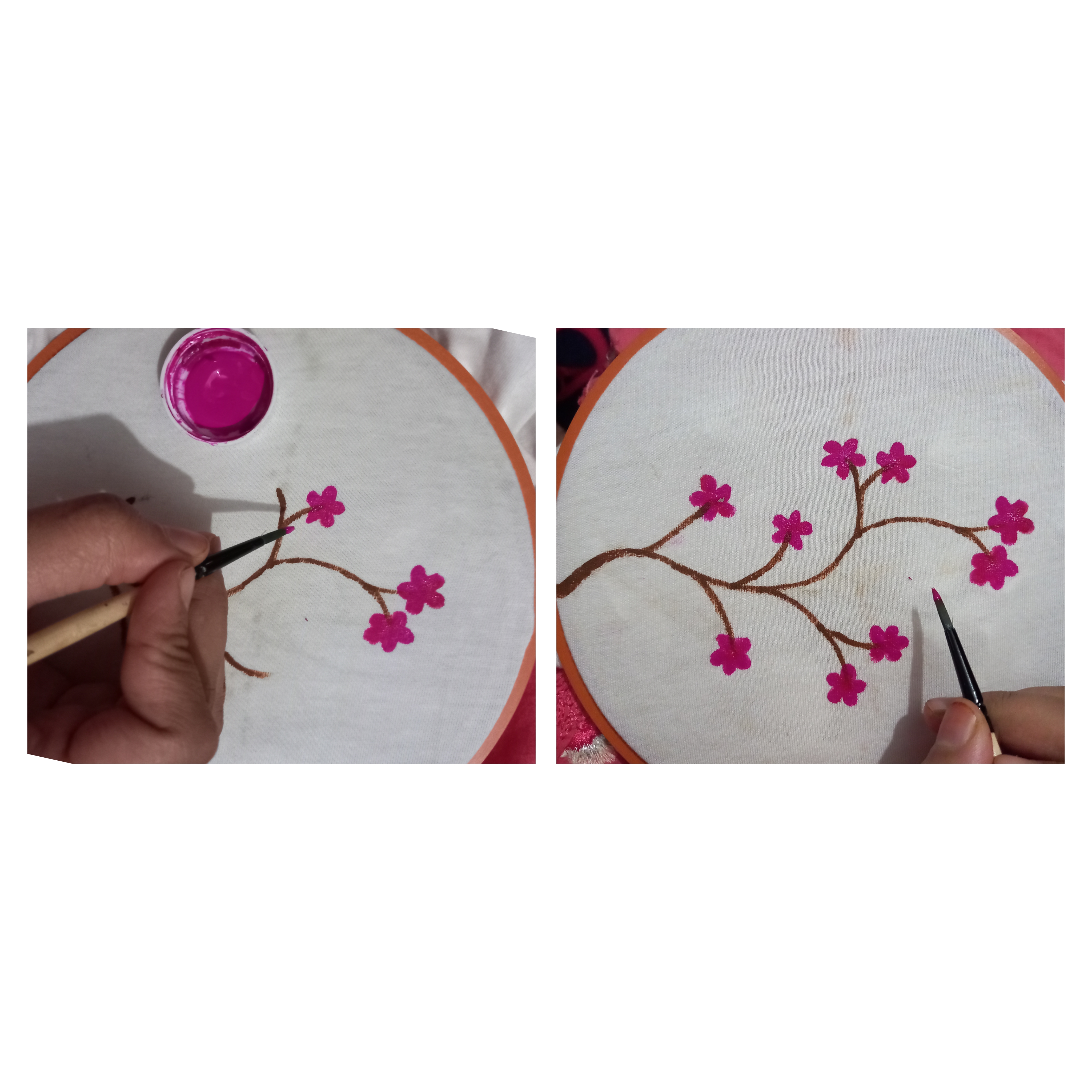 - এরপর রং তুলি দিয়ে গাছের ডাল পেন্সিলের দাগের উপর একে নিলাম এবং গোলাপি রঙ দিয়ে ফুল আঁকা শুরু করলাম।