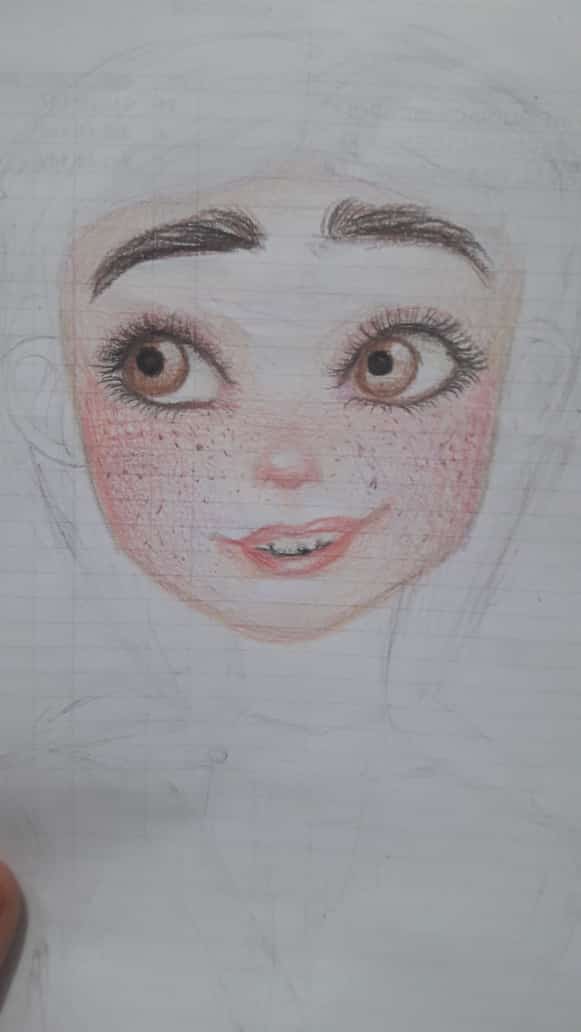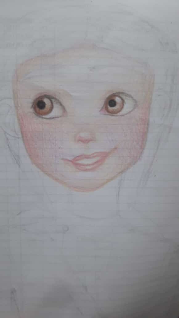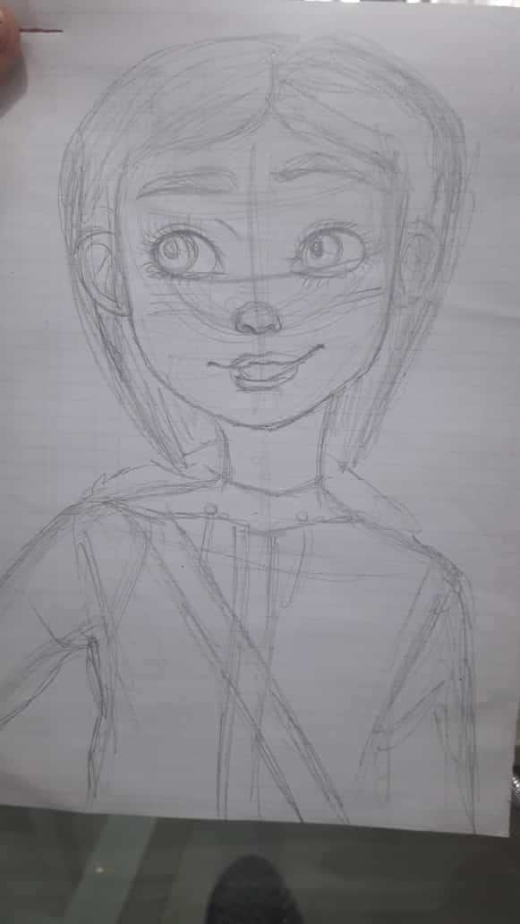 Luego borro esas lineas y queda como ven en la foto, ahí recién empiezo a darle color a los ojos y a la cara.