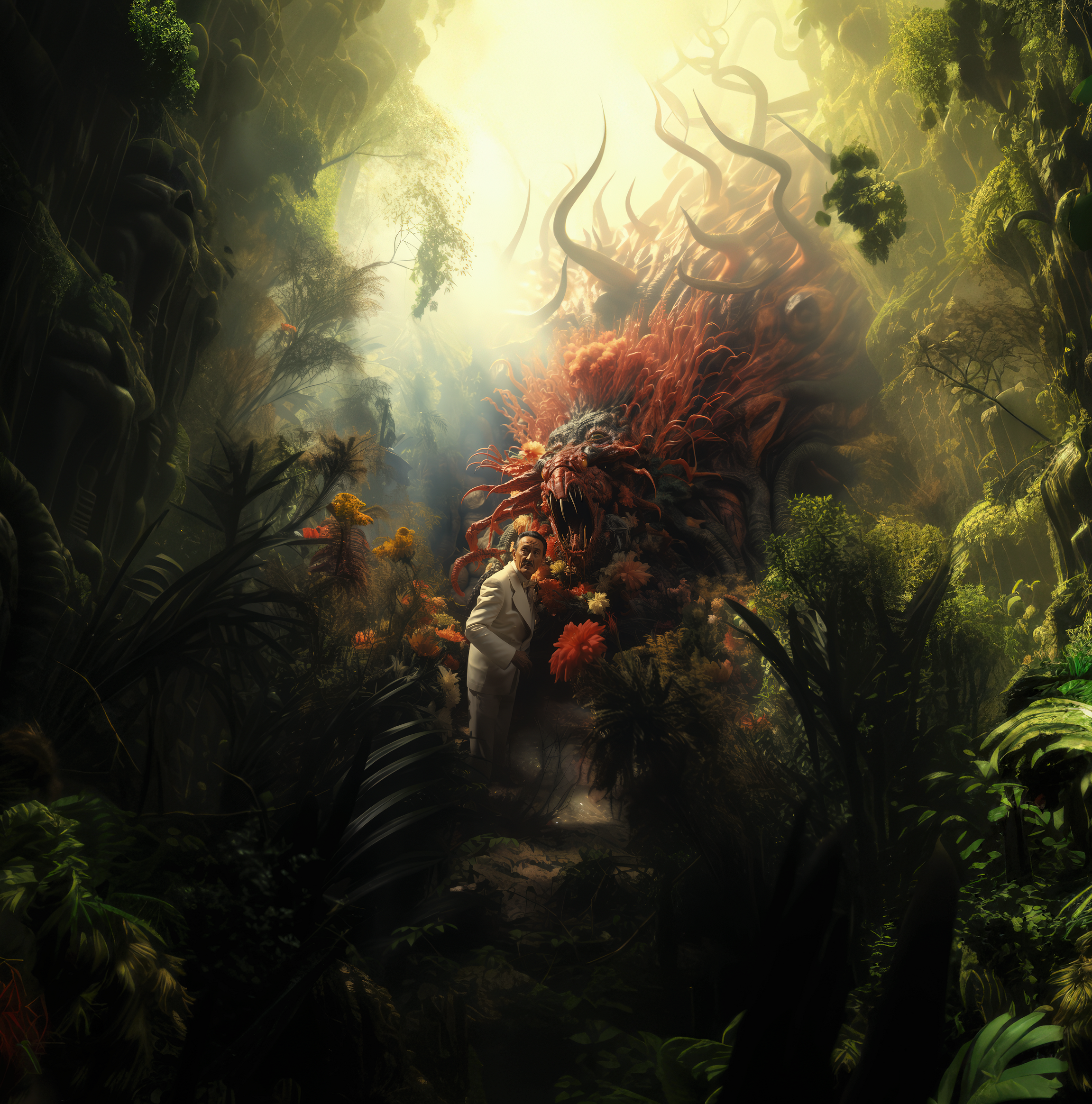 在阴影的帷幕下,我们发现了创造的又一个谜团。一种源于混沌的生物。它的形态模糊,是一团旋转、变形的物质——我们将其称为“万花动物”。它的众多胳膊和腿让人联想到茂密的森林丛林,杂乱地突出。它是大自然奇妙变幻的不协调舞蹈。