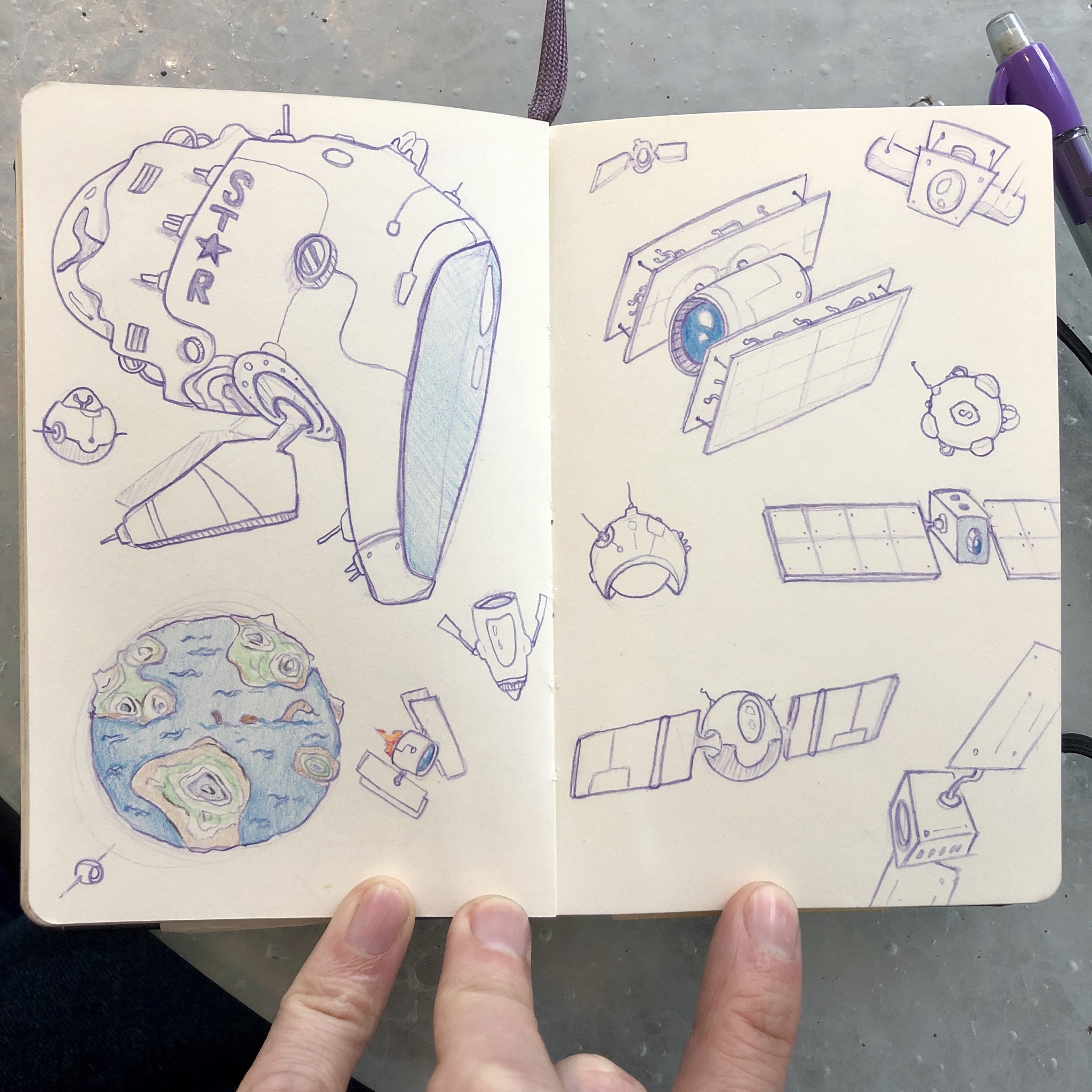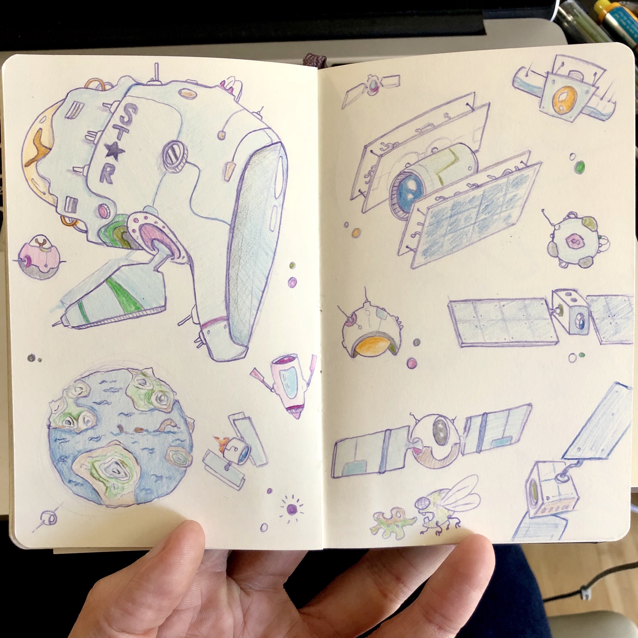 Lots of satellites here! And a little alien guy :D And a cute small planet, too ! I like that it has a lot of water :)