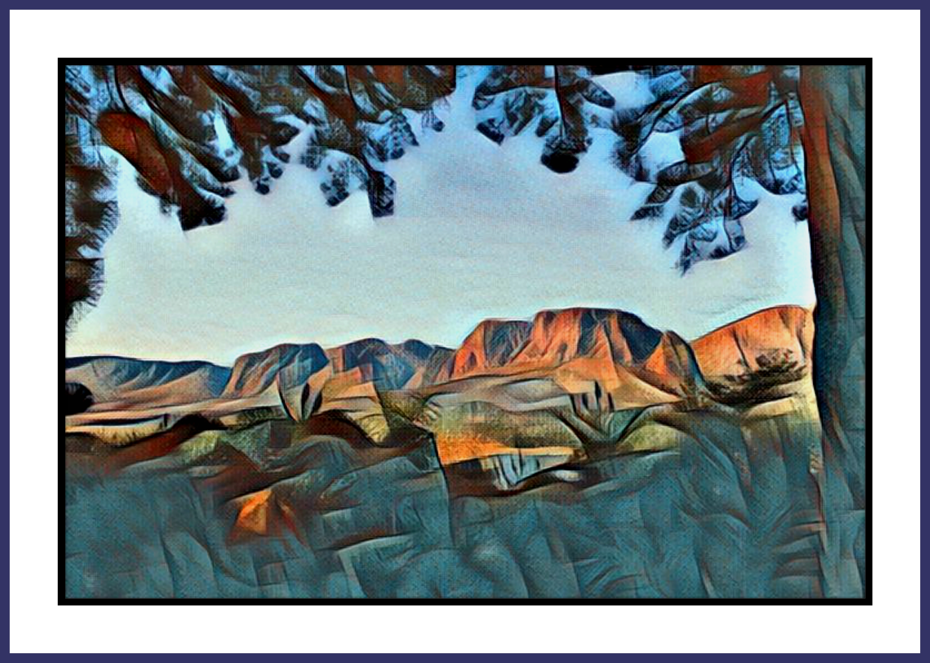 Mountain View - was created from one of my photos in the Western Cape, South Africa. Love the way the pine trees frame the view of the mountain range, in the distance.