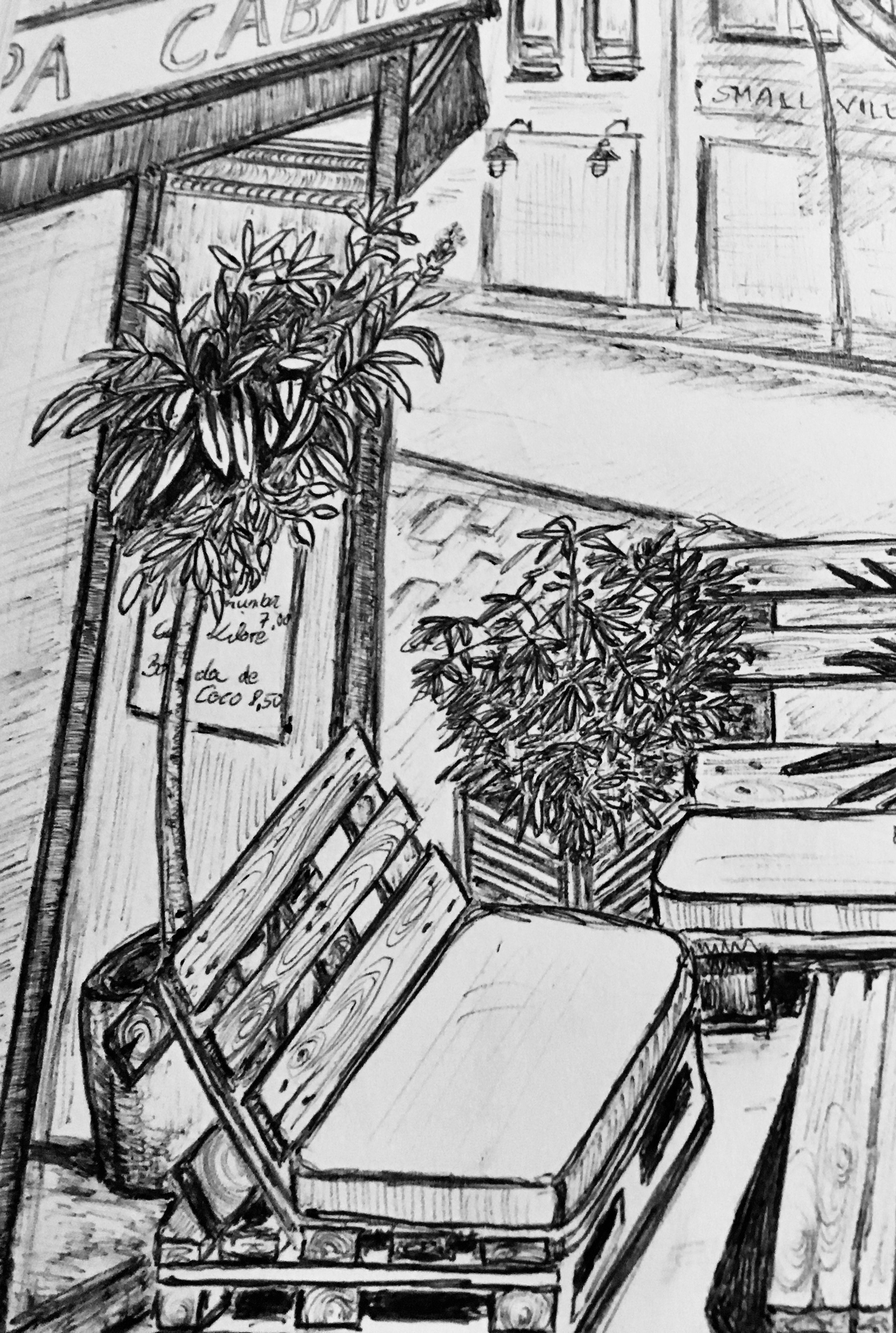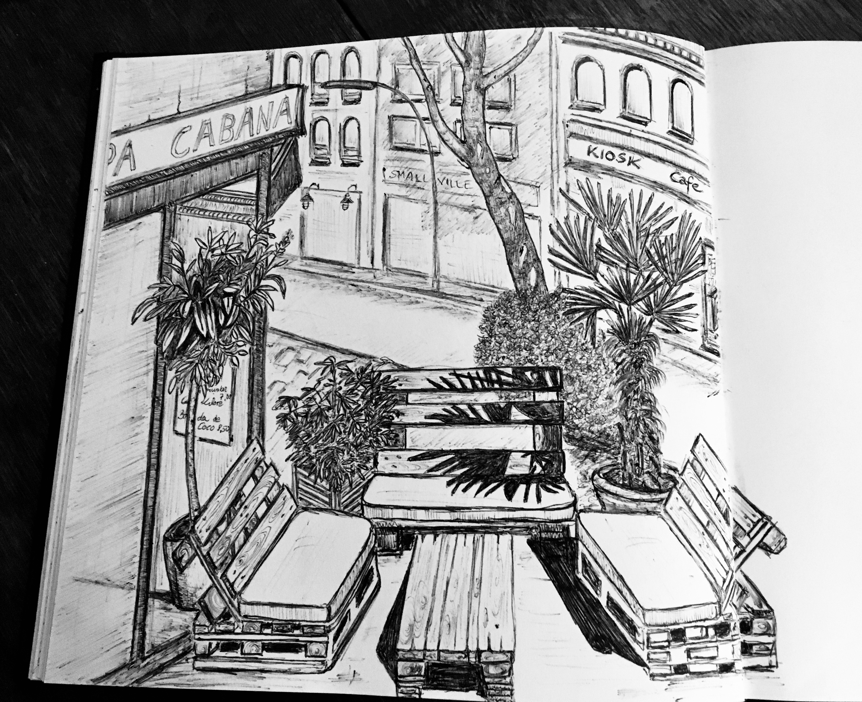 I took it at hand again very shortly after our return, when the summer was still here in full splendour. I decided for a walk through the neighbourhood and sat outside in front of a cocktail bar, which also was open during the day. Already with the intention to draw something, I chose my place and enjoyed in sunshine the slow completion of my sketch.