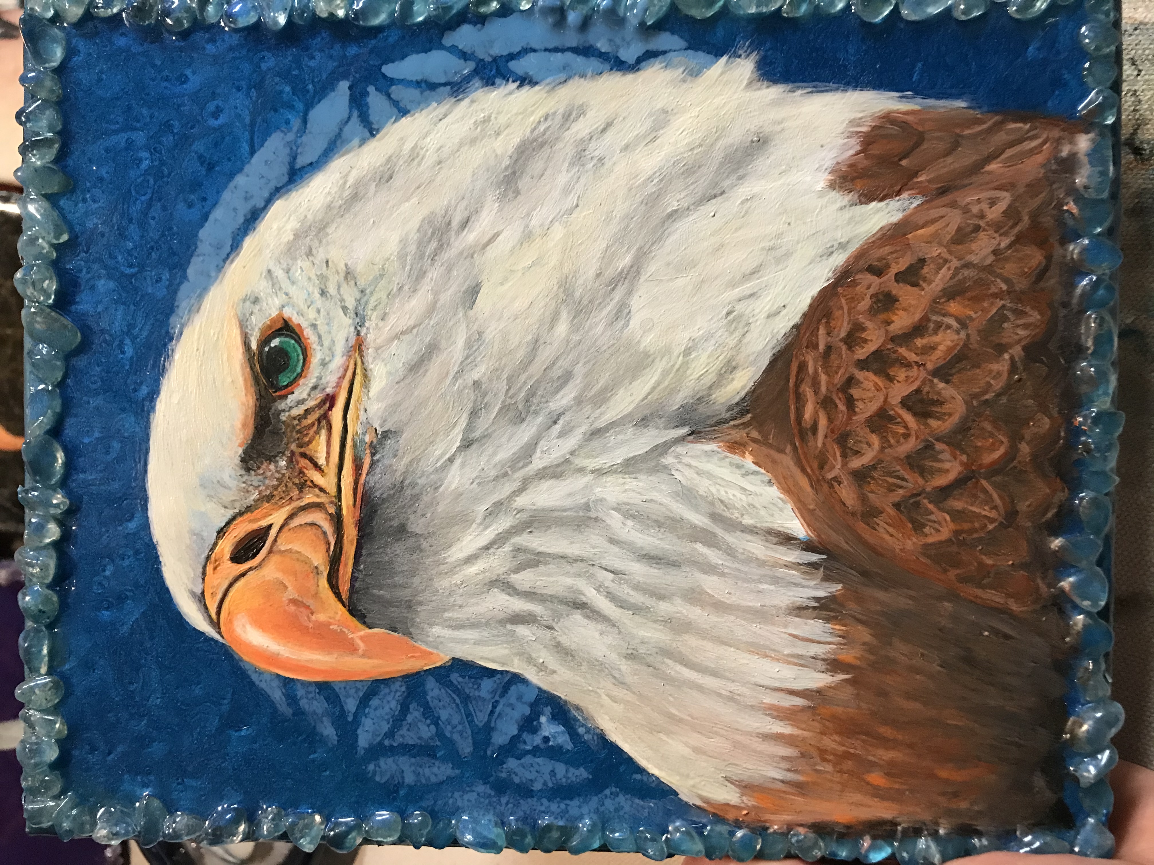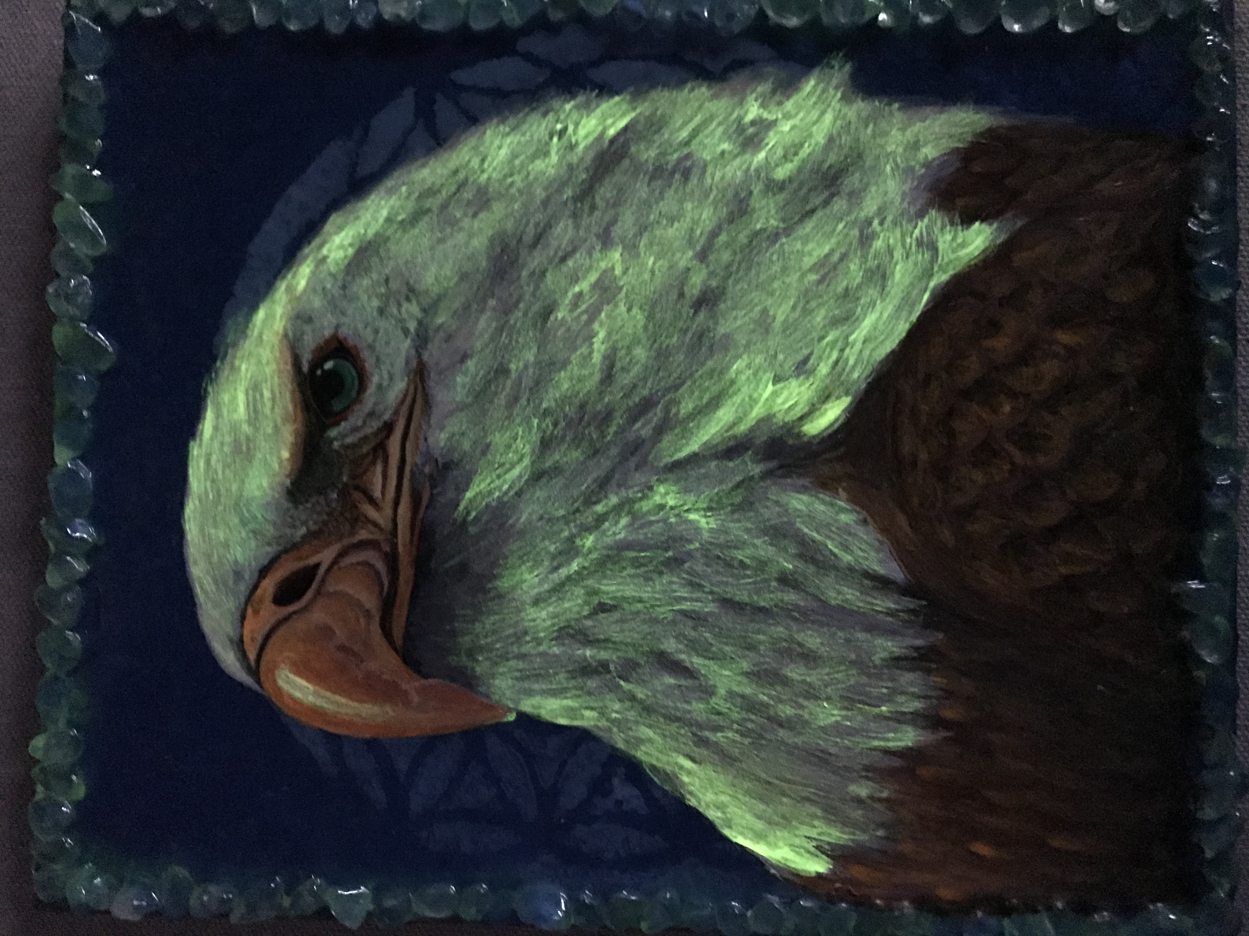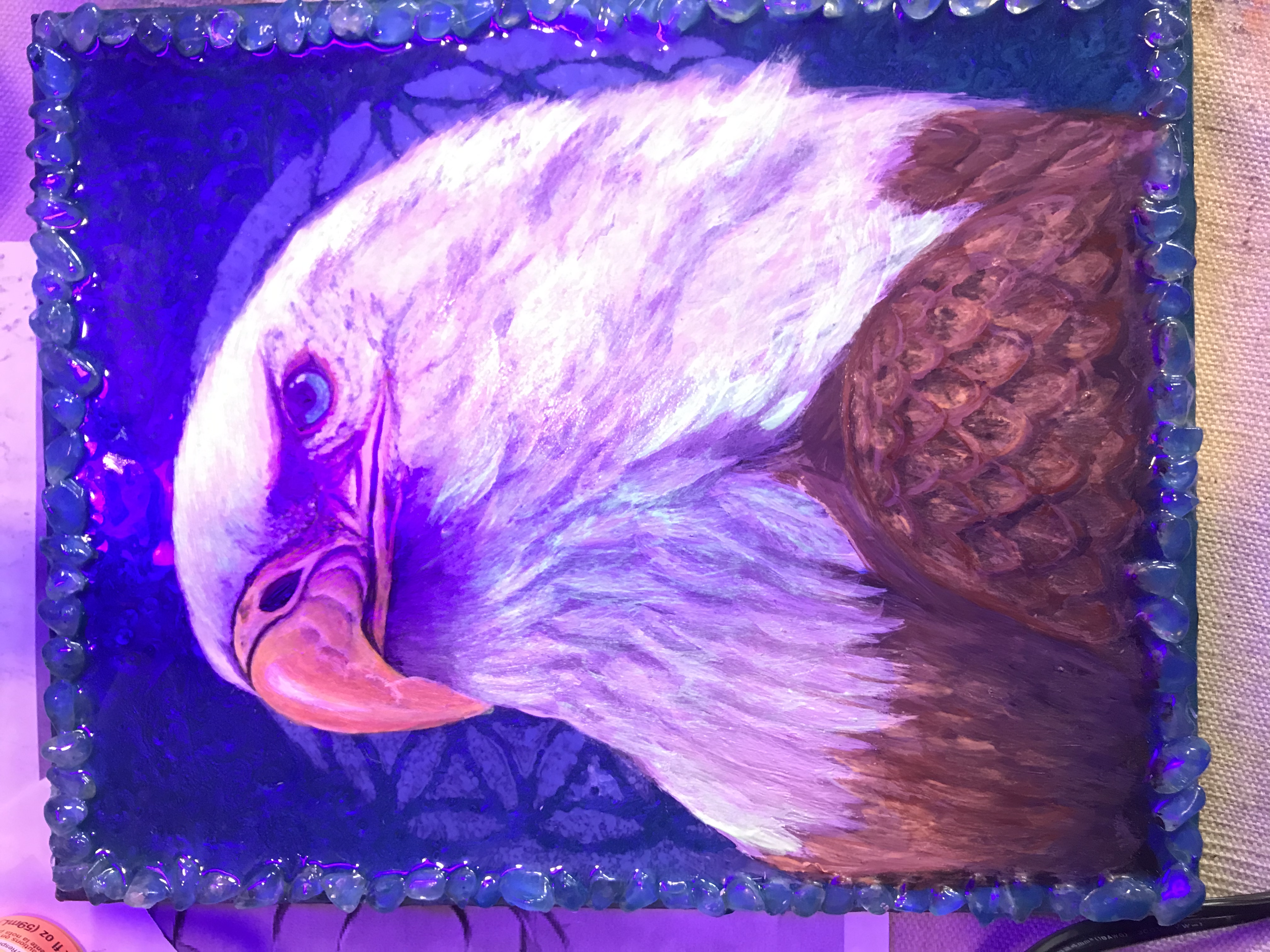 (8 x10 acrylic on canvas covered with resin and glow in the dark effect, the border was covered with clear quartz crystals)