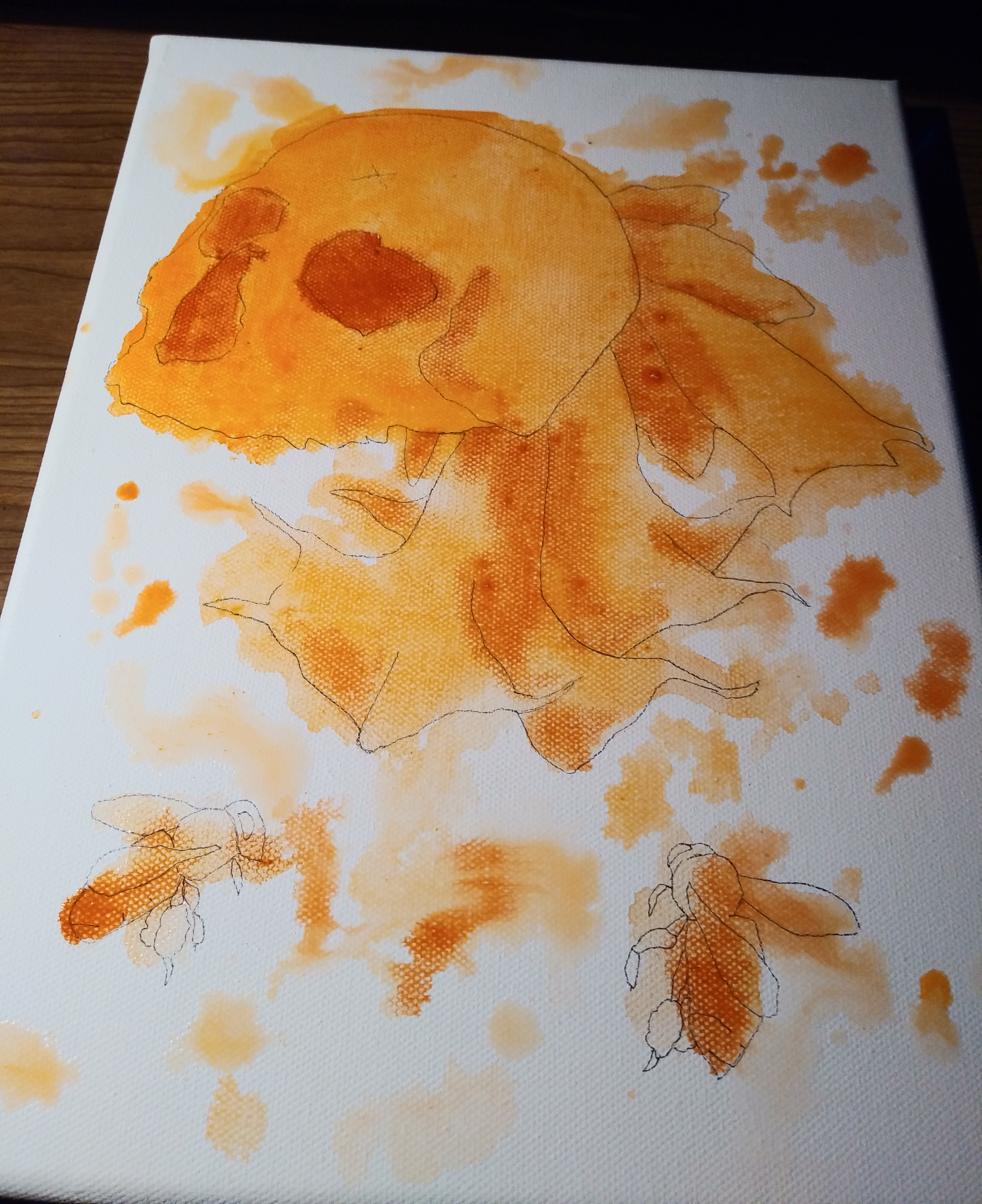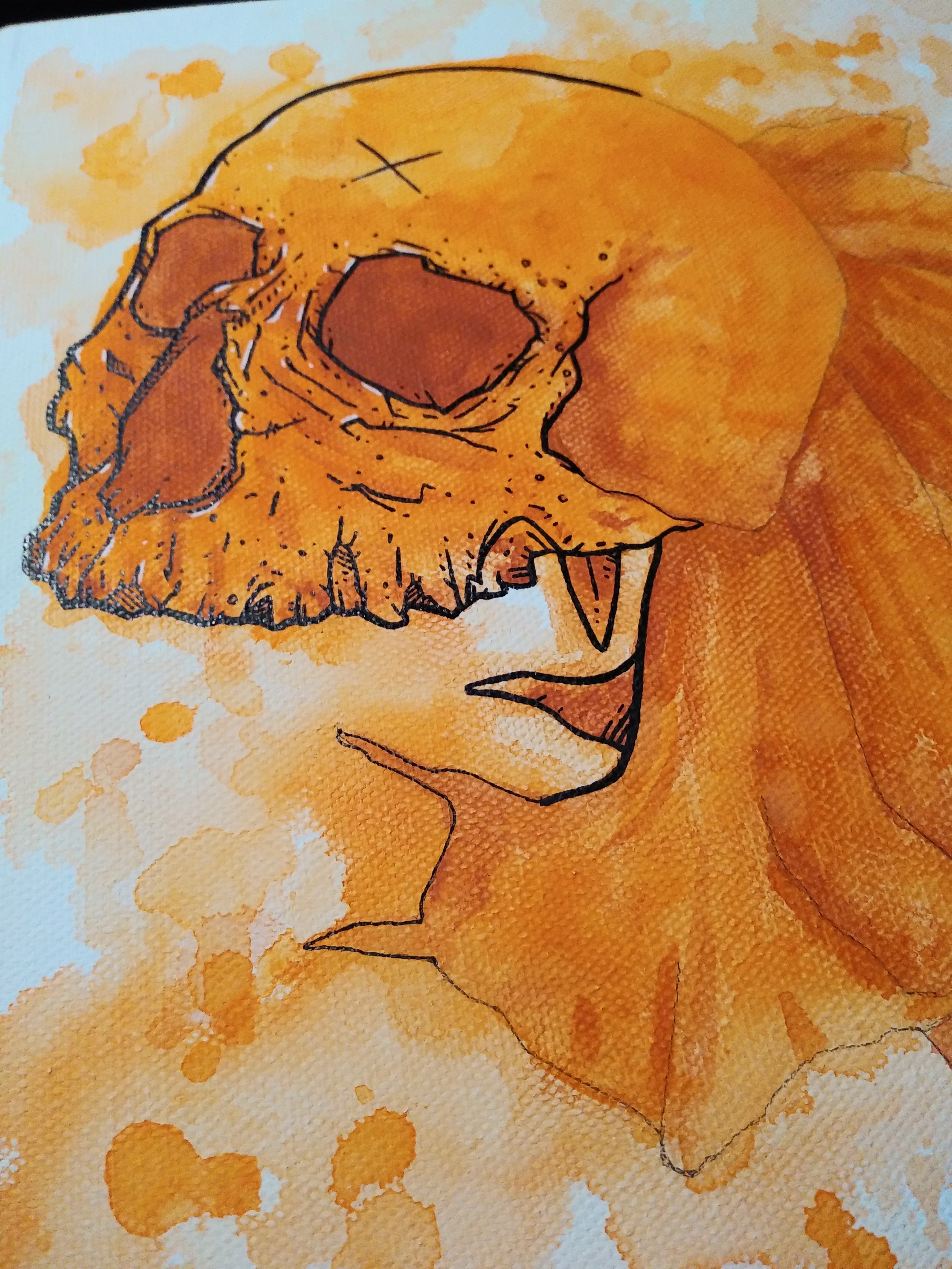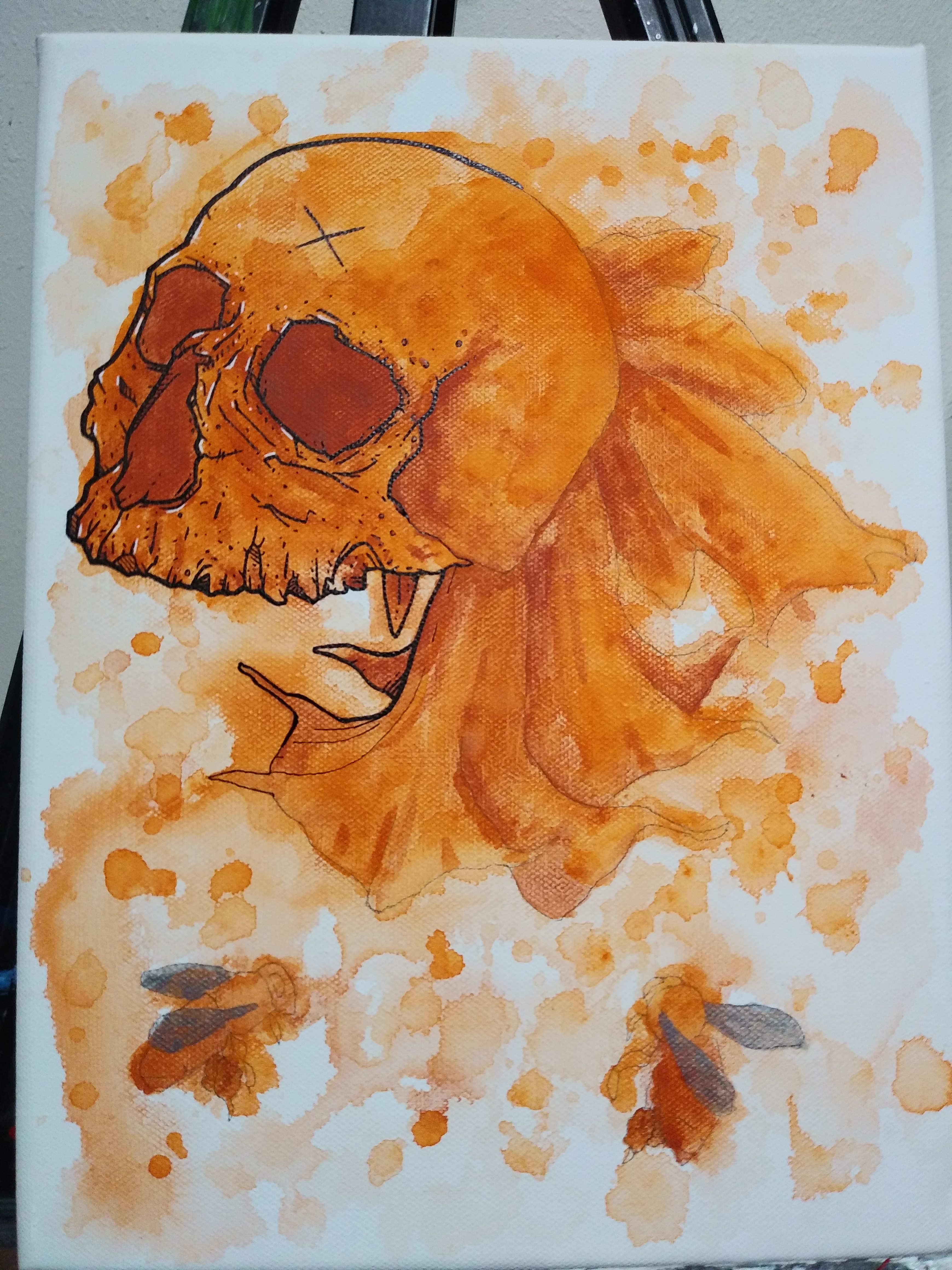 Here's a bit of the art process for the orange skull painting I recently did. I think the flowers on the left are called Angel's Trumpets, or something along those lines haha. I really like how vibrant this one came out, I think it's going to make a really cool sticker once I get around to truing it into one. Just a quick little art update while I finish up the line-work on the food paintings :)