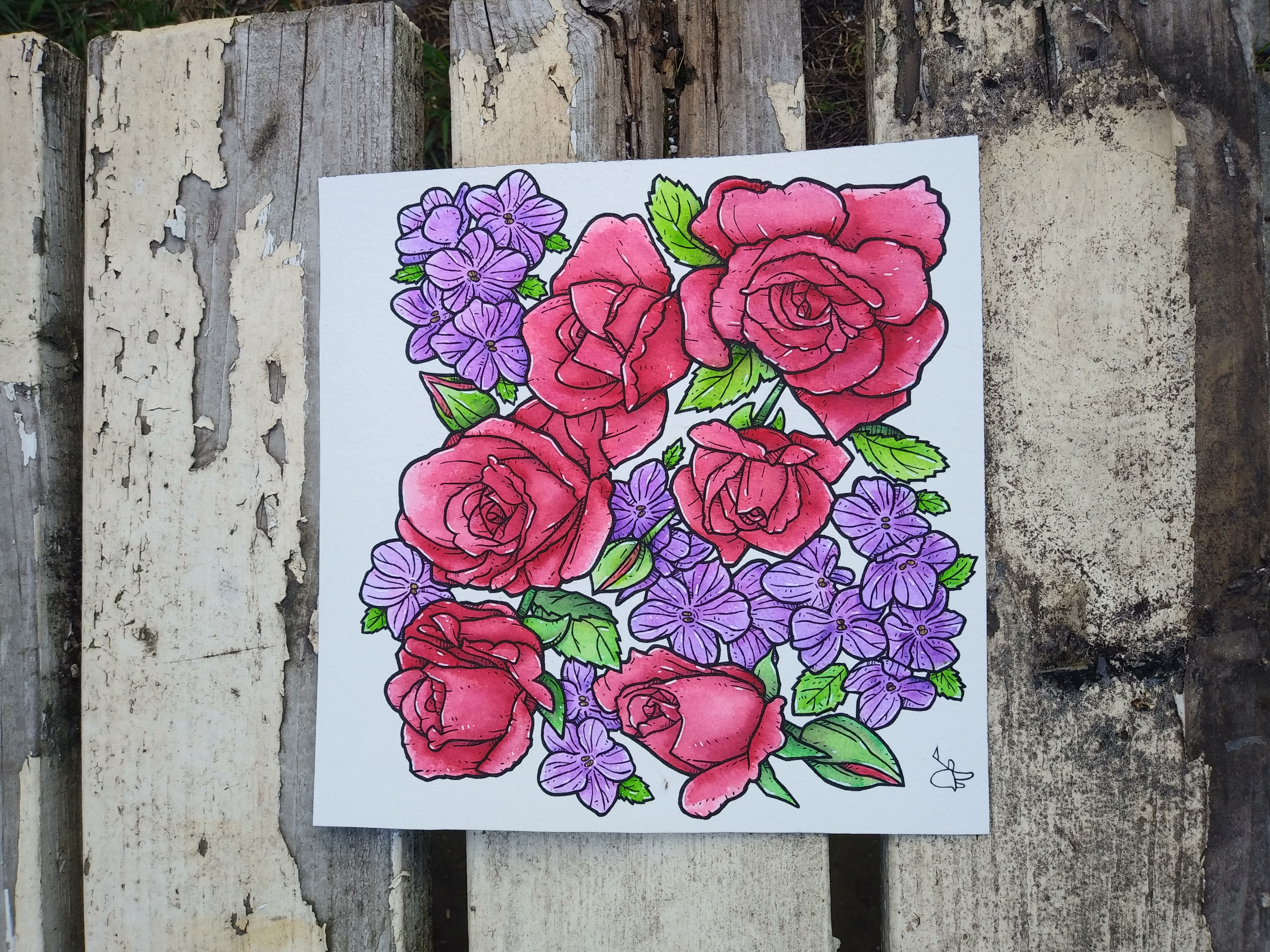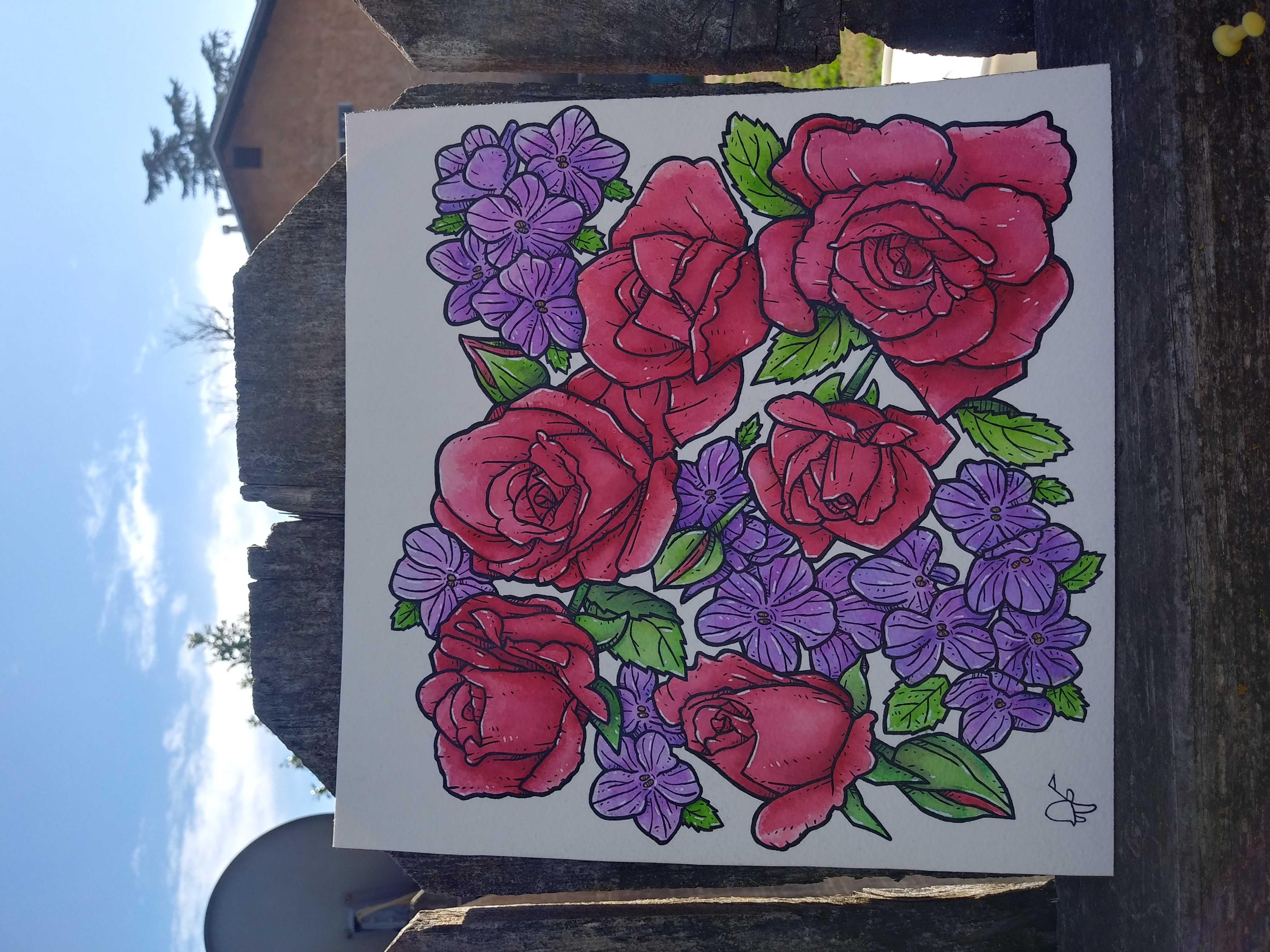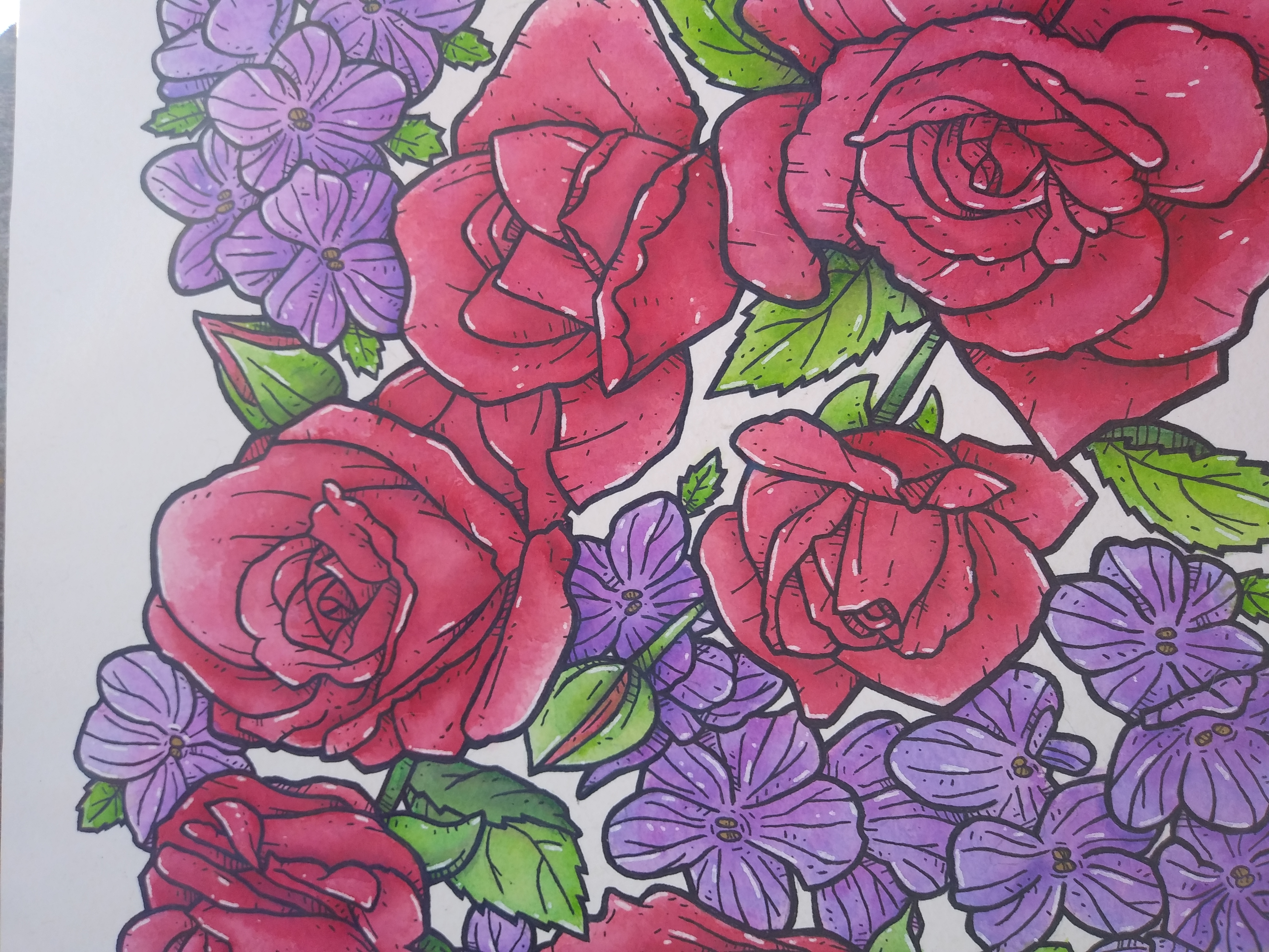 Its been a while since I have posted anything here, and I thought I have enough art all stuffed about my room I might as well put a bit up. This is a water color/ ink that I did for a friend. Well watercolor markers to be exact :) He had the idea for the roses and purple flowers ( the name totally escapes me at the moment) so it was up to me to decide how to lay it all out and whatnot. I figured just fill out the pieces as much as I could without it feeling like it was crowded or anything. Pretty happy how it came out, and now I'm having a hard time sending it to him in the mail hahahahaha.