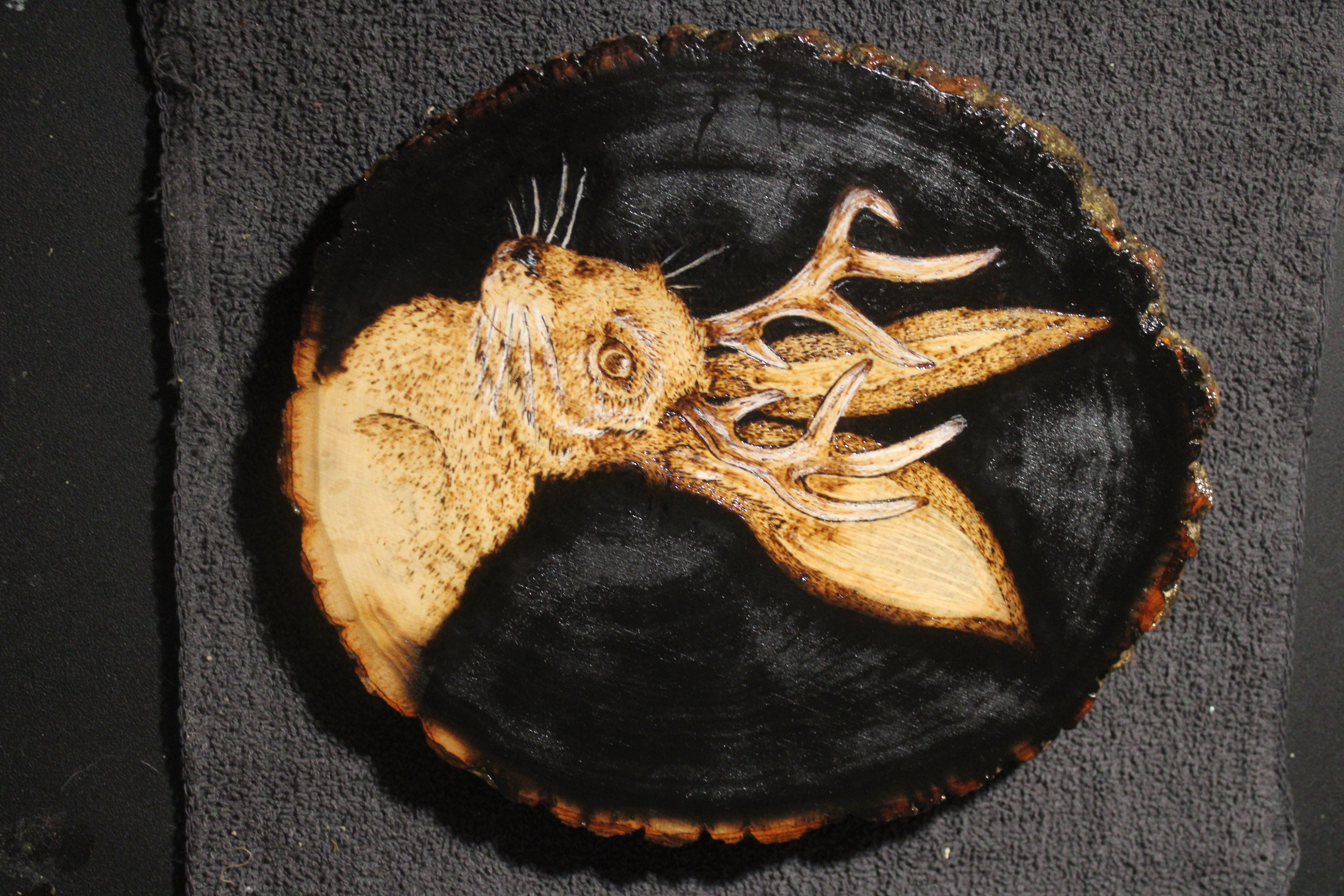 This time up is the most recent creation of the very talented Erika Voss of Scratched & Burnt, a wood burning of a jackalope.