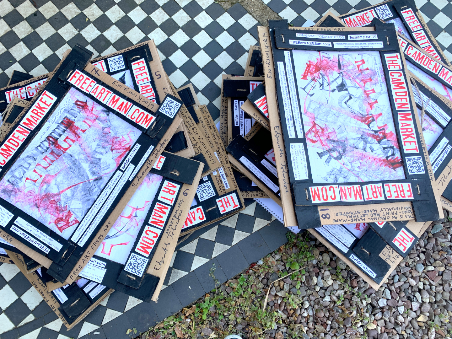 I found these drawings yesterday while clearing out the attic. They're incorrectly labelled as monoprints. I must have made them last year before leaving for Thailand and forgot to process them. Back in the days when I used to sign my work. There's a lot of other drawings and paintings up there that can also be photo'd, videoed and uploaded before going on to the Free Art Frees Art pile. Hand rolled drawings on A4 size office paper 80gsm, PVA glued to cardboard. Made by directly rolling ink onto the paper and stamping the letters. The red letters on the frame are individually hand stamped with Caligo Napthol Red oil based but water soluble printing inks. The backs have pages from the booklet I give out at The Camden Market Free Art Man. The series is titled Aesphonly Framed. Aesphonly is an amalgamtion word of Aesthetic and Phonetic Only.