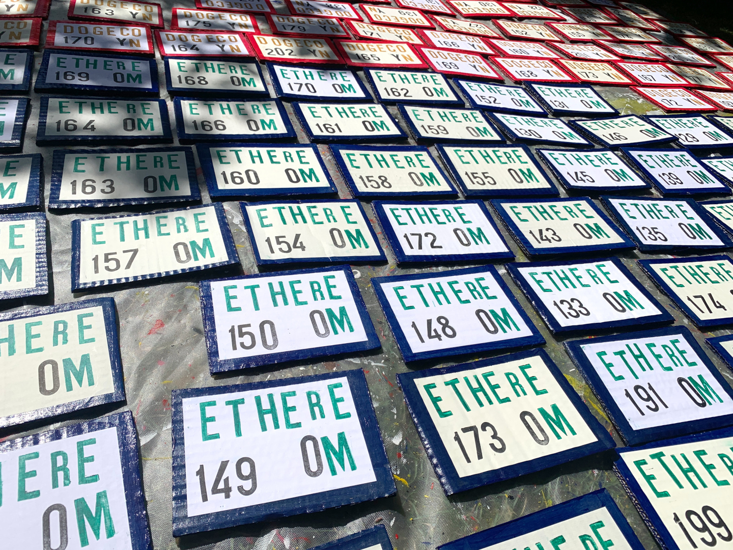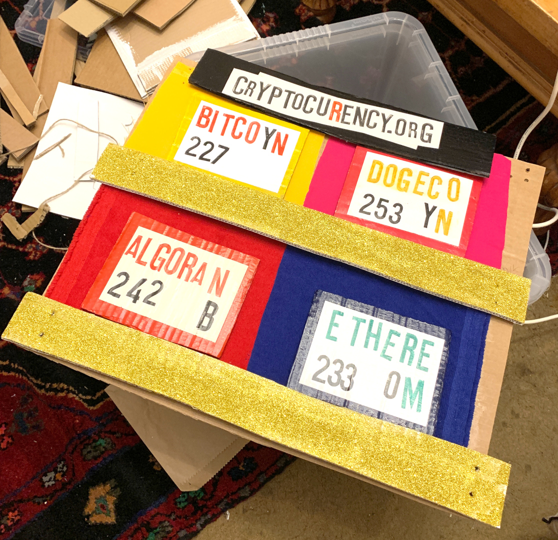 Each card is numbered on the front and detailed video and photographic records kept publicly online making forgery impossible. The cryptocuRency blockchain. Individually hand stamped, hand made using cardboard left out for the bin collectors round Camden and Muswell Hill. Here's a photo of a half finished super bling display frame.