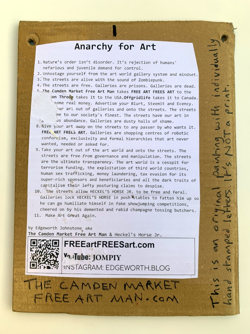 I made this one the first in the series as the manifesto got torn when I left it on some semi-dry glue. I always keep the first of my editions, so thought I might as well keep this one as I don't need to read it. There's holes in the top corners for hanging. Hopefully this will stop people framing them as I don't like frames around artwork, and especially don't like glass being infront. The text of the manifesto is in an earlier post.