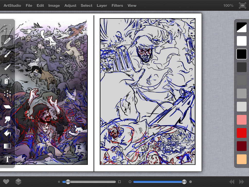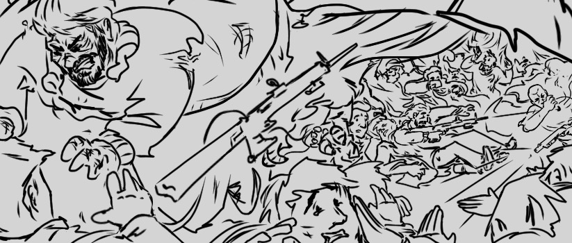 This thumbnail is pretty detailed, so it allowed me to draw over it fairly quickly. As I mentioned in a previous post, I do like the movement I created. The crowd in the first panel could have been a little more dense but it works well this way.
