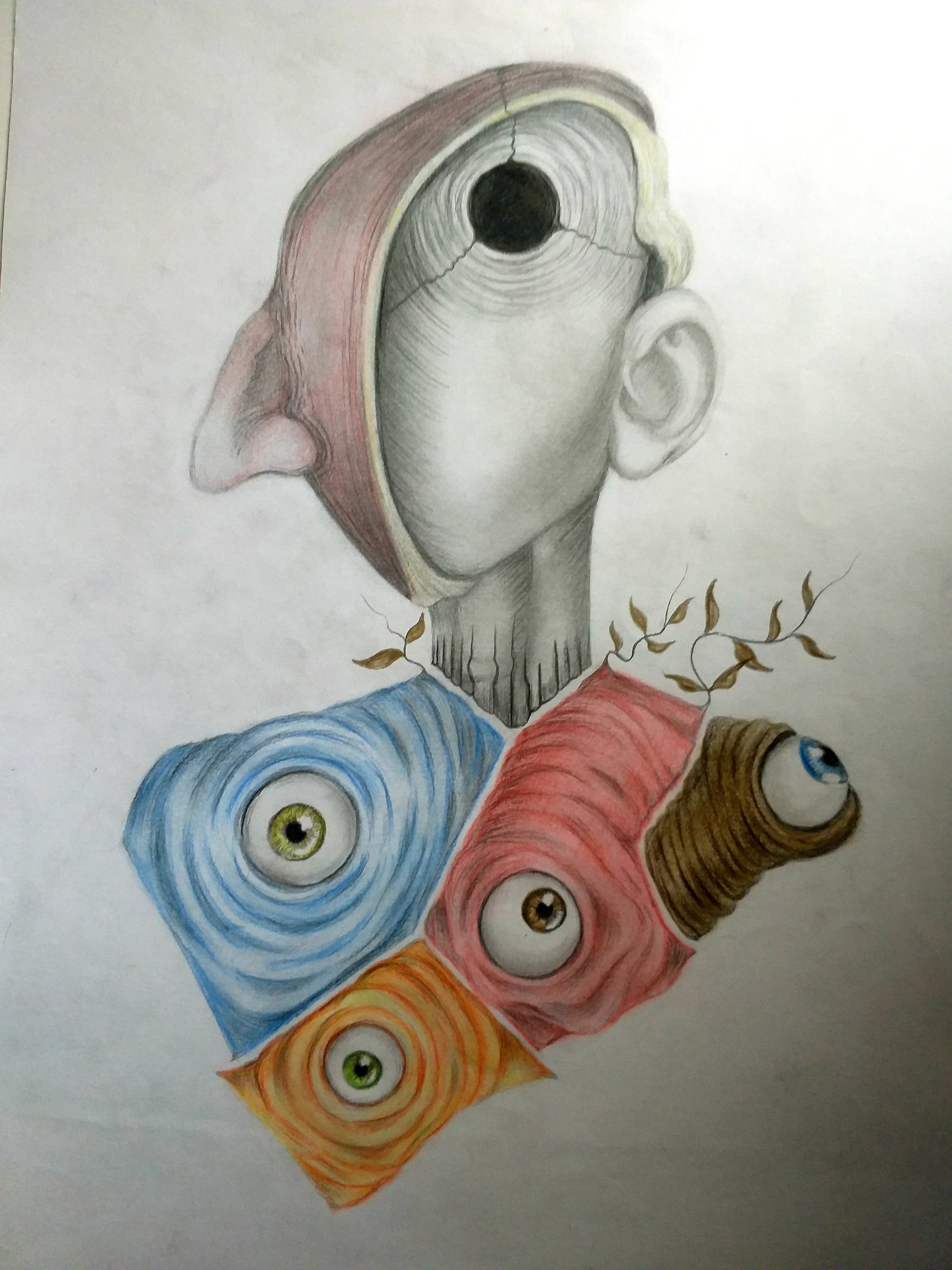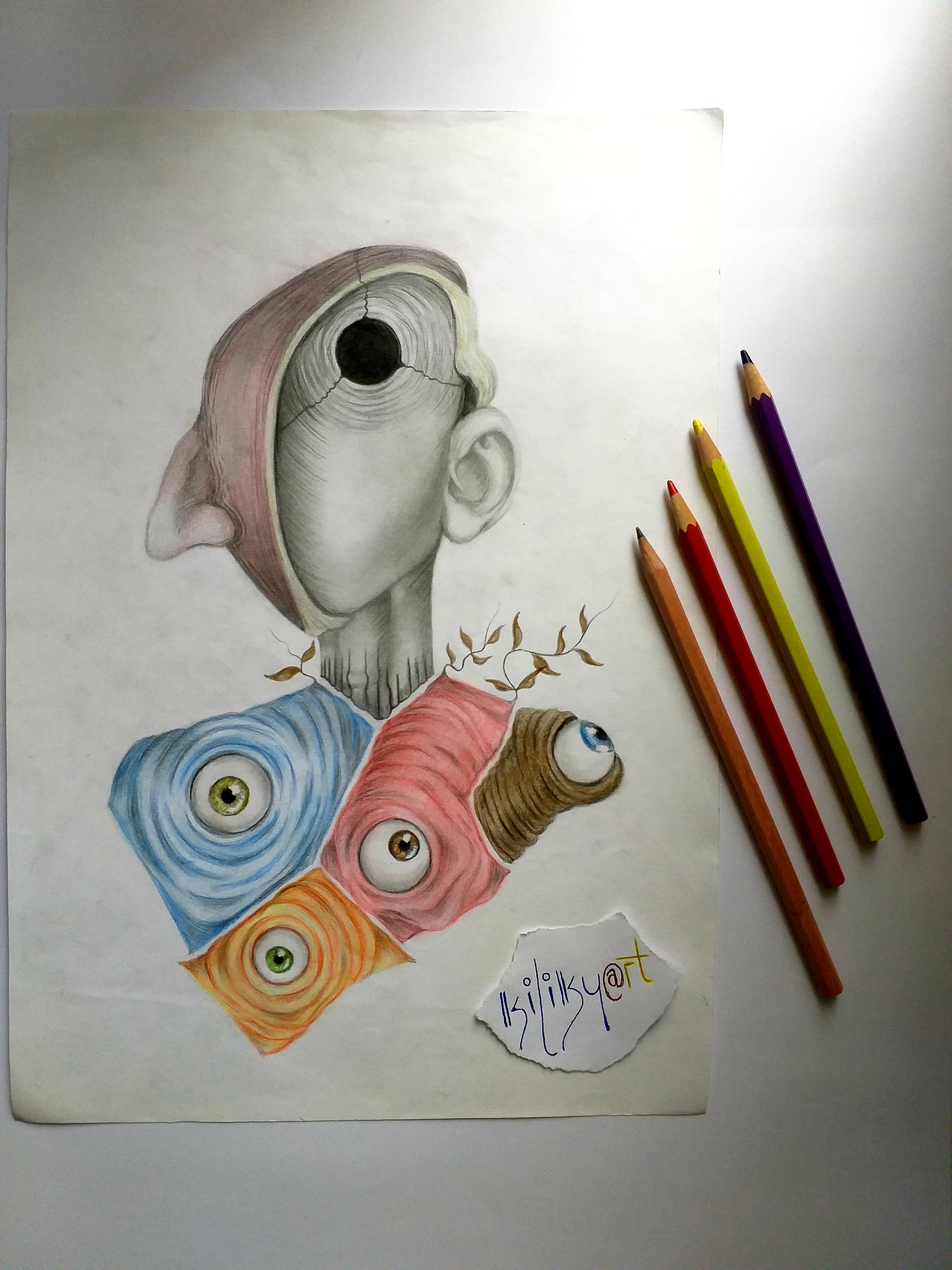 Güzel bir rüyanın ortasındayken herşeyin tepetaklak olup kabusa dönmesini betimlemeye çalıştığım çizimim "iç içe" ile karşınızdayım. Hem hayal kırıklığı hem de hayatın kendisi olan iç içelik her yanımızı sarmış durumda. Ya alışırsın renklerin arasından sana bakan siyaha ya da devam edersin yas tutmaya kararan rüyalarının ardından.
