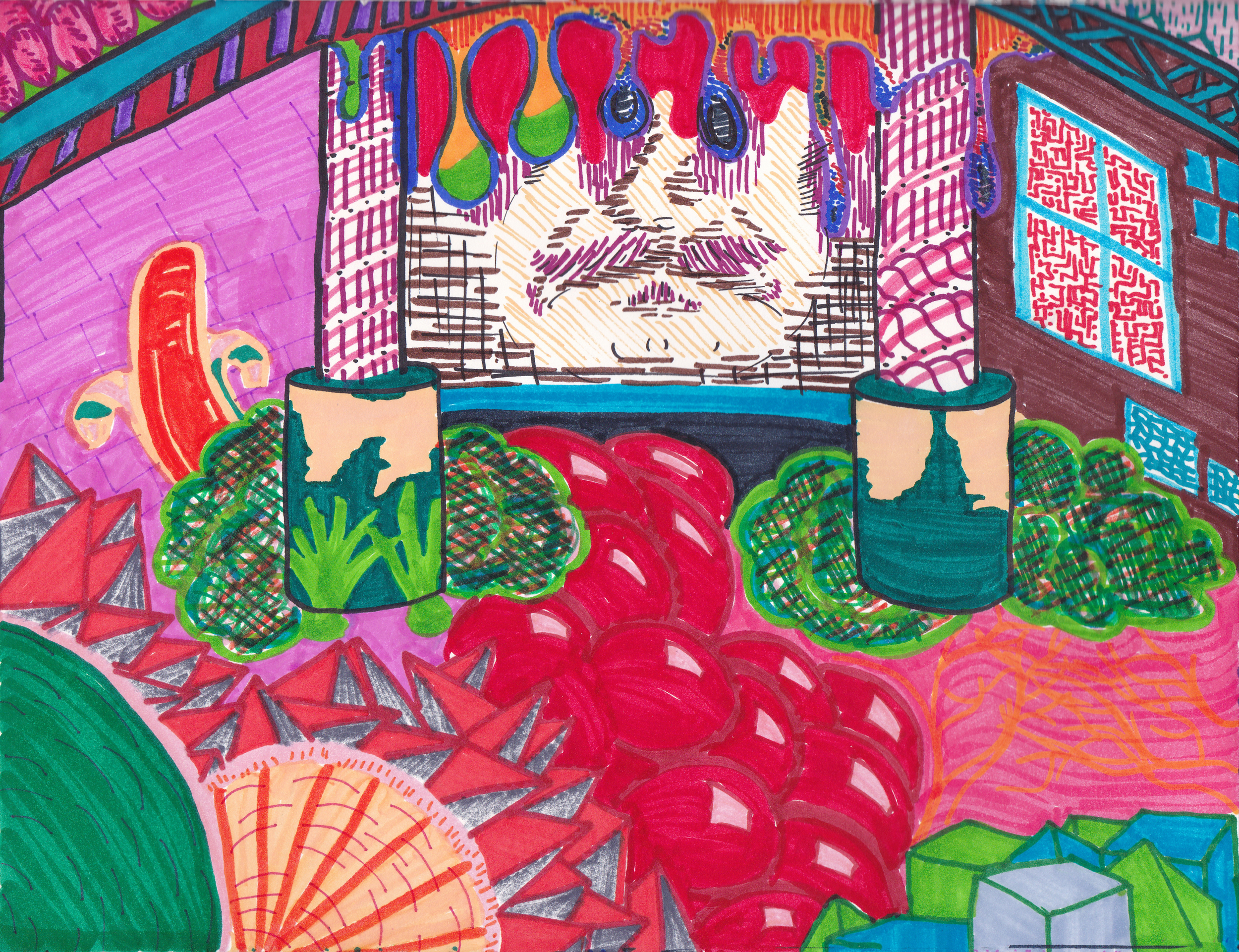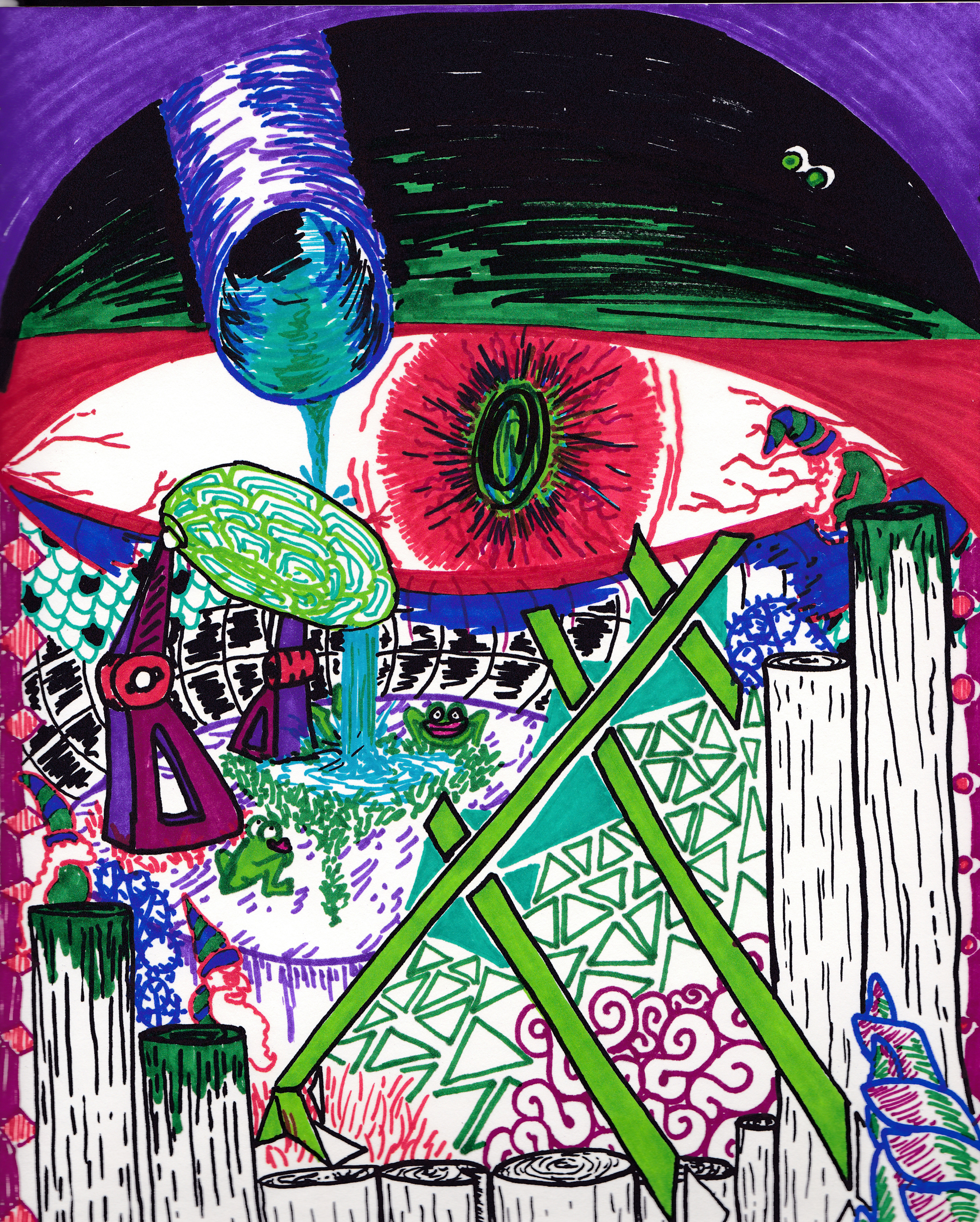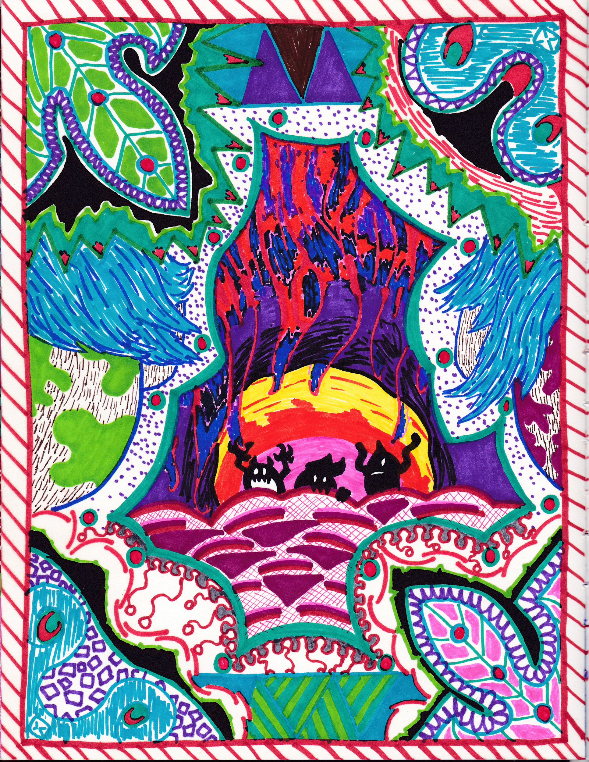 These images were made on paper, in a sketchbook with markers and pens, passed between two people with no planning, overarching theme, or communication. The rules were simple; once a mark was made, it was made. Work from simplicity, restrict yourself to simple lines, shapes, or patterns, the piece as a whole will grow naturally from there. The page would be passed fairly rapidly, neither person's turn lasting longer than a couple minutes.