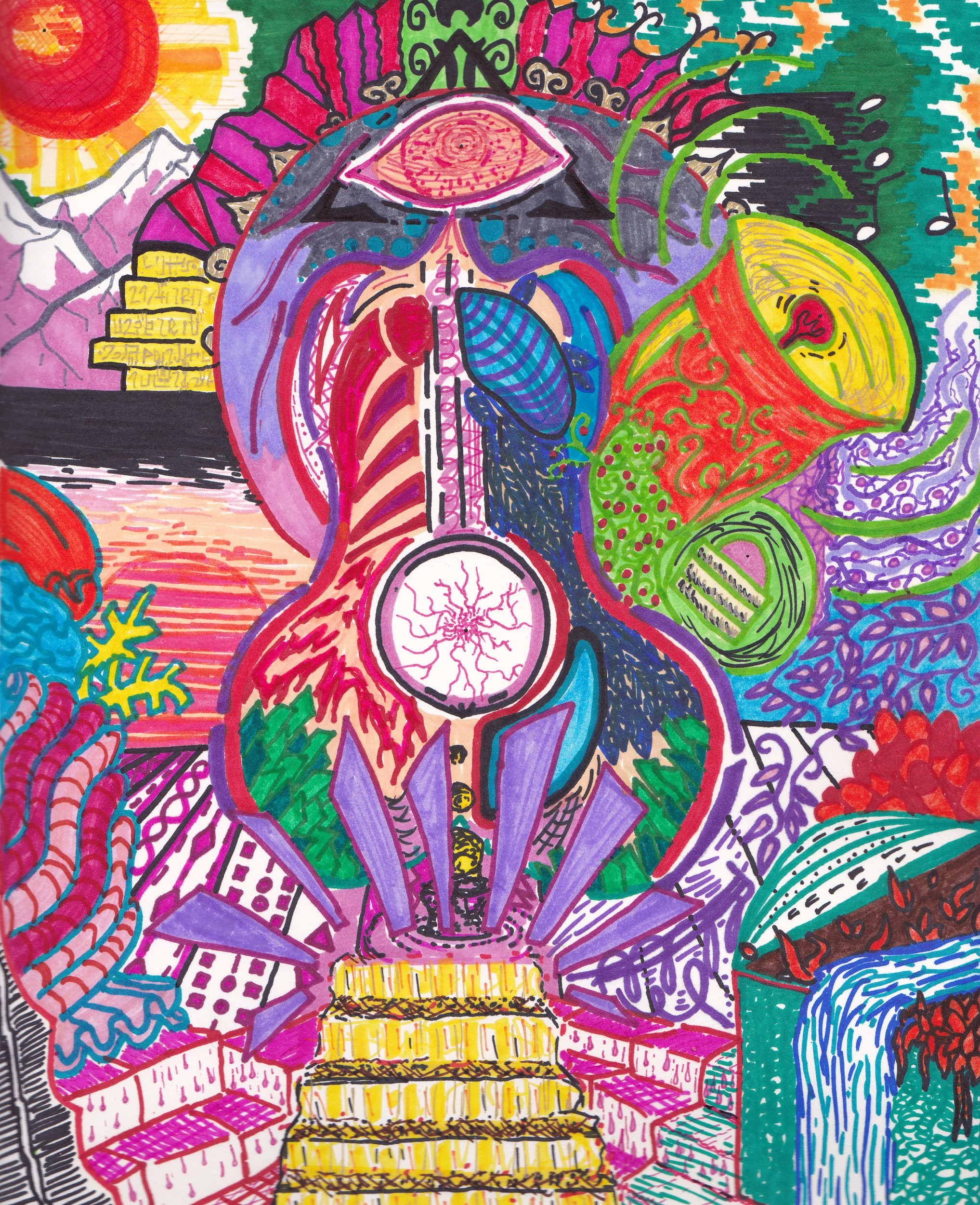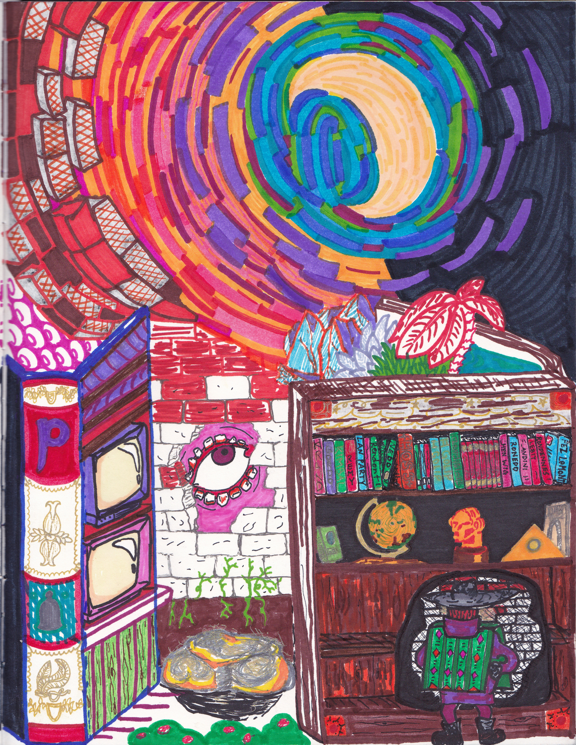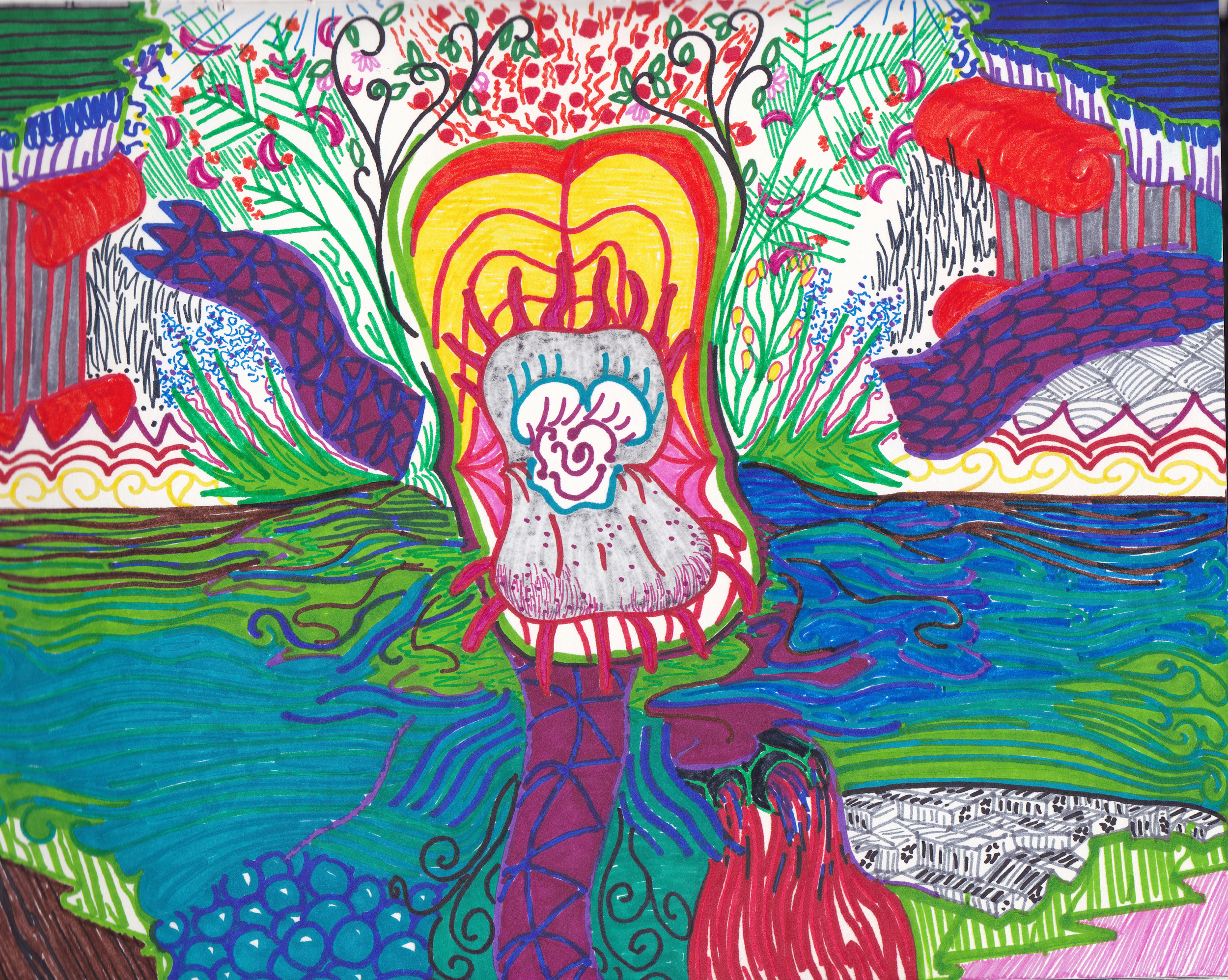These images were made on paper, in a sketchbook with markers and pens, passed between two people with no planning, overarching theme, or communication. The rules were simple; once a mark was made, it was made. Work from simplicity, restrict yourself to simple lines, shapes, or patterns, the piece as a whole will grow naturally from there. The page would be passed fairly rapidly, neither person's turn lasting longer than a couple minutes.