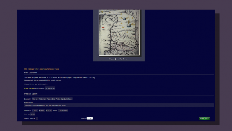 Currently, there will only be prints available of my work, but I plan on making originals for sale soon. I also aim to regularly add new original art pieces and prints to my site, and eventually add new types of products such as clothing, accessories, etc.