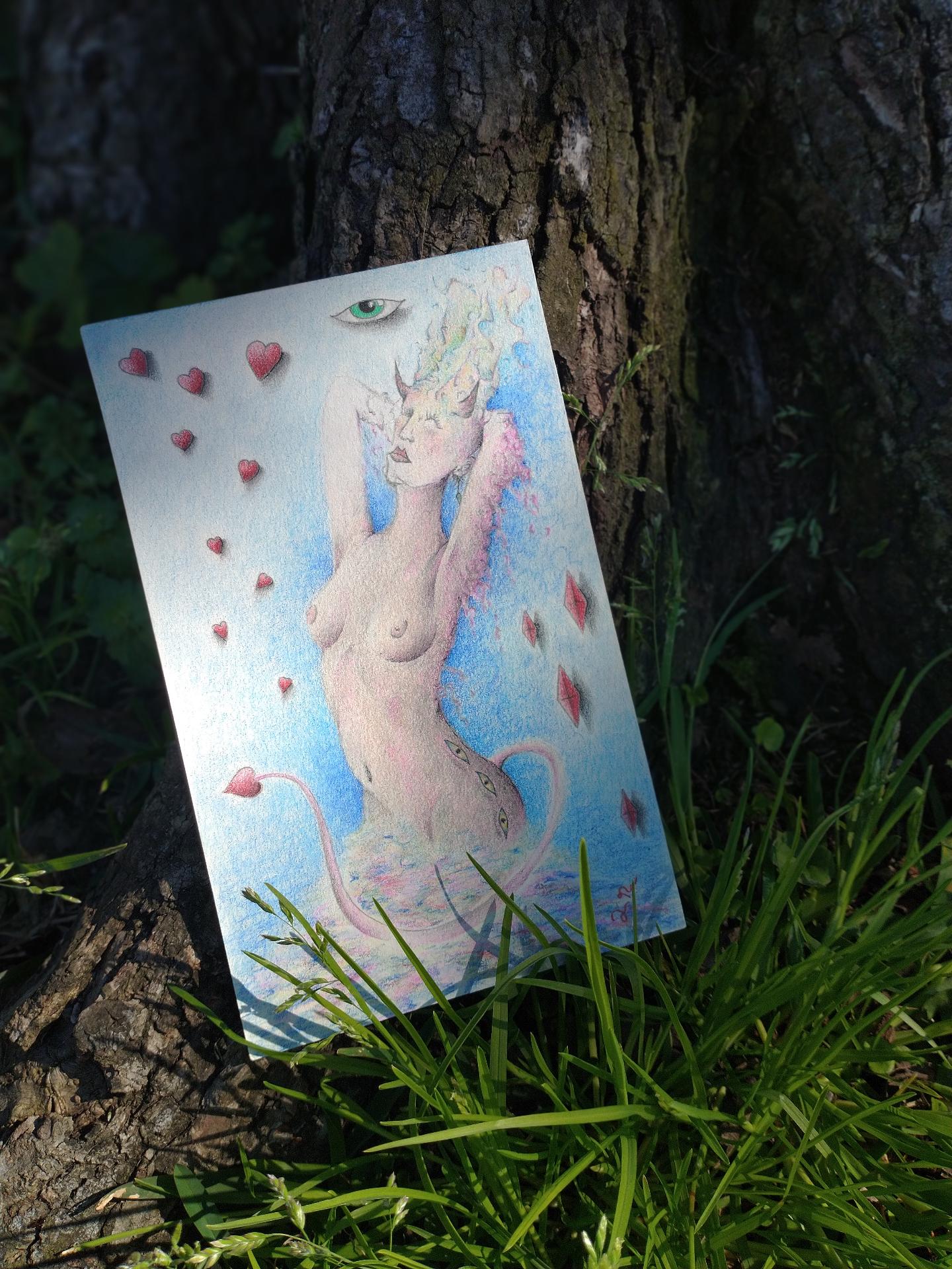A 4.25" x 7" colored pencil sketch of a being going through a rejuvenation process.