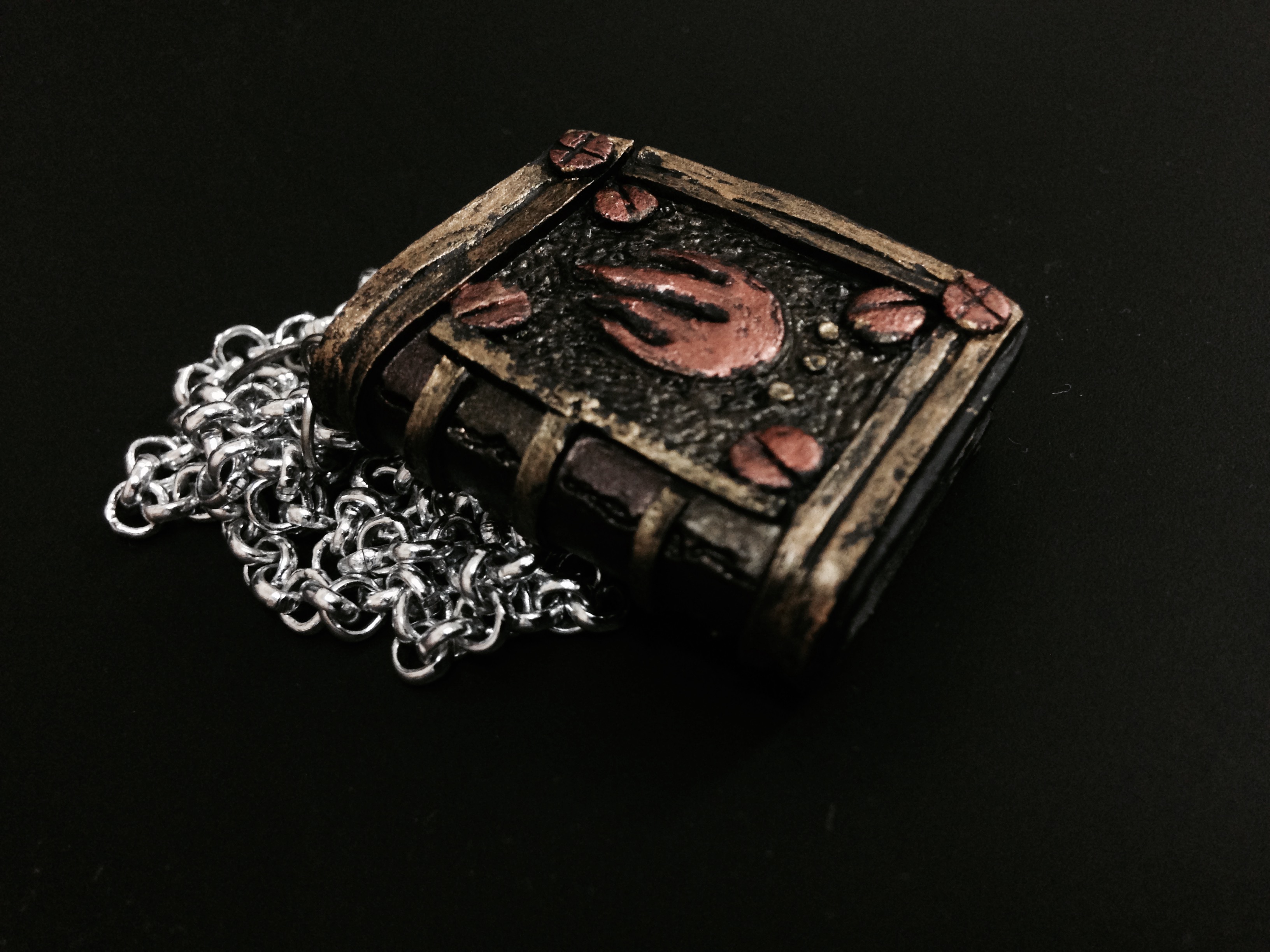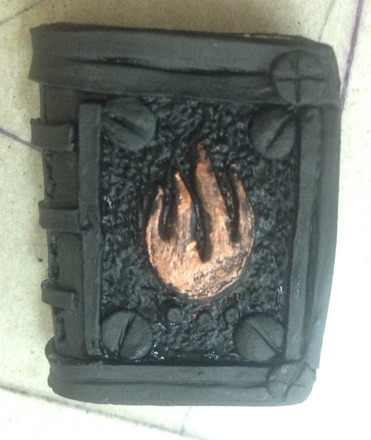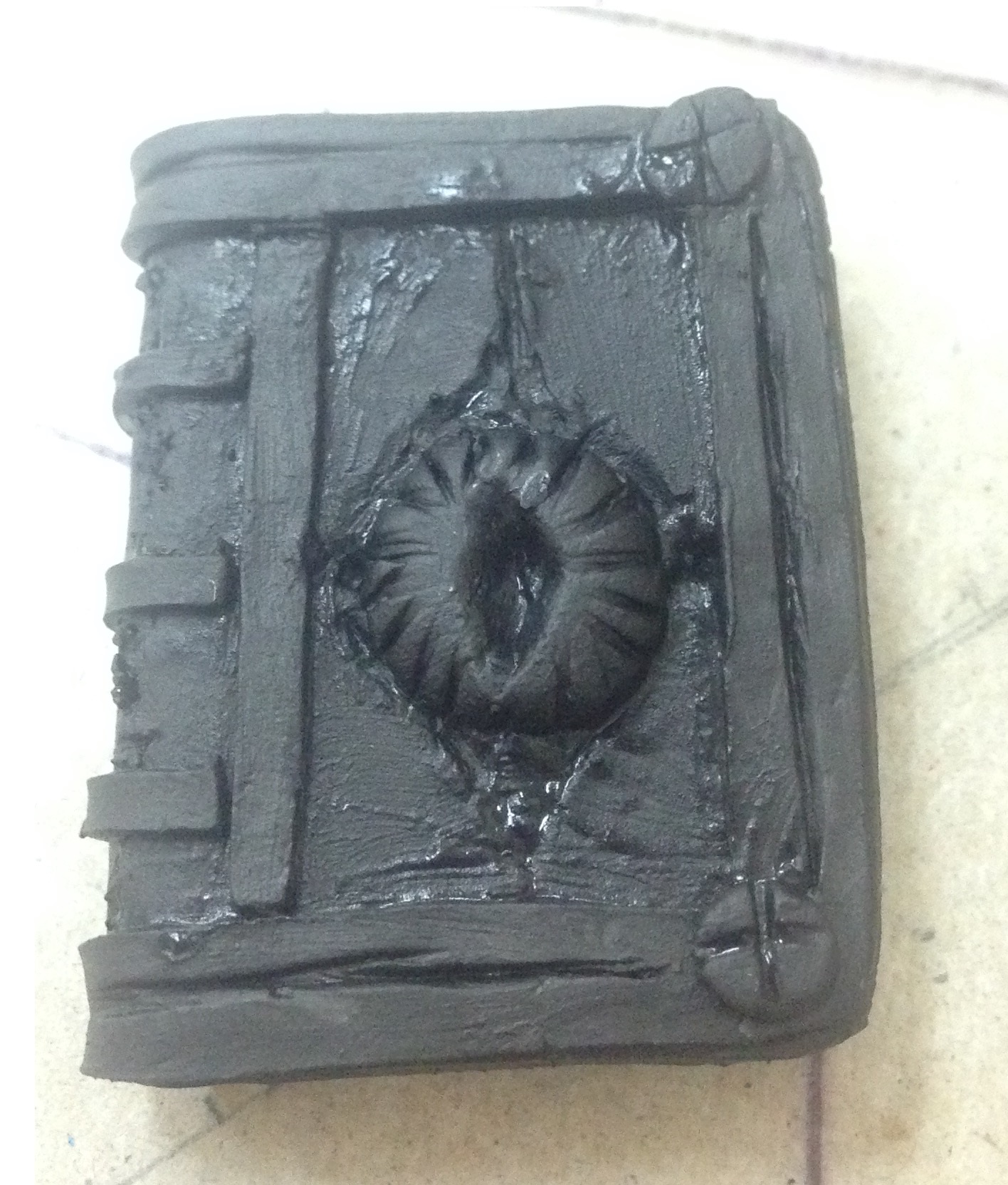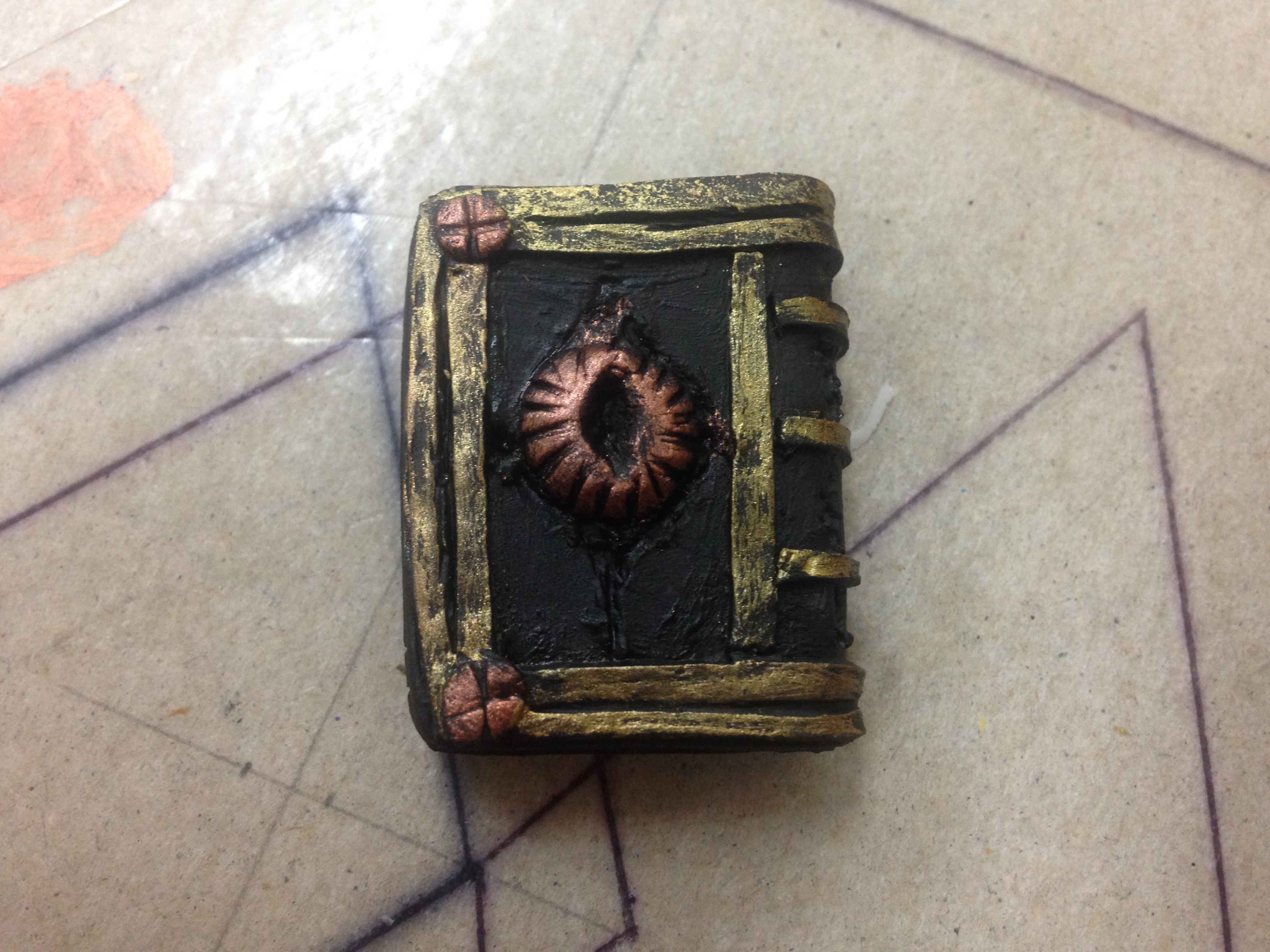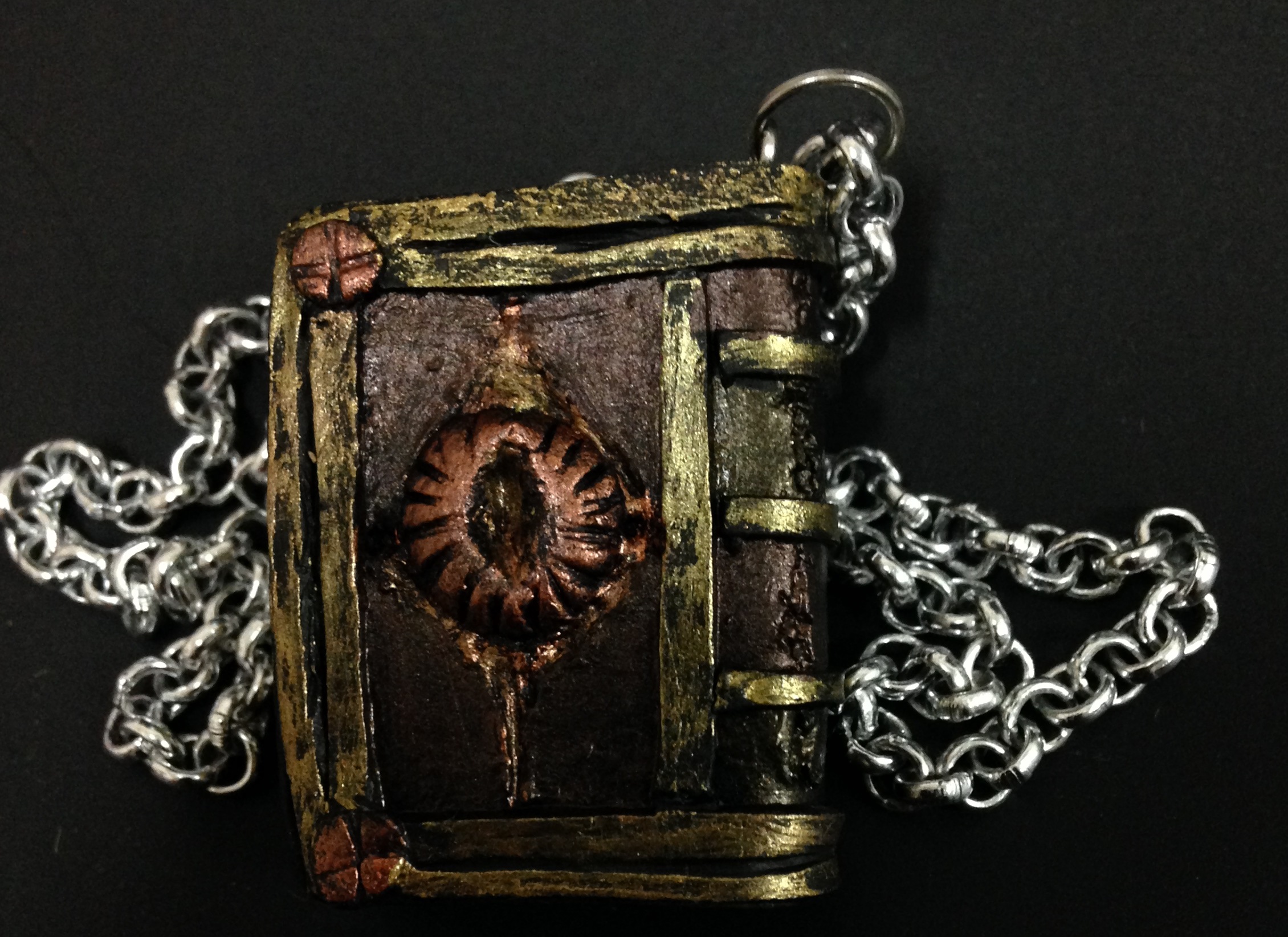 Once all the details of the Grimoire have been added, start anchoring the entire piece with Black Acrylic Paint (Eye: Try not to paint the Grimoire leaves with the paint), Once the piece is dry, with Metallized Paint and the Technique of Dry Brush we apply the colors Bronze and Inca Gold to the pieces to finally place the Eyedpins, Argollas and chain to the piece.