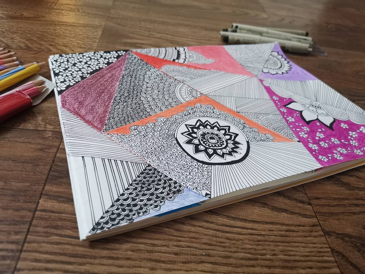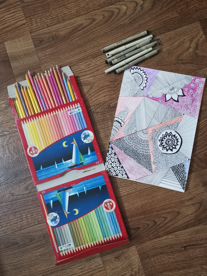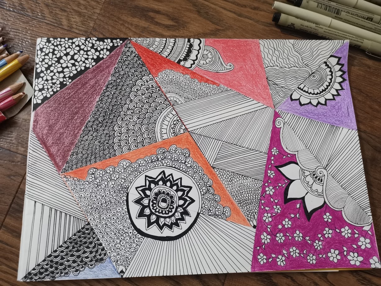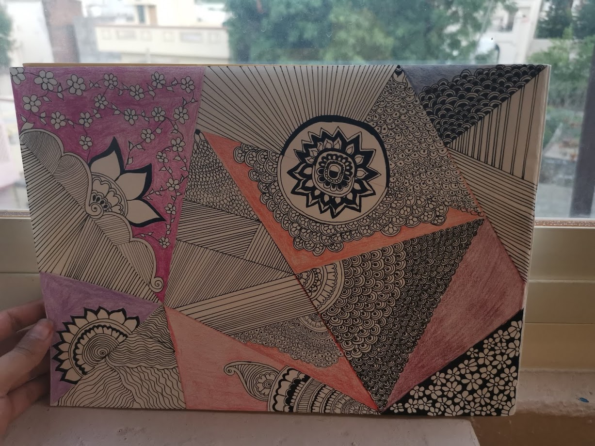 SO I THOUGHT OF DOING A DOODLE OR MANDALA ART.ACTUALLY I HAD A CONFUSION WHAT IS THE DIFFERENCE BETWEEN MANDALA AND DOODLING I FELT IT IS ONE AND THE SAME. SO I STARTED CREATING THIS DOODLE AND PLAYING AROUND WITH LINES AND PATTERNS. AND ALSO READ THE DIFFERENCE BETWEEN MANDALA AND DOODLING. HERE ARE FEW IMAGES OF MY DOODLE AND SOON I WILL PRACTICE ON DOING MANDALA TOO.