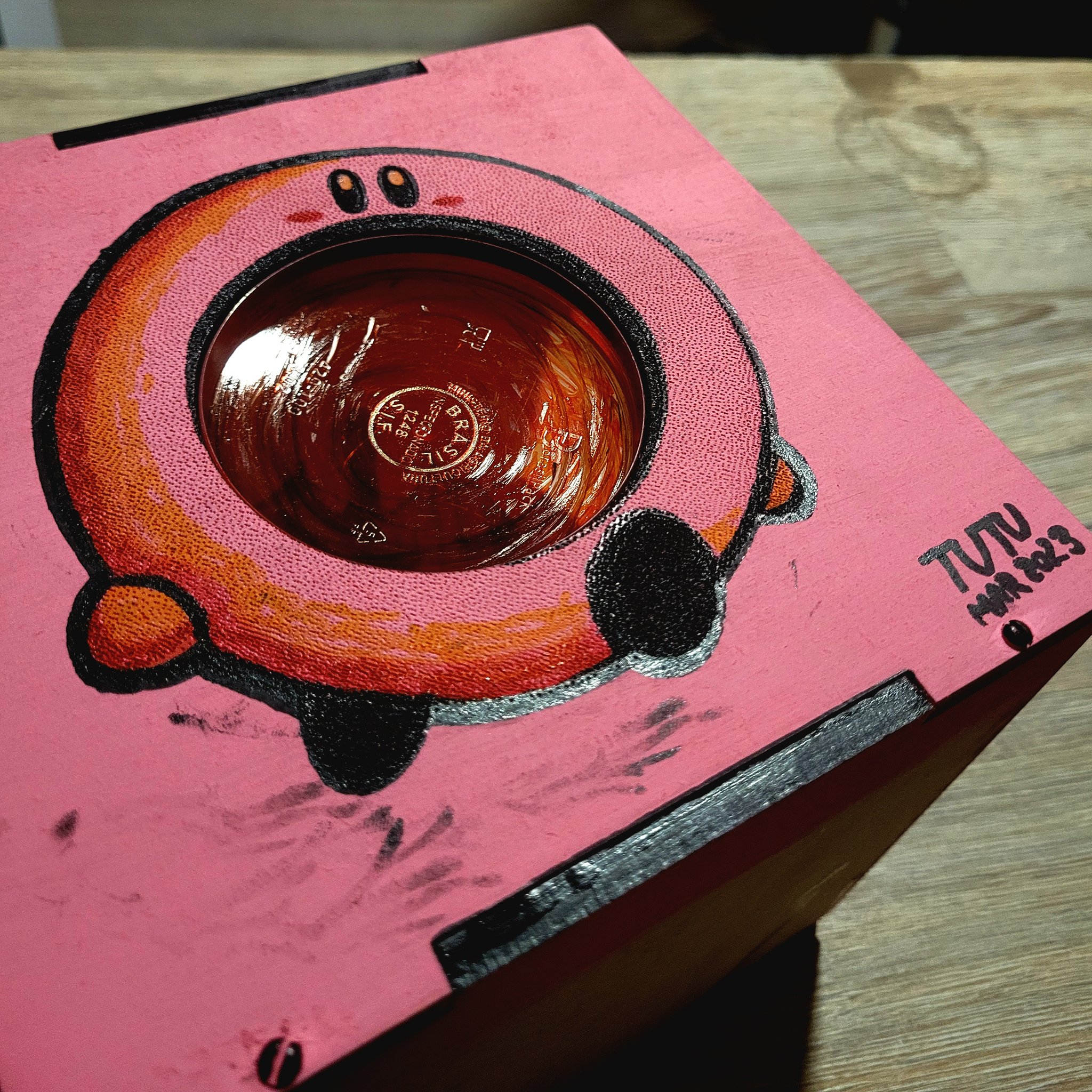 About .... .. ..kirby..??❤️🔥massola (64)in #art • 3 years ago Piece made by engraving and cutting a 6mm MDF sheet using CNC laser, painted with gouache and colored with Pilot pens. Composition with a 3D printed piece inside a plastic container, both also finished with Pilot pens. #kirby #nintendo #videogames #tutu