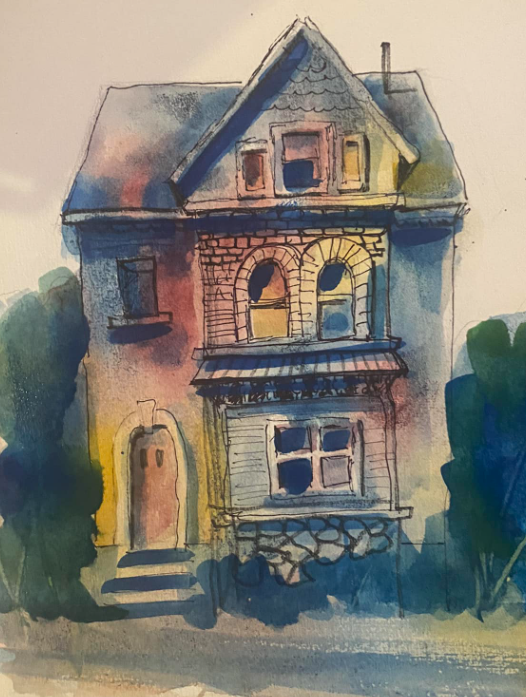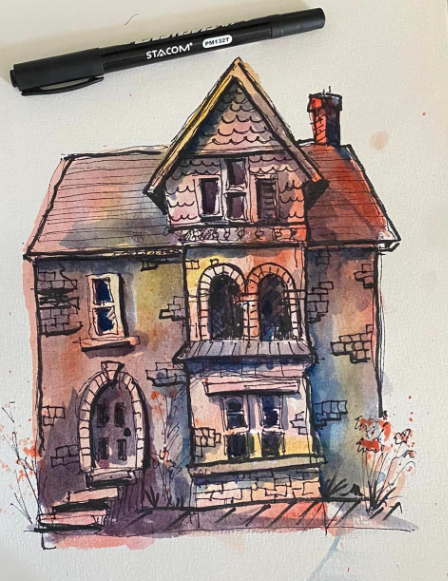 We've stepped away from the fast sketches for the time being but we've discovered that a lot of the students quite enjoy pre-painted papers and then make the drawing around it. This started as an accident when a student was using one piece of paper to sort out their color choices and it kind of ended up being a nice little rainbow type effect. Later, the student drew something over it and it turned out really nice. I would say that it was more creative than painting after the fact because a lot of time we tend to turn things like this almost into one of the paint-by-number books that existed when I was a kid - maybe they still do exist.