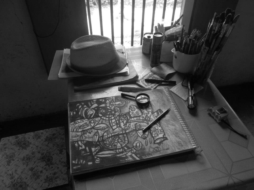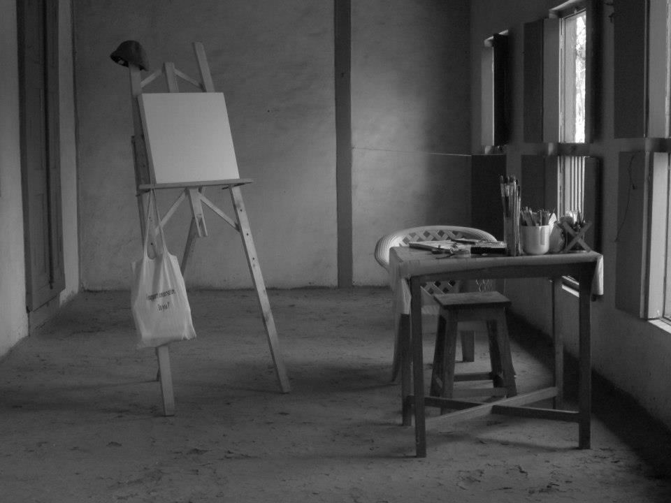 A small setup of an art studio with a canvas and a table chair, arranged by me where I did some abstract work.Which is very close to my heart, as I spend a lonely period of time, which was totally devoted to my passion and obsession towards painting.