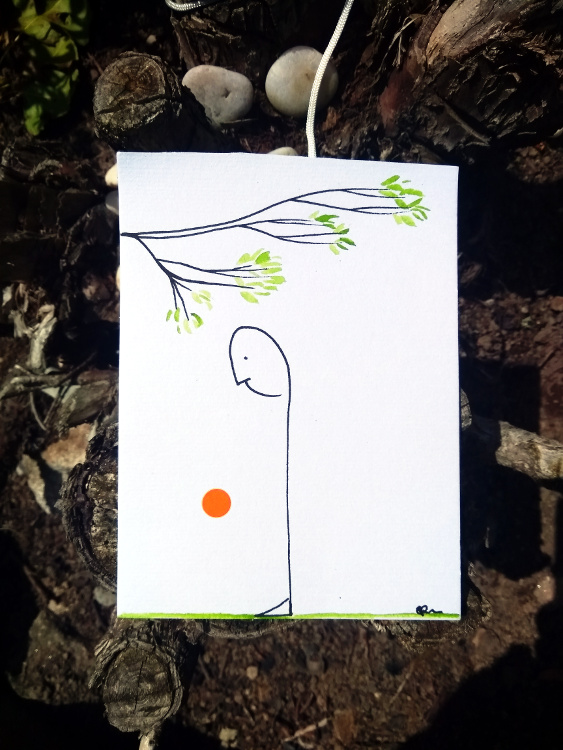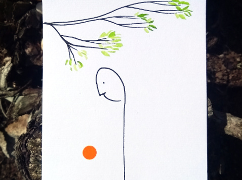 This is a quick doodle I created whilst I sat outside in the sunshine. To start this drawing I placed a small orange sticker on the page. I then drew the figure and the tree, the sticker became an orange falling to the ground. It's fun to start with something as simple as a coloured dot on the page, and then see what is can turn into with a few pen lines.