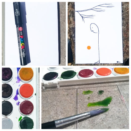 I drew the image using my black posca paint pen. I then used watercolours to add the leaves on the tree and ground beneath the figures feet.