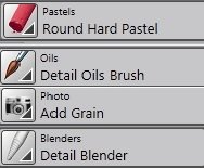 - BRUSH: oils, bulge, dodge, burn, add grain, chalk, distort, pencil 2b, blenders bristle others