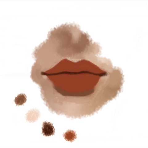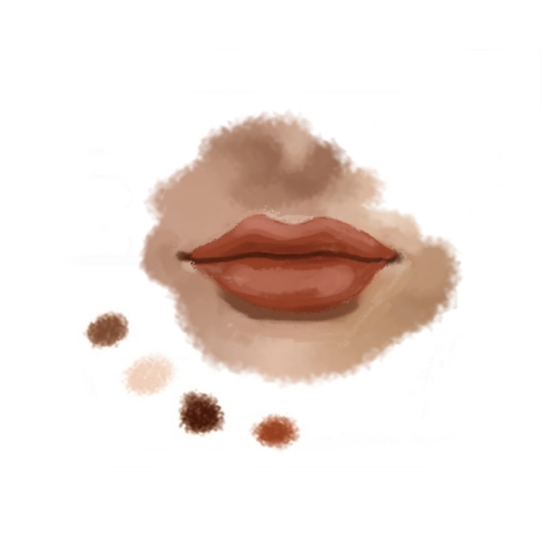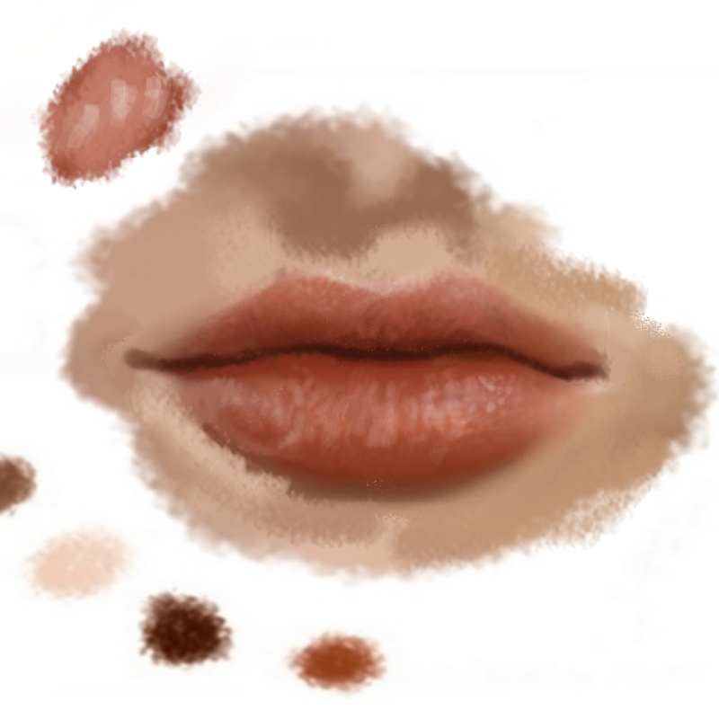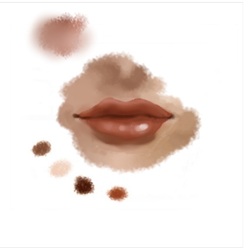 Luego que aplicamos los colores para dar volumen a los labios vamos a difuminarlos yo utilizo el blenders bristle en un 25 porciento de opacidad puedes ver el efecto de la difuminación arriba en el ejemplo luego vamos a darle brillo a los labios esta parte es importante porque da el efecto de humedad de los mismos y realismo.