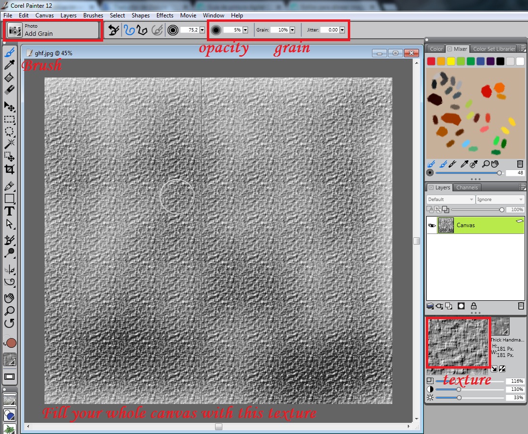 The next thing is to fill the whole canvas with the selected grain texture to get something like I show you in this image, use the ADD GRAIN brush with an opacity of 5 and 10 grain of percentage.