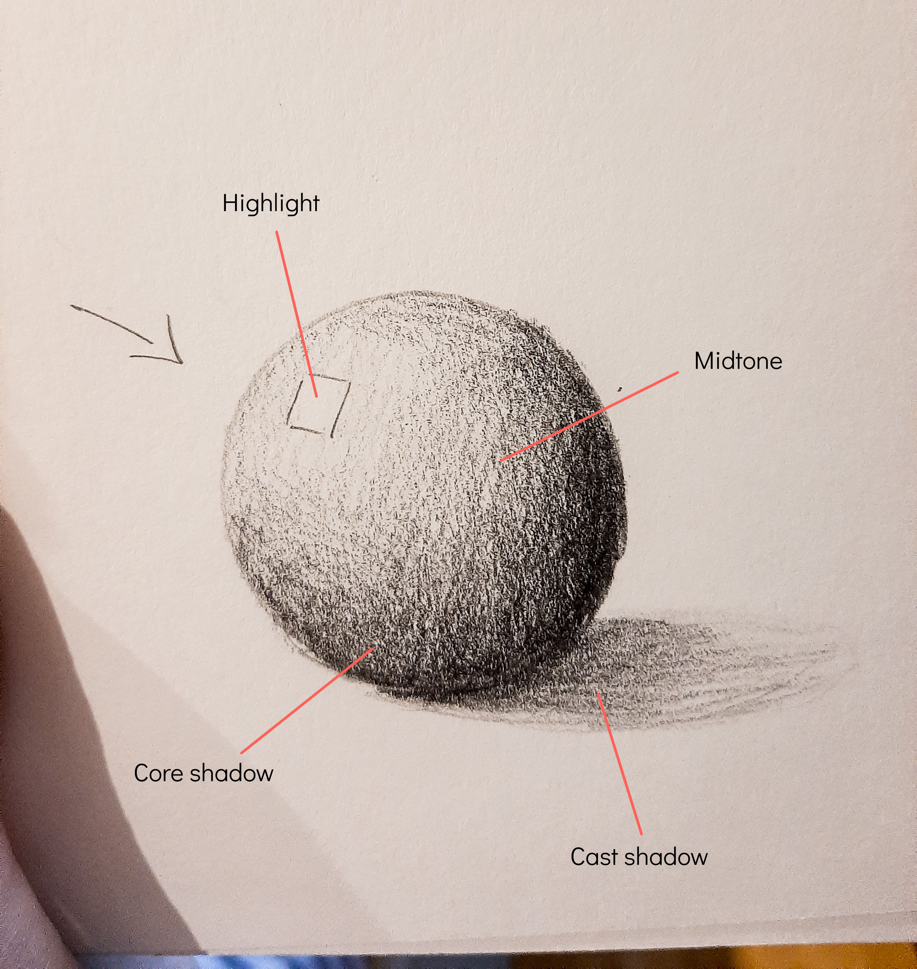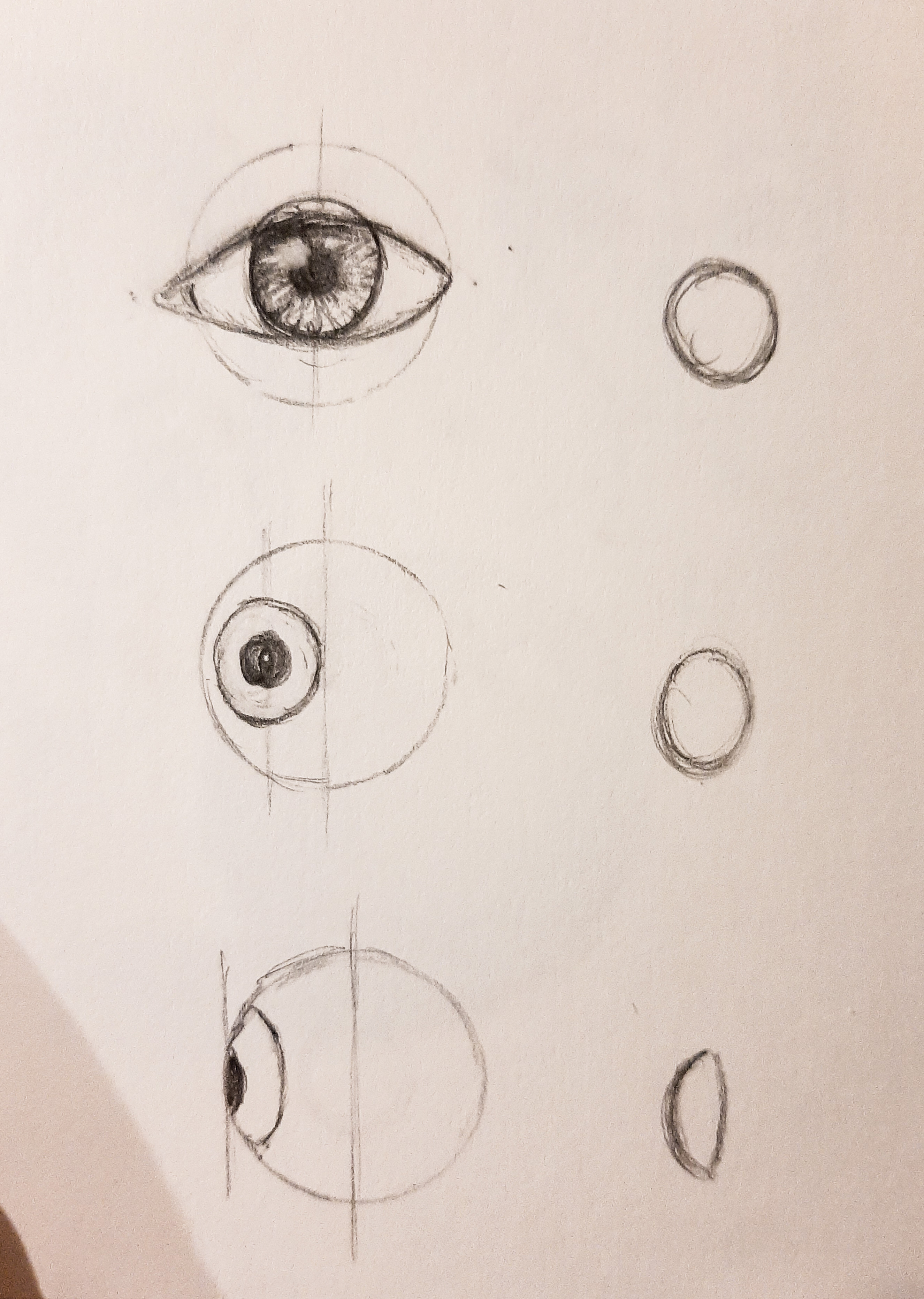 Now, the white part works as the same way. As a sphere, the corners are darker than the center. (It is more marked on my drawing at the top of the article, I confess !) And it is also darkest on the top, because the top eyelid produces a shadow on the eye.