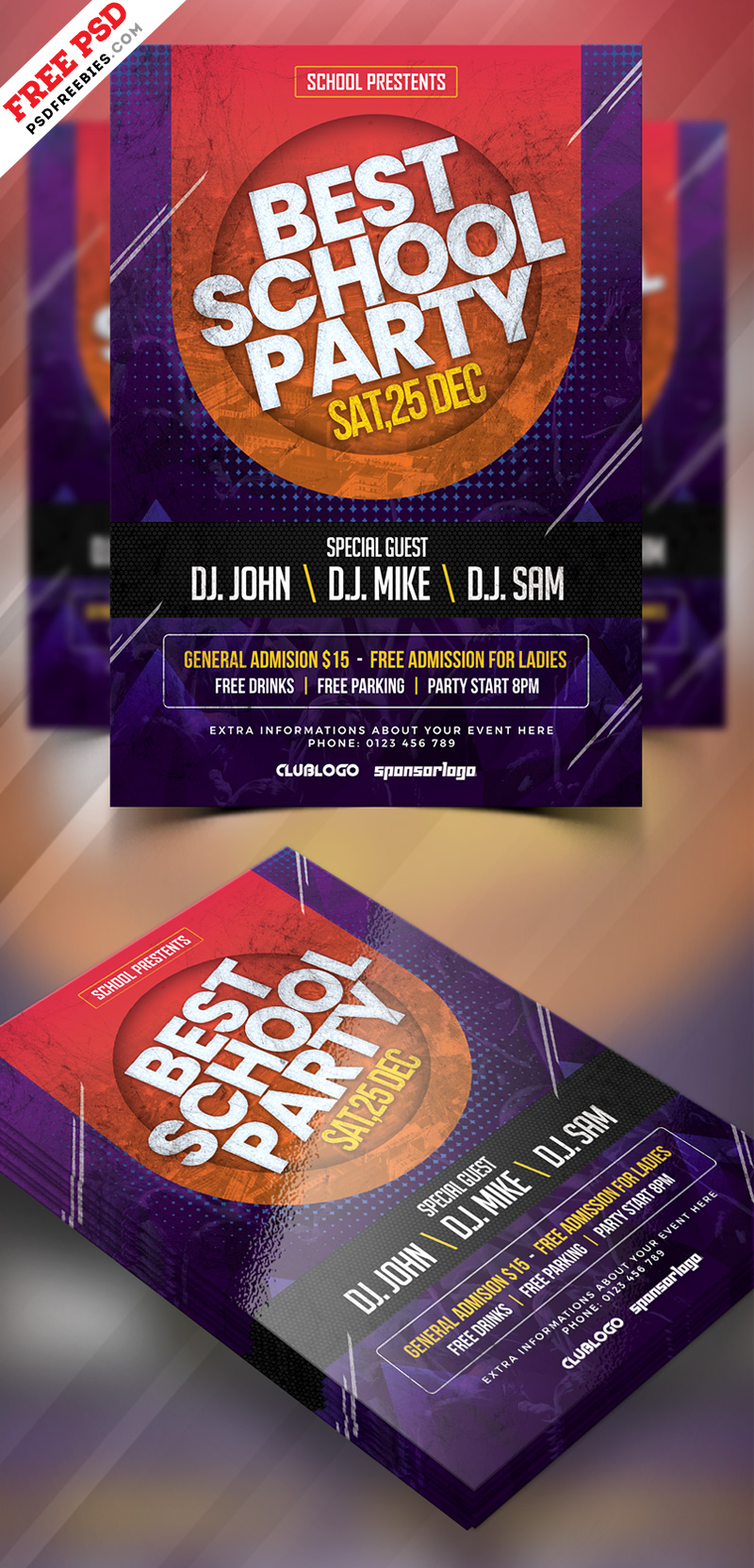 Download Free School Party Flyer Template PSD. This School Party Flyer Template PSD is designed to promote any kind of your next school and college party, music night event, concert, festival or any events. This School Party Flyer Template PSD is designed and created in Adobe Photoshop. Download contains a A4 size, 300 dpi, print-ready, CMYK PSD file. All main elements are editable and customizable.