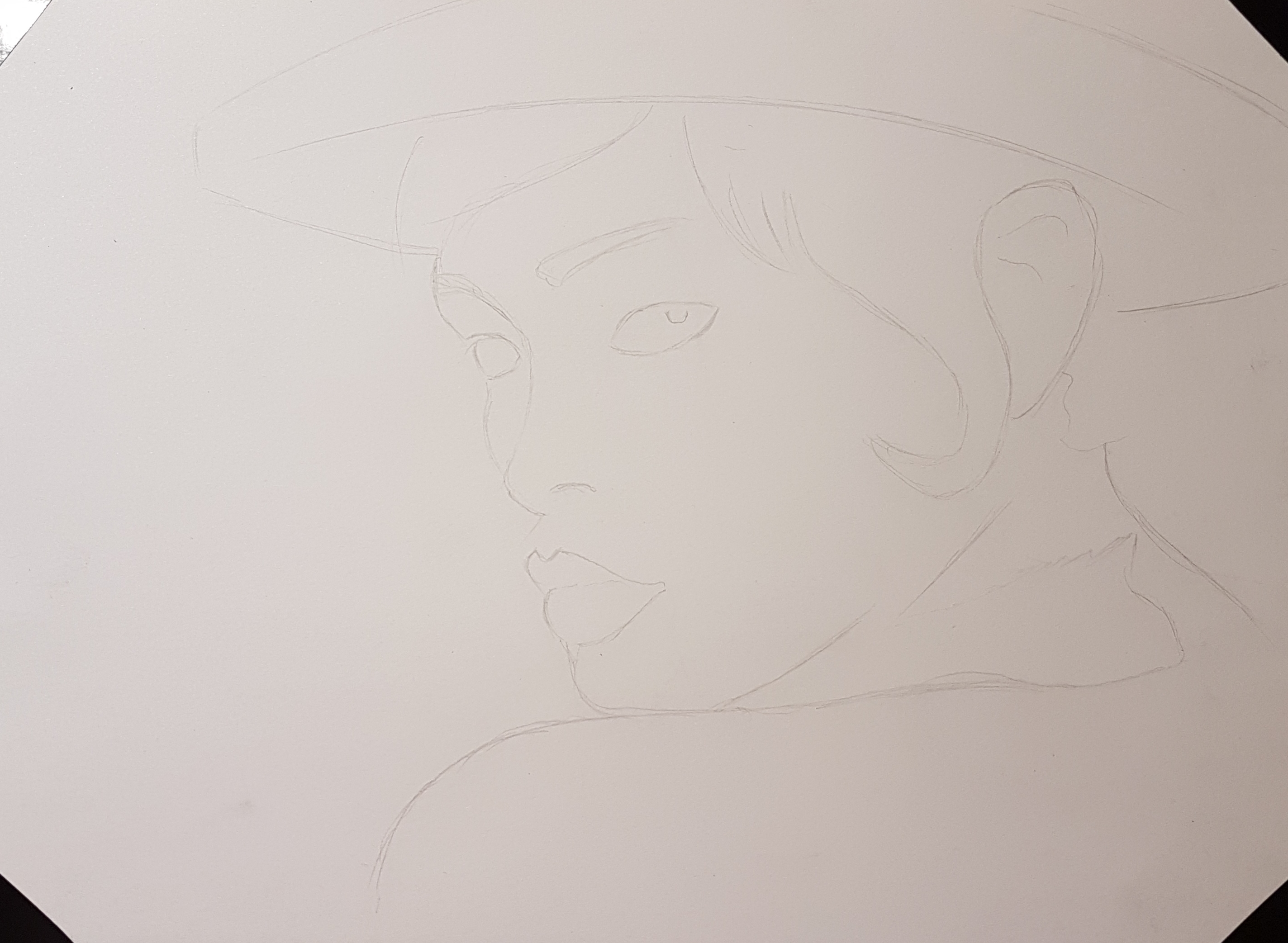 First I start to draw a rough sketch of the basic shapes of her face. For this I use a graphite pen like 2H and press gently. I may have a different method than most artists, I draw some rough lines and measure the distance between different spots with a ruler to get the proportions right. Many people use the grid method and draw each square separately. I like to shade up the face and see the drawing develop.