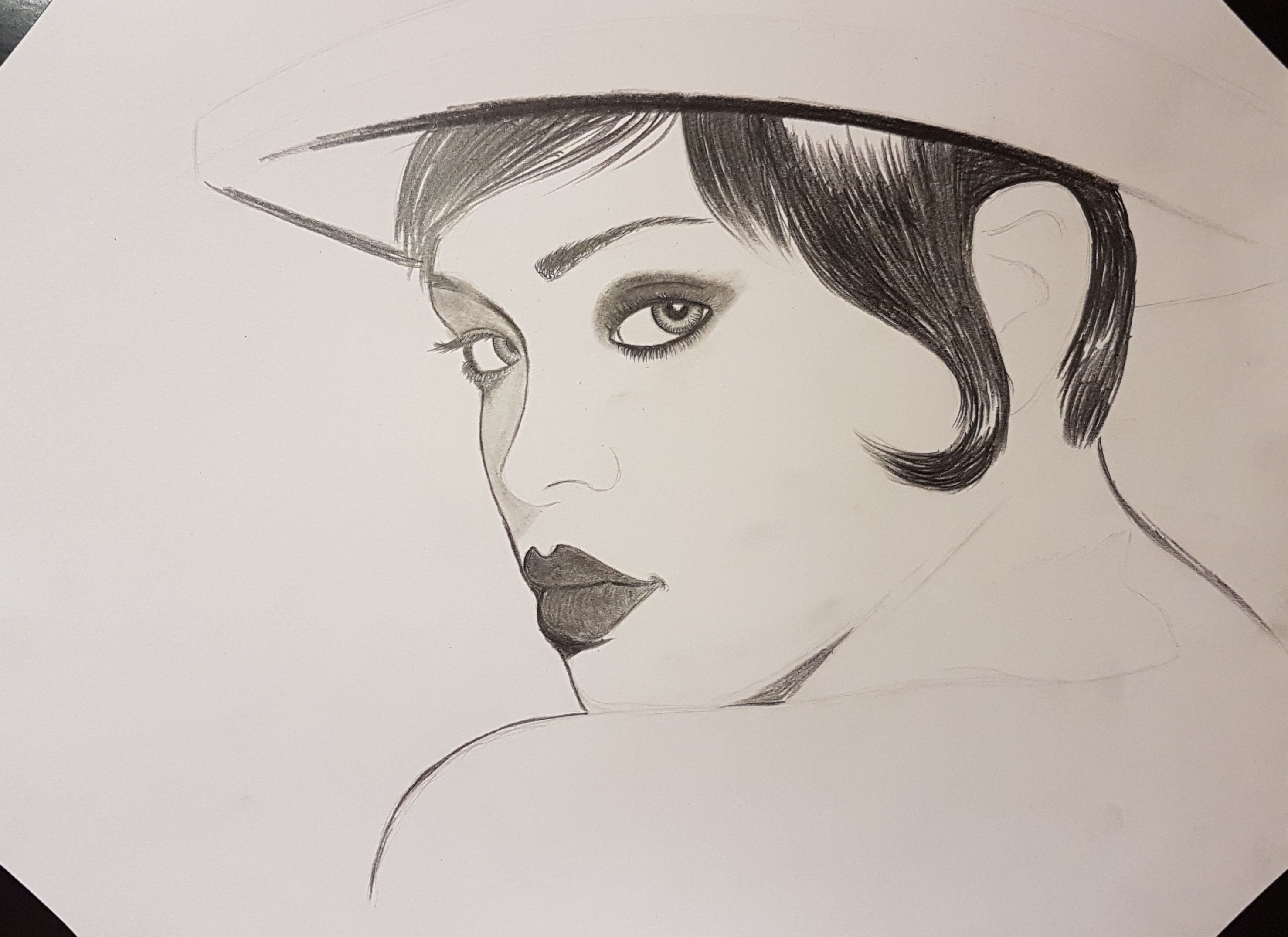 After the eyes, mouth and hair I start shading her face in I light shade and I use a piece of toiletpaper to smoth outh the graphite in the larger areas and a paper stick to blend the more detailed areas like chin, nose and mouth. I also start to make the background black by using a very dark graphite pen like 6B.