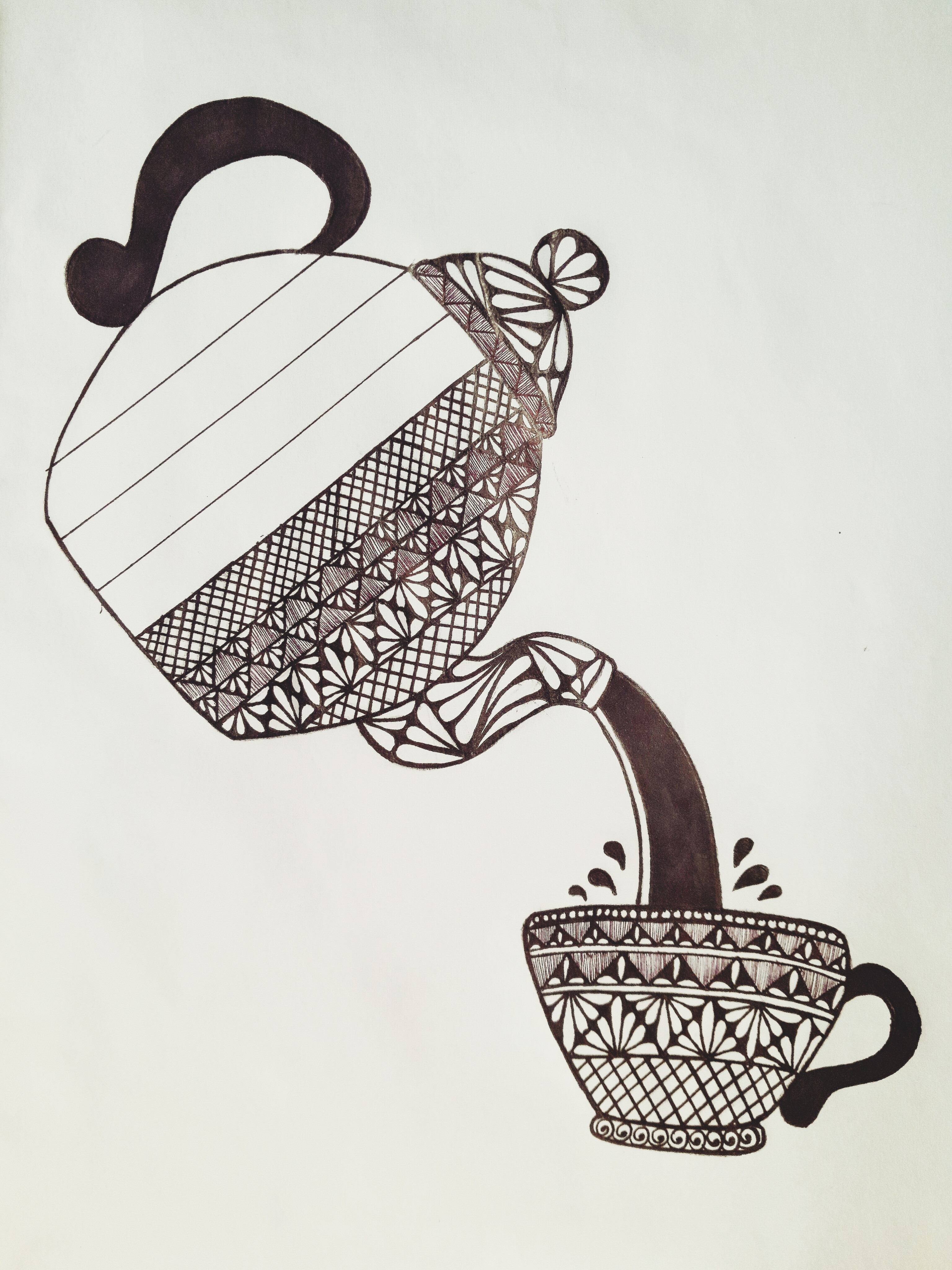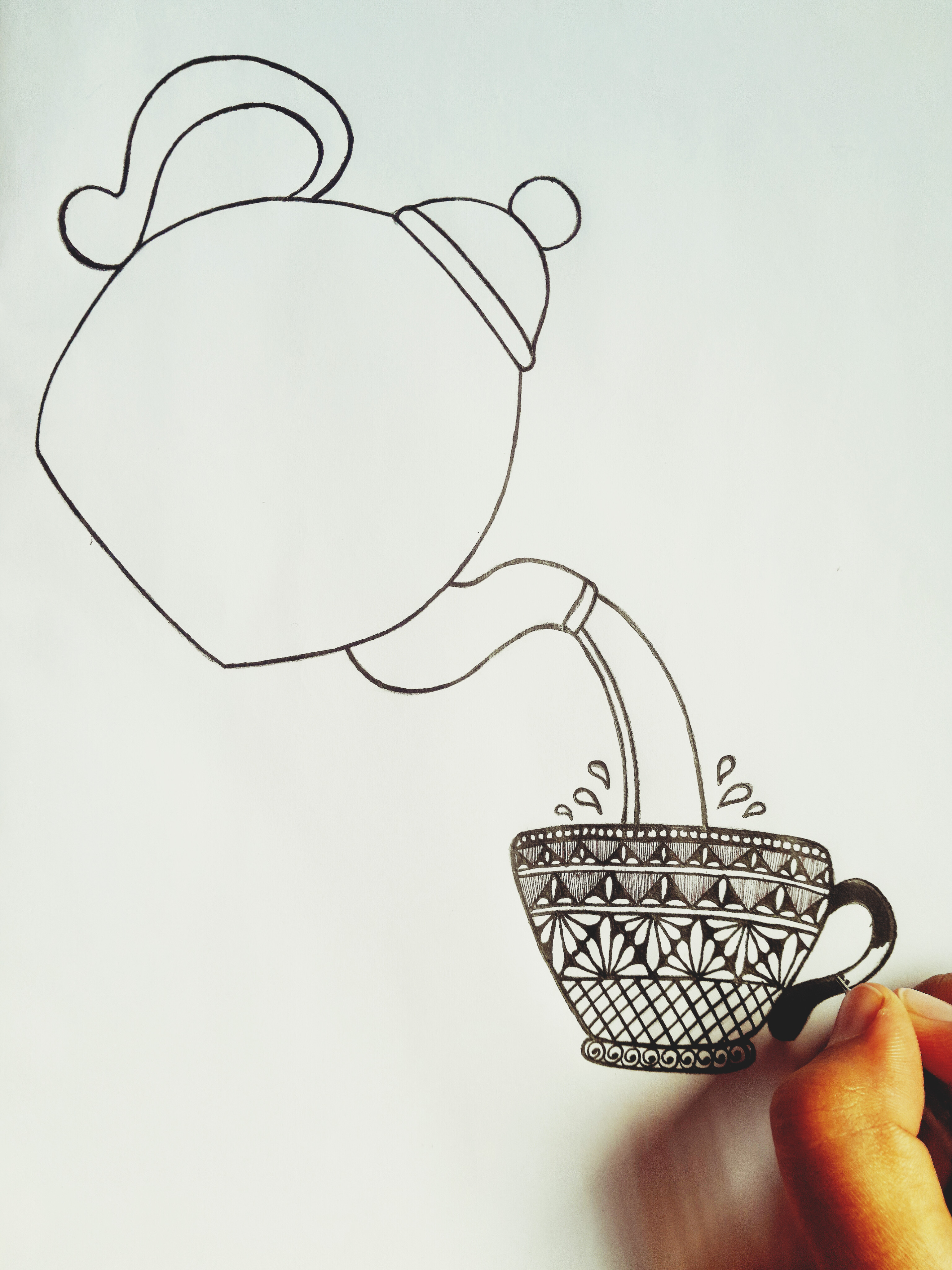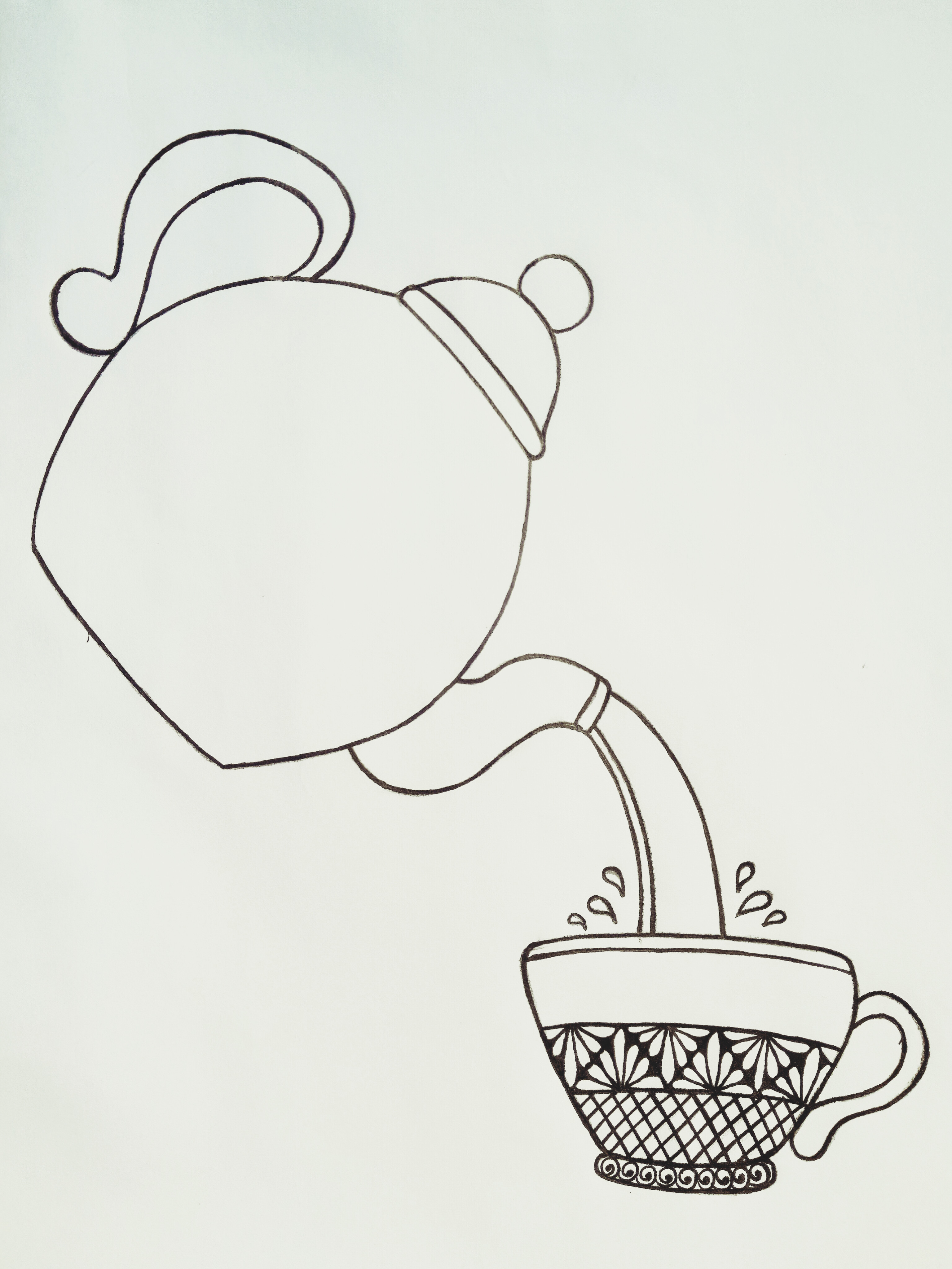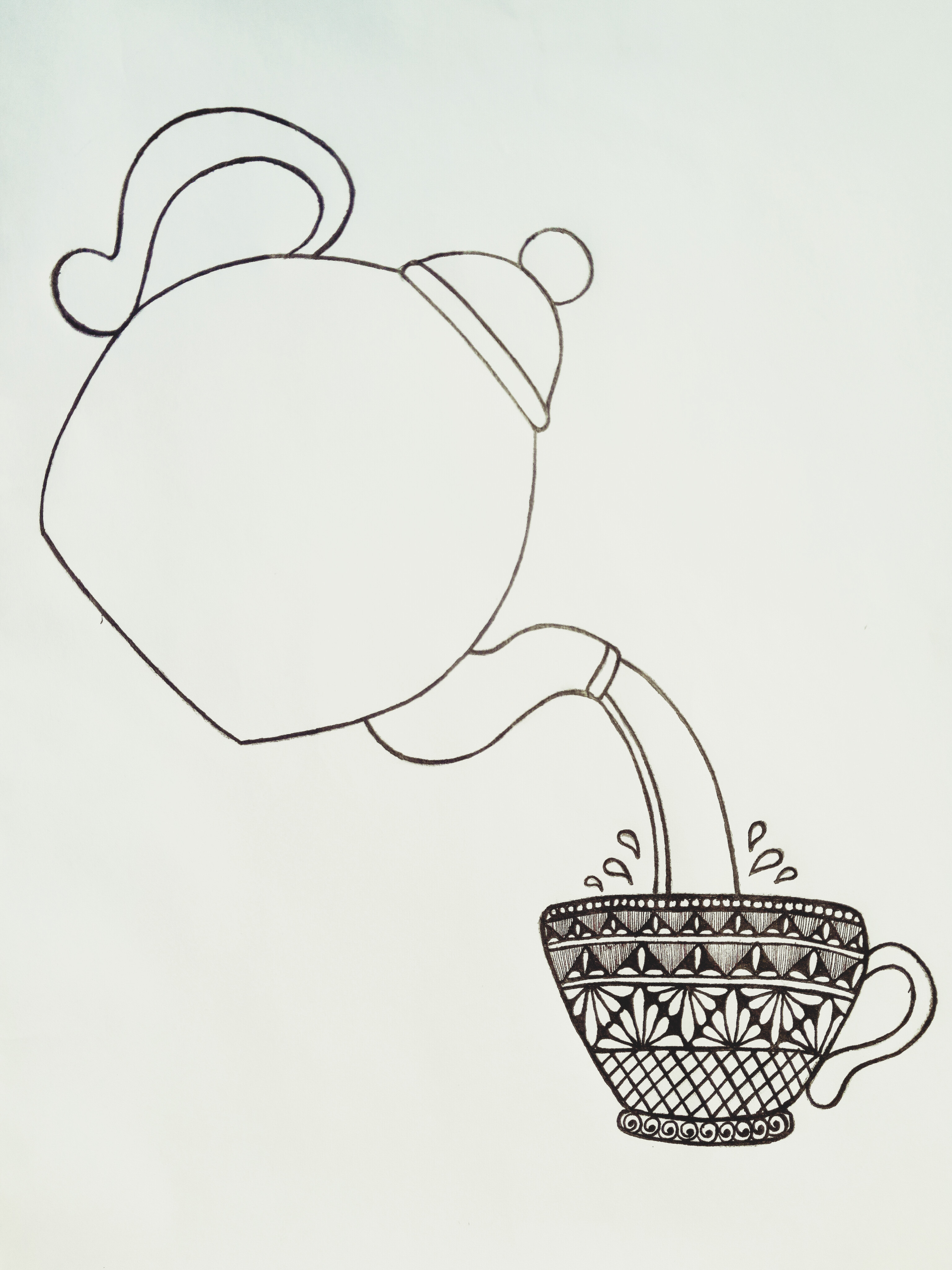 চায়ের কাপের হাতল এবং কেটলি থেকে চা পড়ার দৃশ্যেকে মার্কার পেনের সাহায্যে কালার করে নিলাম। এইবার কেটলির যে জায়গা দিয়ে চা ঢালা হয় সেই অংশে কিছু ডিজাইন করে নিলাম কলমের সাহায্যে।