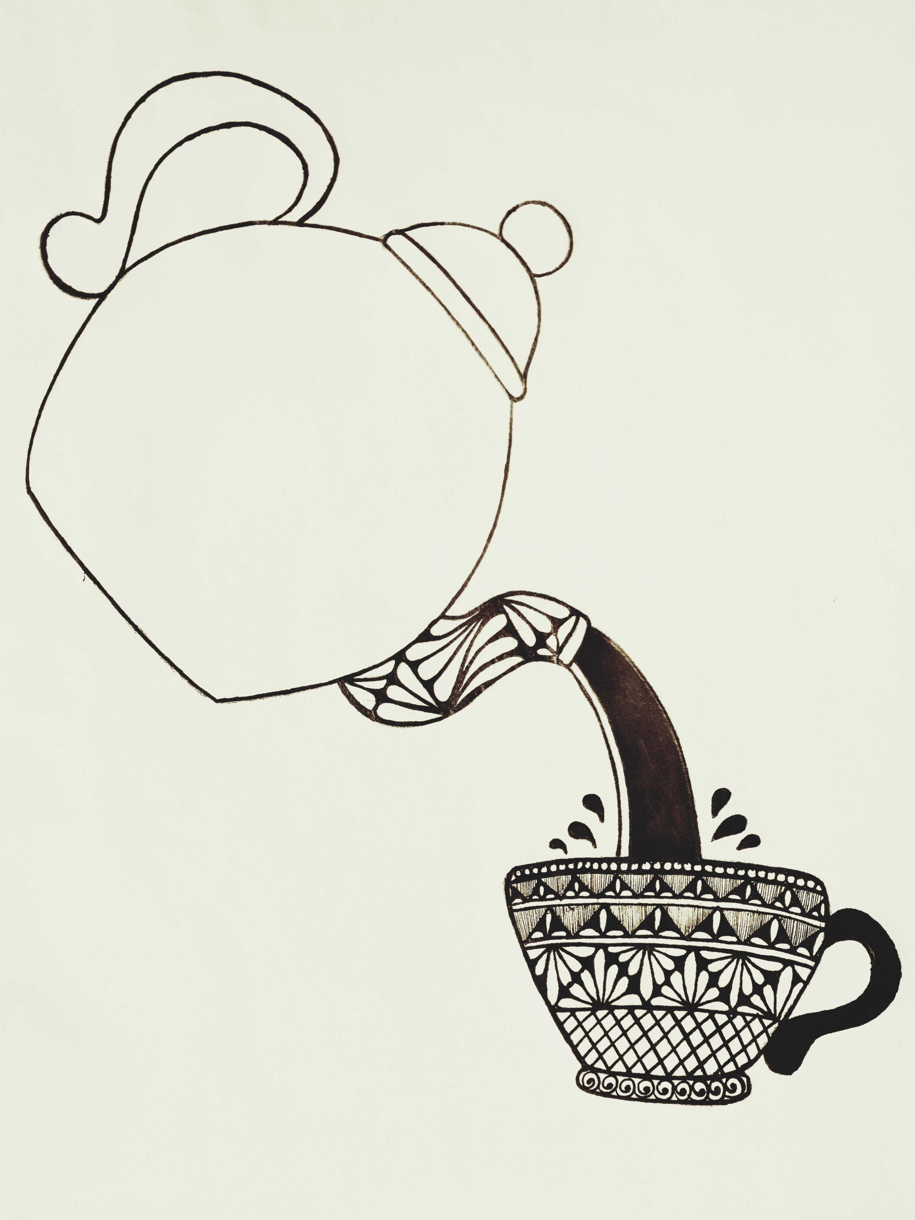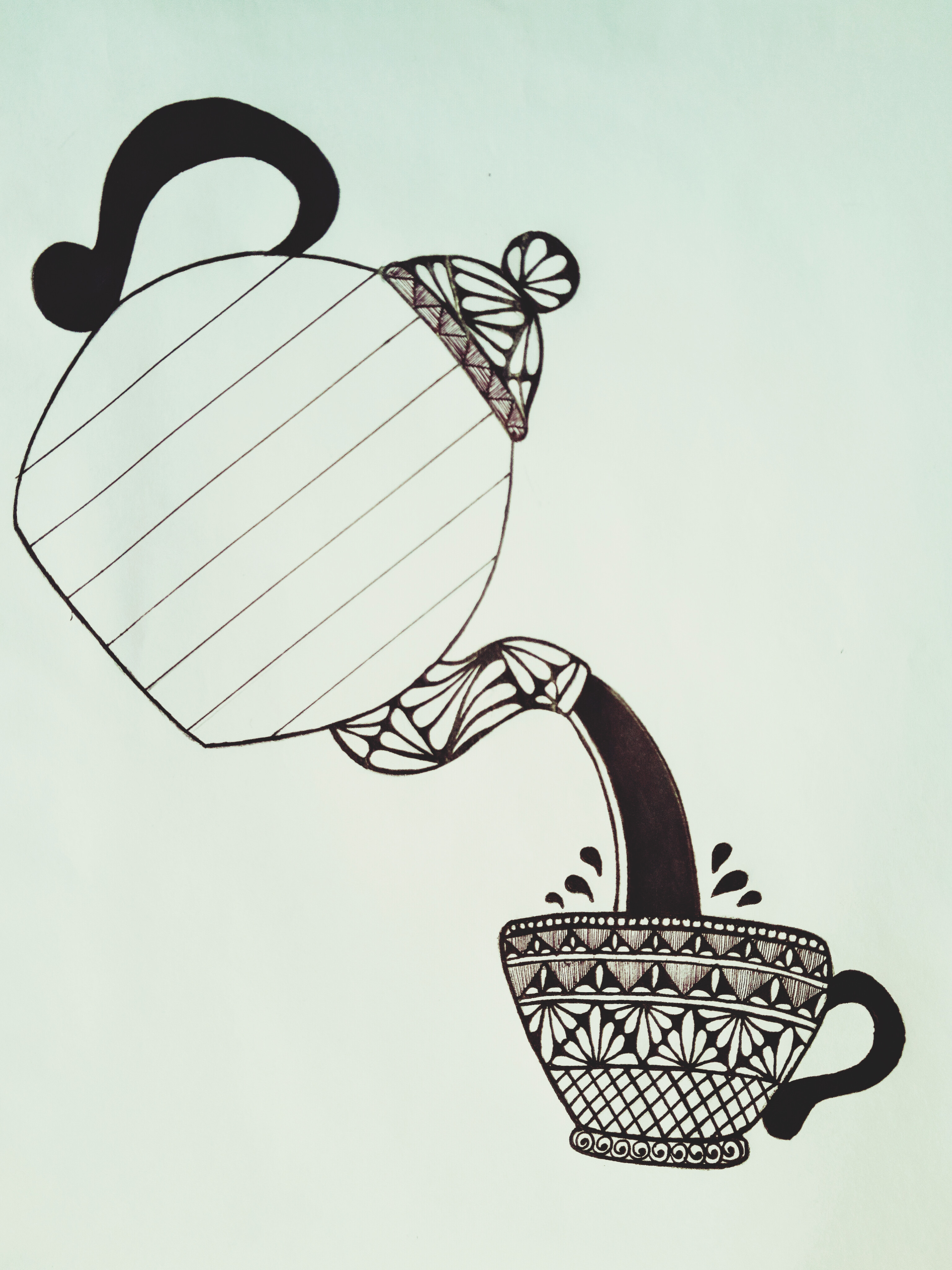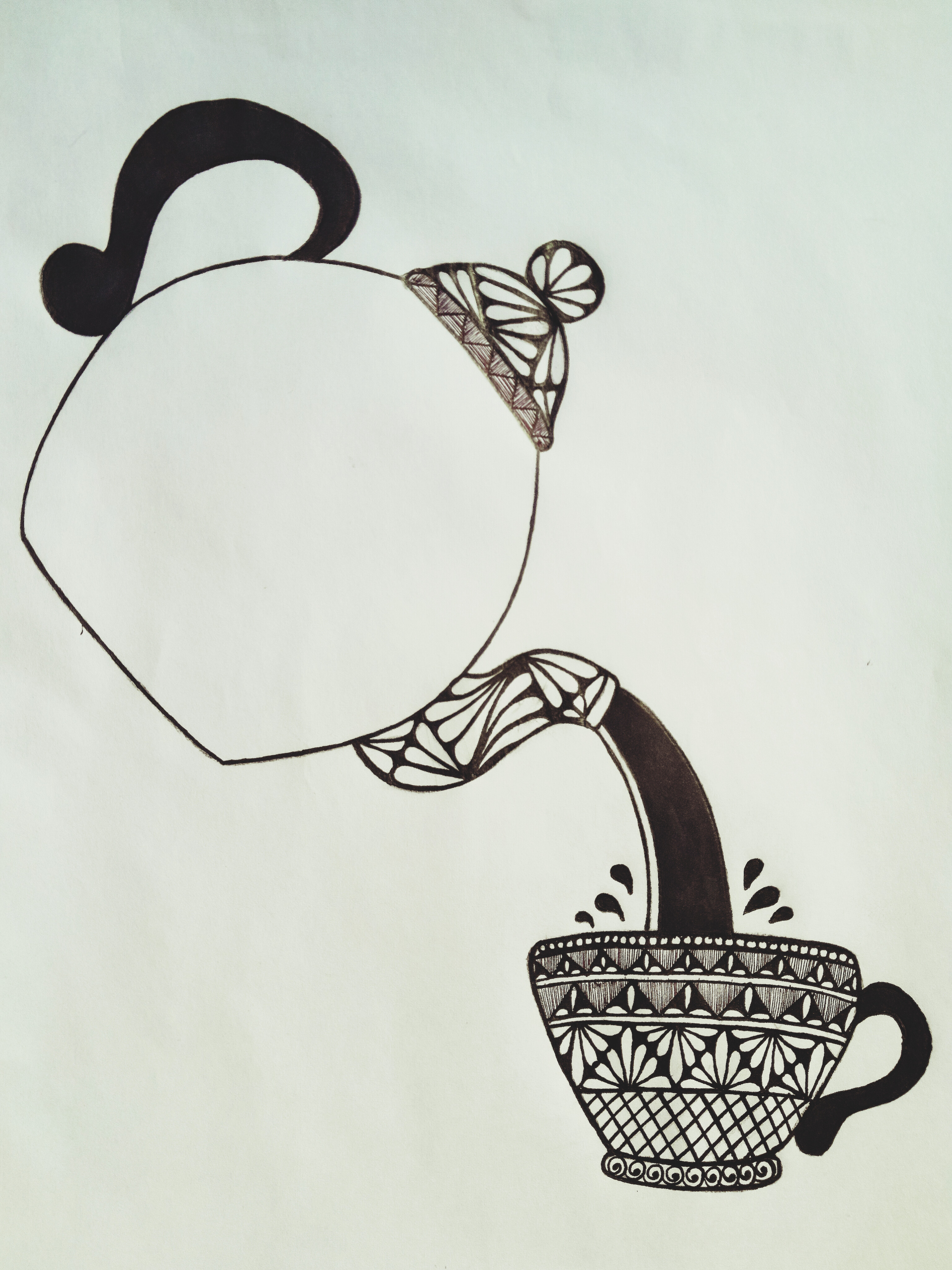 চায়ের কাপের হাতল এবং কেটলি থেকে চা পড়ার দৃশ্যেকে মার্কার পেনের সাহায্যে কালার করে নিলাম। এইবার কেটলির যে জায়গা দিয়ে চা ঢালা হয় সেই অংশে কিছু ডিজাইন করে নিলাম কলমের সাহায্যে।