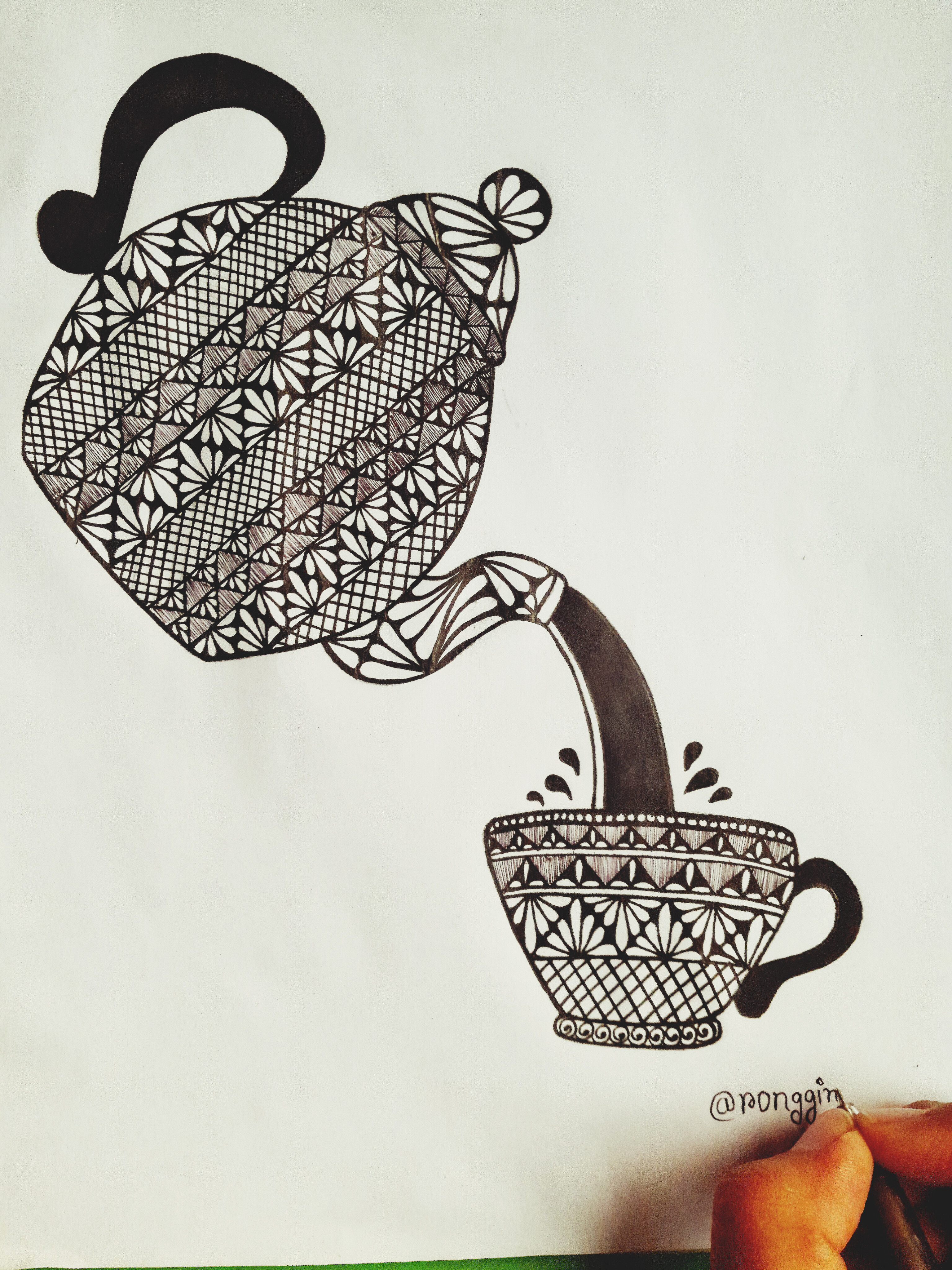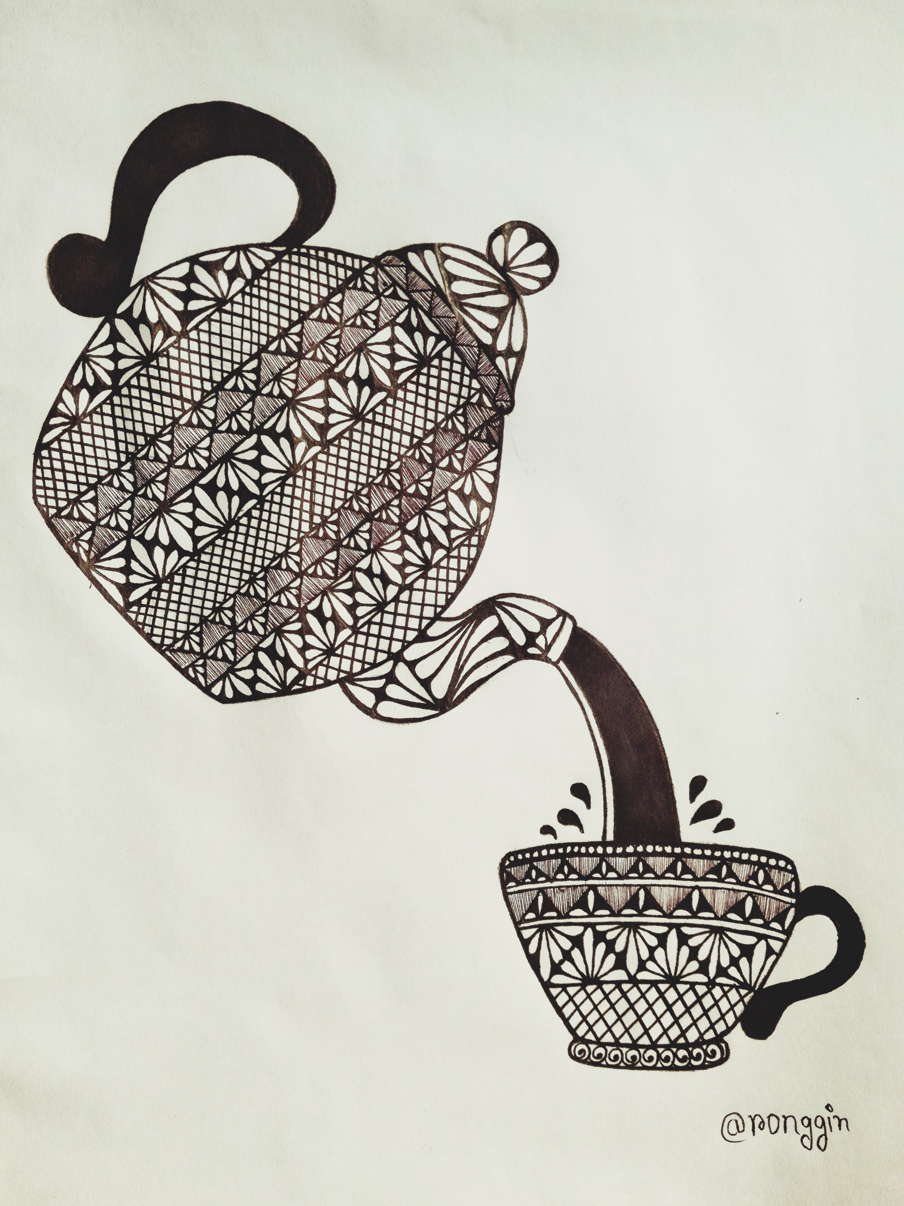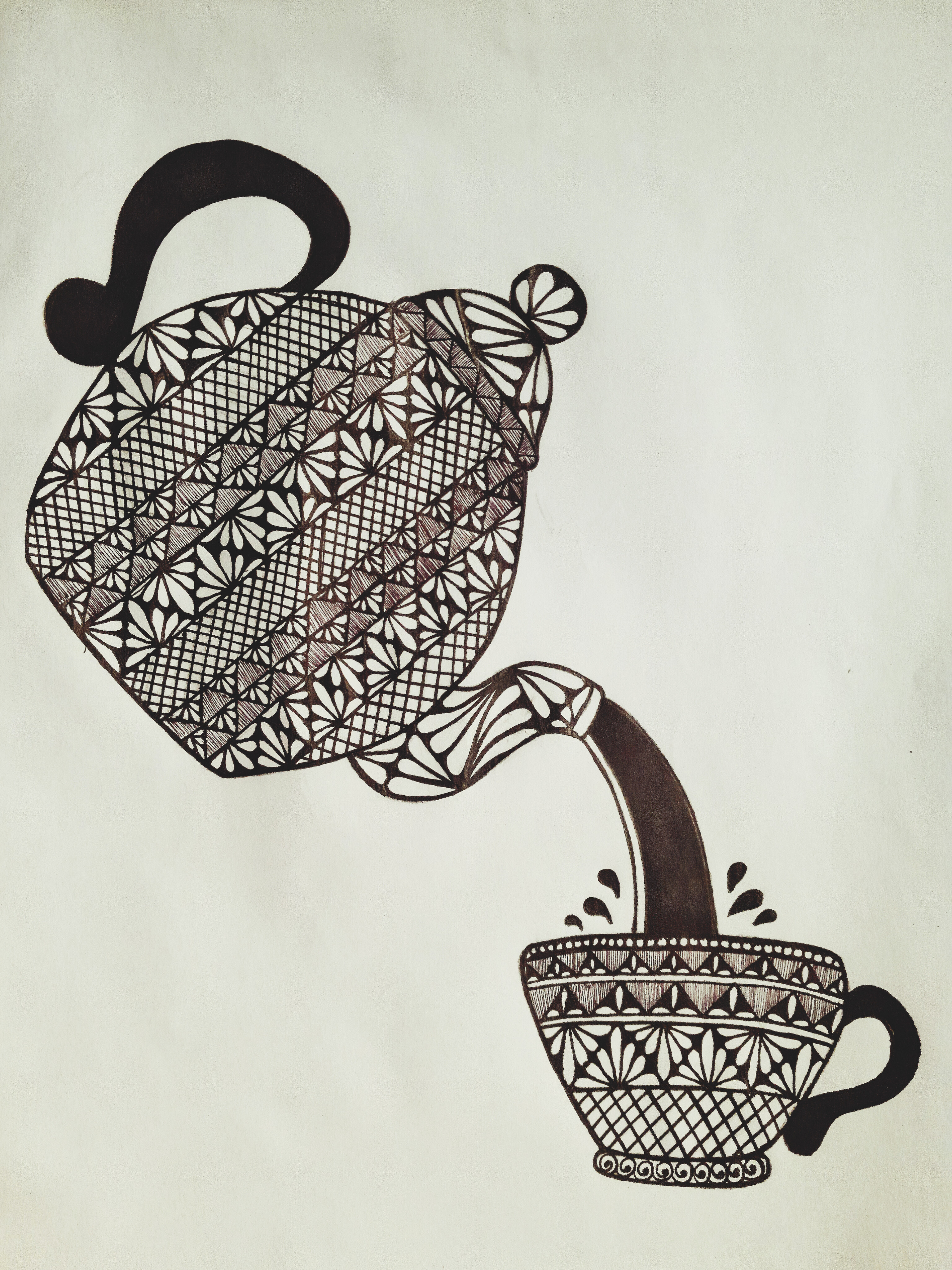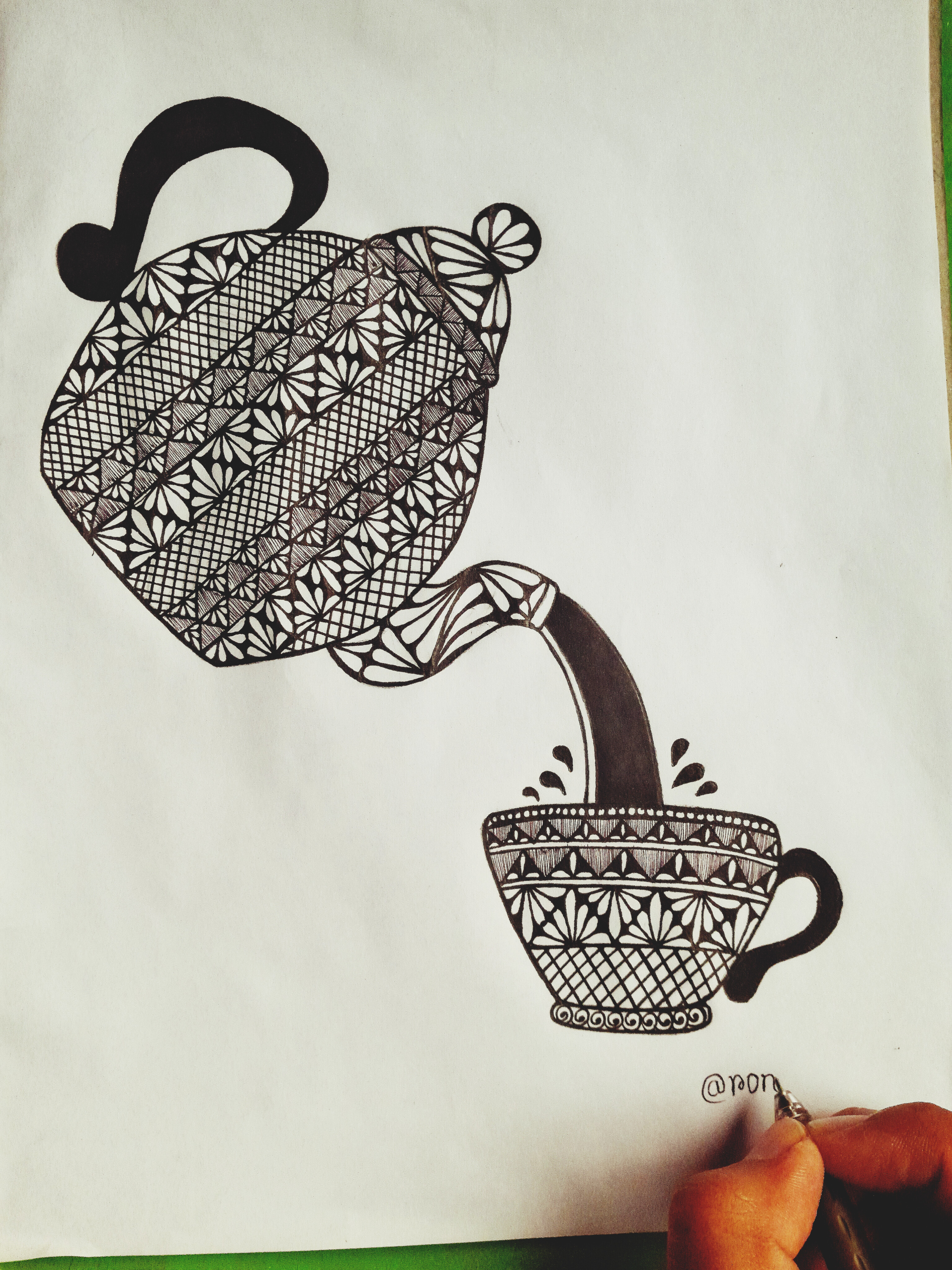 চায়ের কাপের হাতল এবং কেটলি থেকে চা পড়ার দৃশ্যেকে মার্কার পেনের সাহায্যে কালার করে নিলাম। এইবার কেটলির যে জায়গা দিয়ে চা ঢালা হয় সেই অংশে কিছু ডিজাইন করে নিলাম কলমের সাহায্যে।
