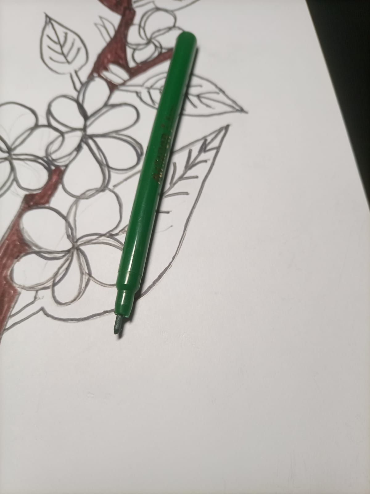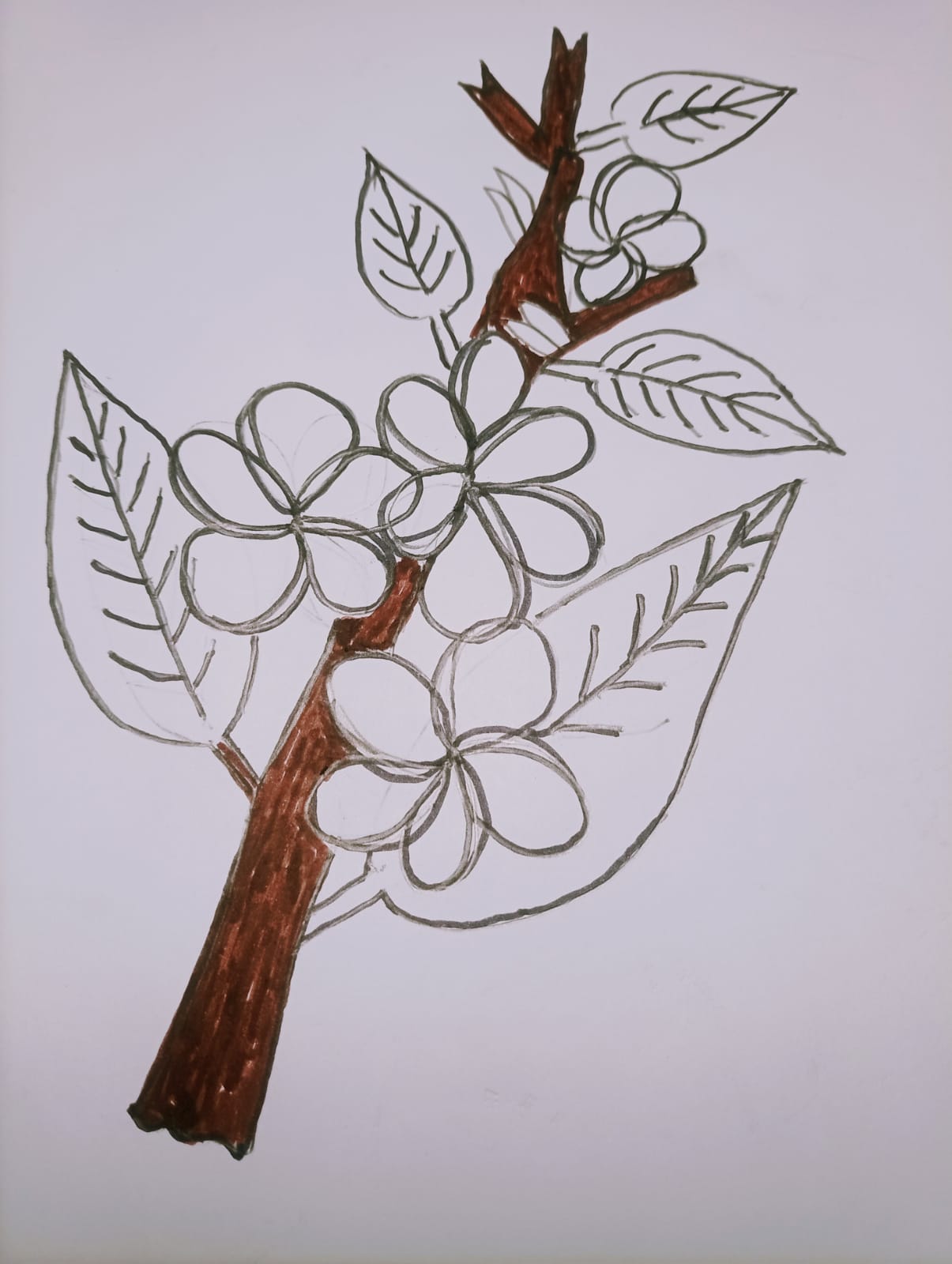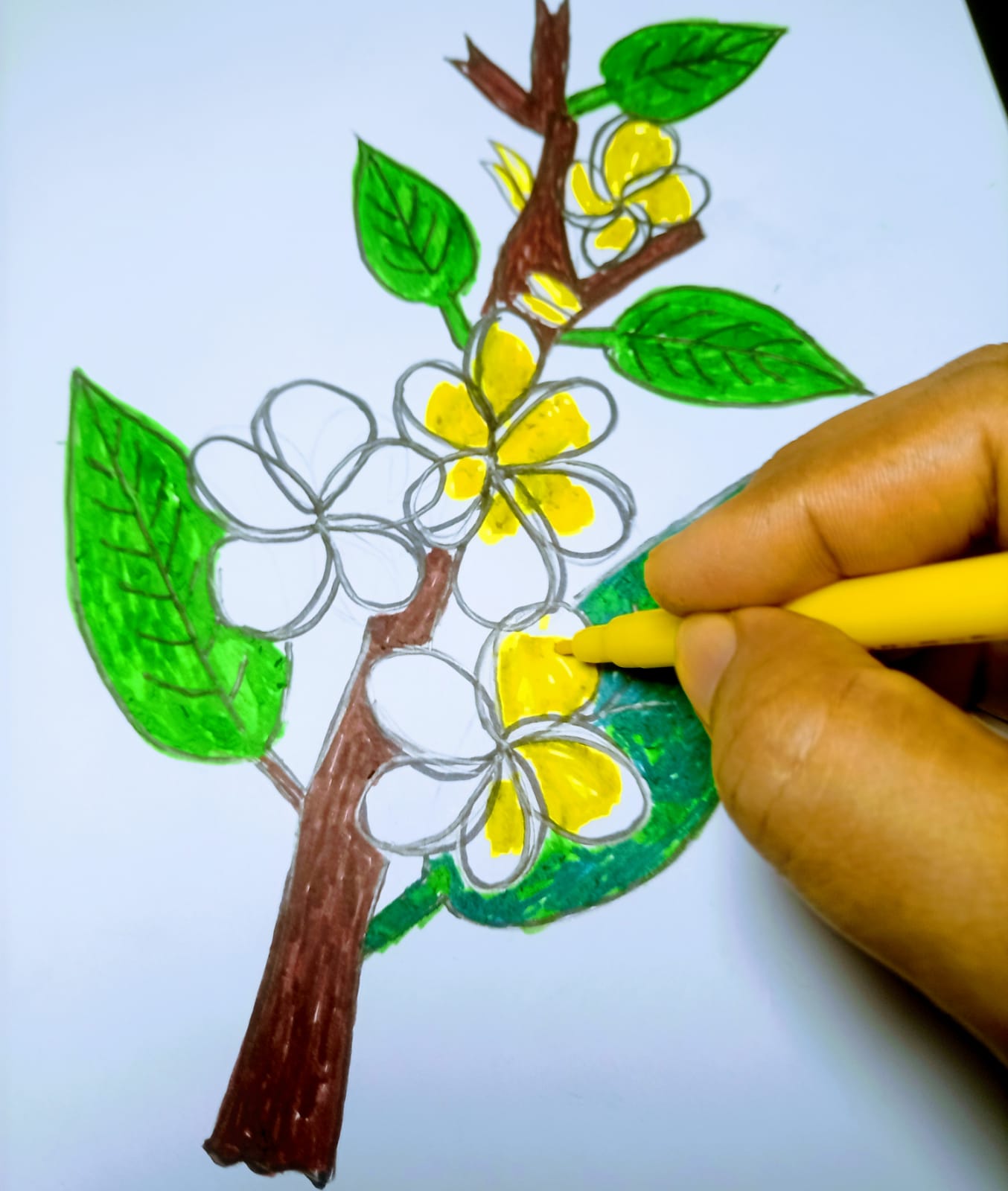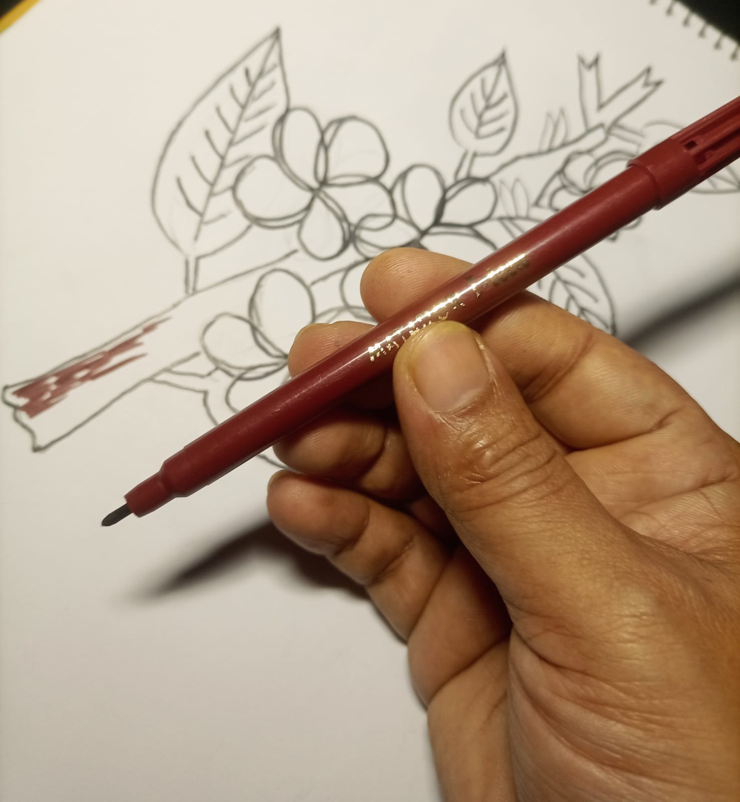 ব্রাউন কালারের মার্কার পেন দিয়ে কাঠগোলাপ ফুল গাছের অংশ কালার করে নিয়েছি।