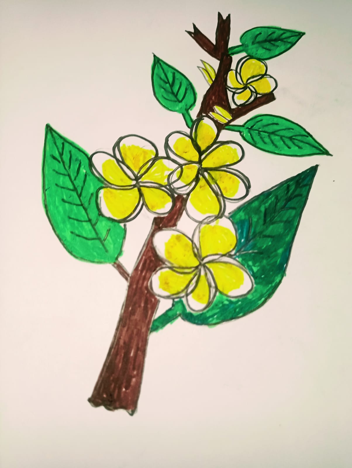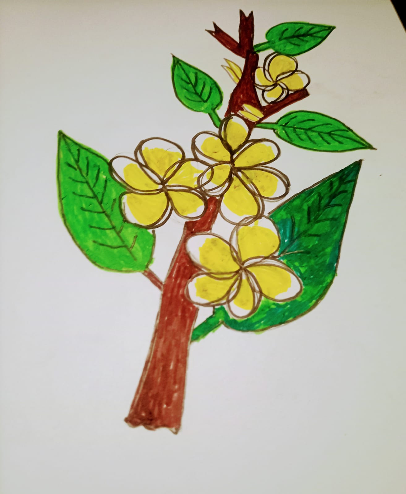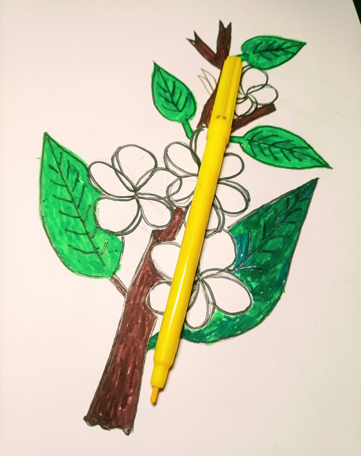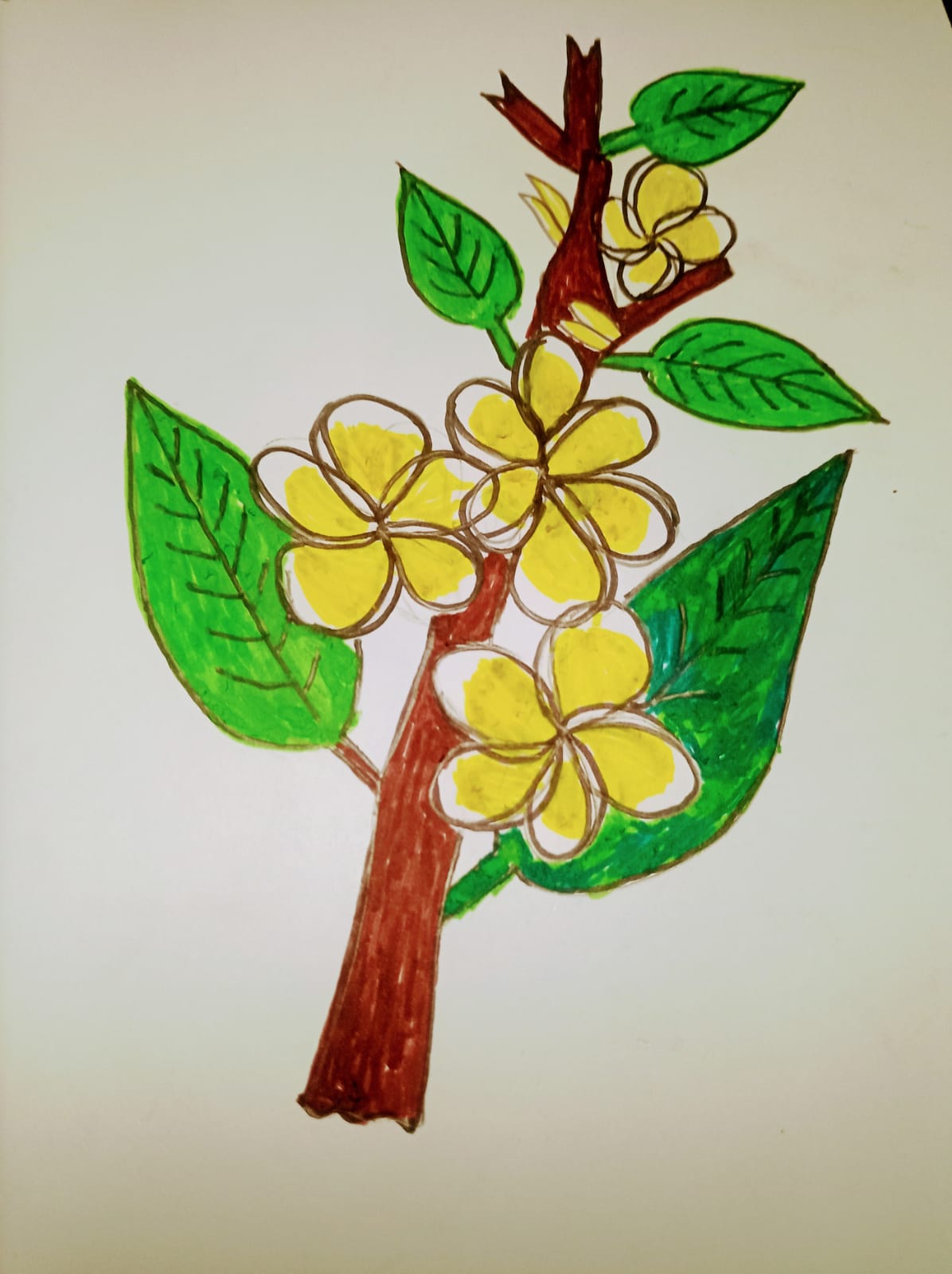 ব্রাউন কালারের মার্কার পেন দিয়ে কাঠগোলাপ ফুল গাছের অংশ কালার করে নিয়েছি।