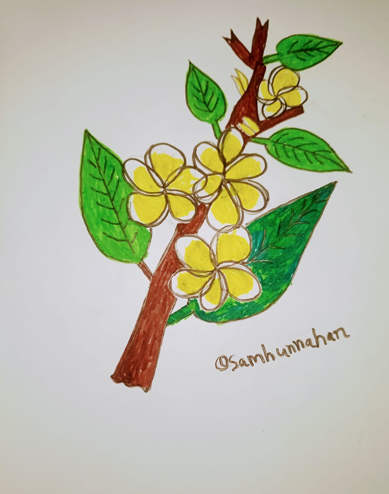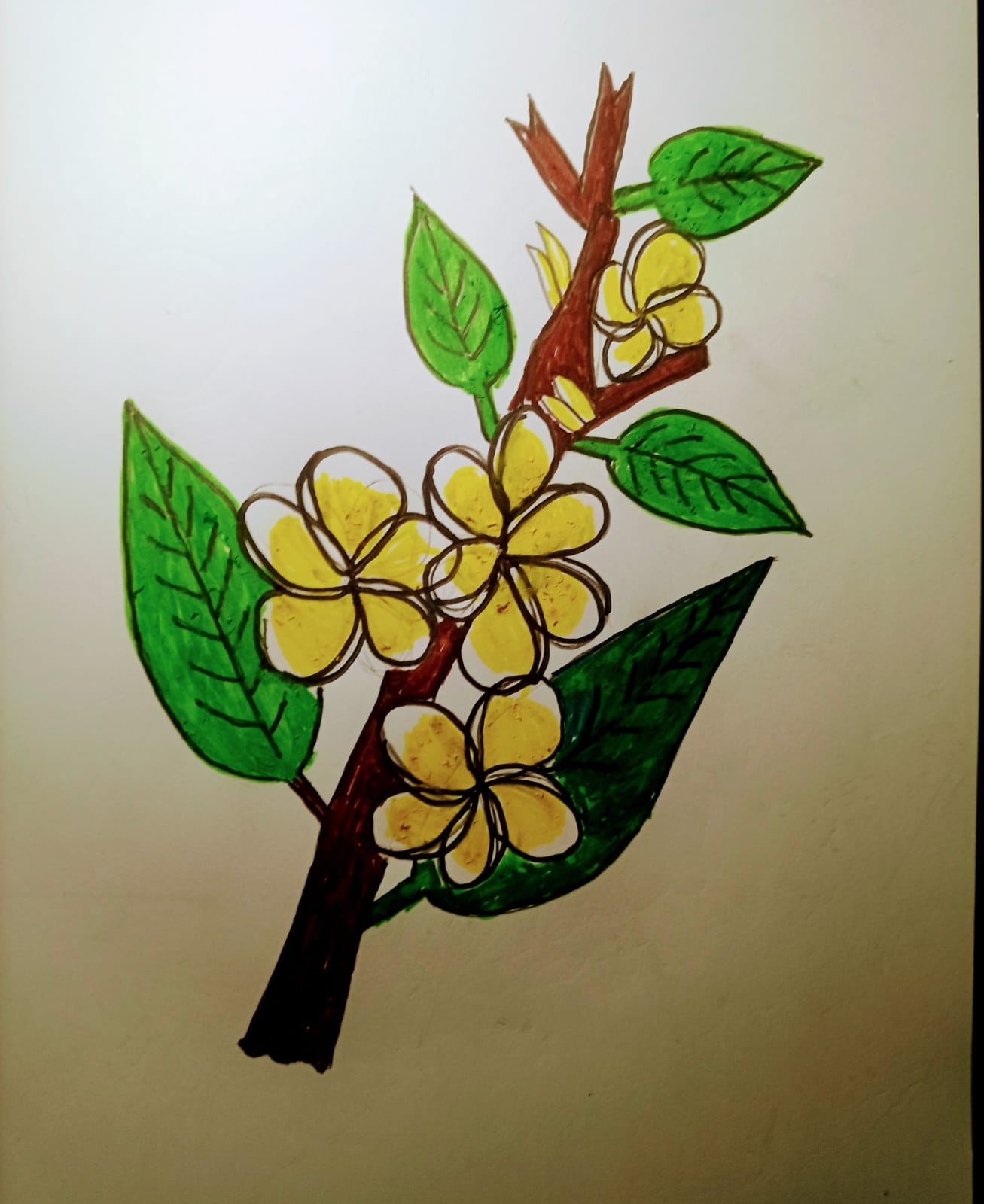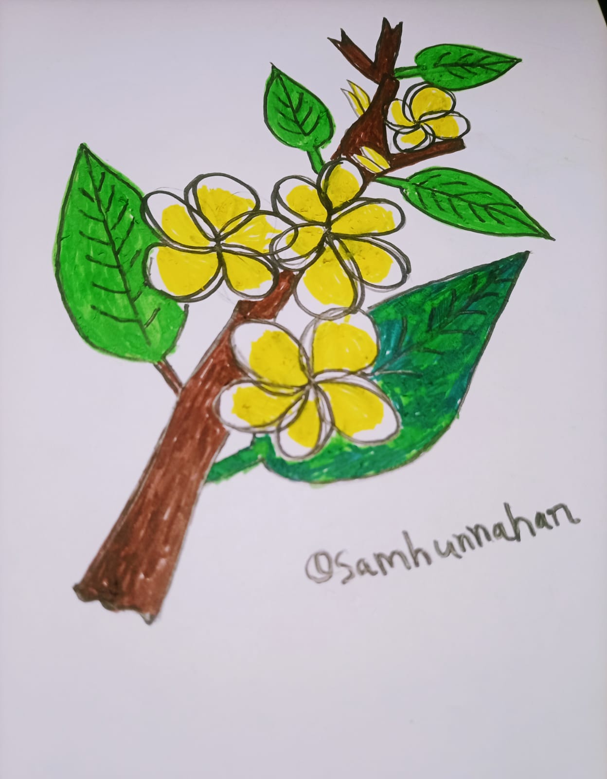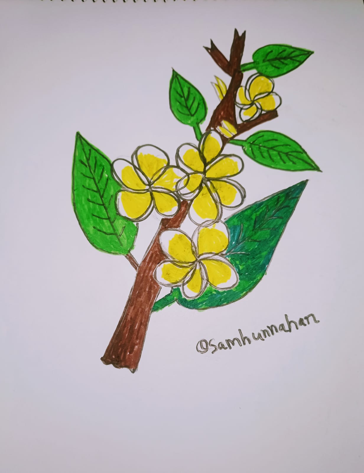 ব্রাউন কালারের মার্কার পেন দিয়ে কাঠগোলাপ ফুল গাছের অংশ কালার করে নিয়েছি।