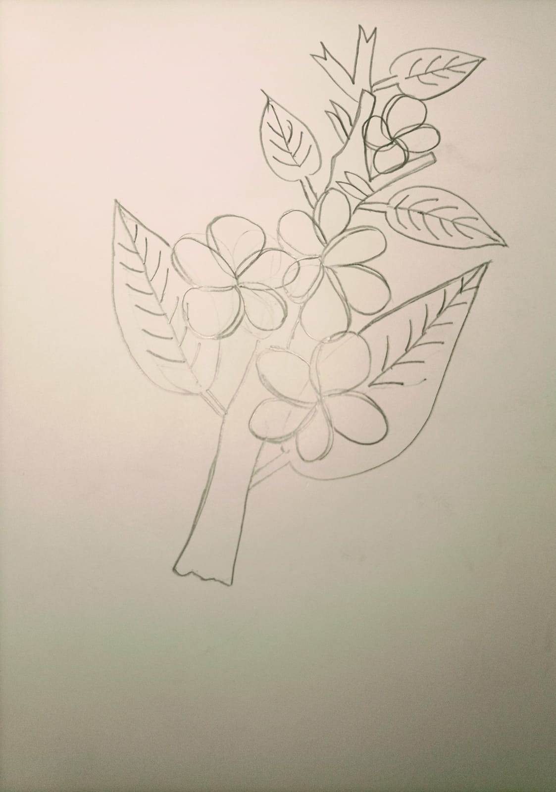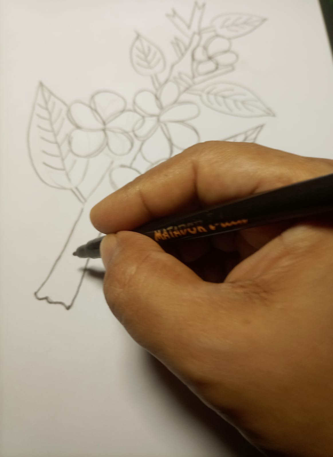 প্রথমে প্রয়োজনীয় উপকরণ সমূহ সব উল্লেখ করেছি এবং নিয়ে দেখালাম। এখন সরাসরি আর্টের মূল পর্যায়ে চলে যাব। আর্ট করার জন্য পেন্সিলের সাহায্যে প্রথমে ছোট করে একটি ফুলের অংশ এঁকে নিয়েছি।