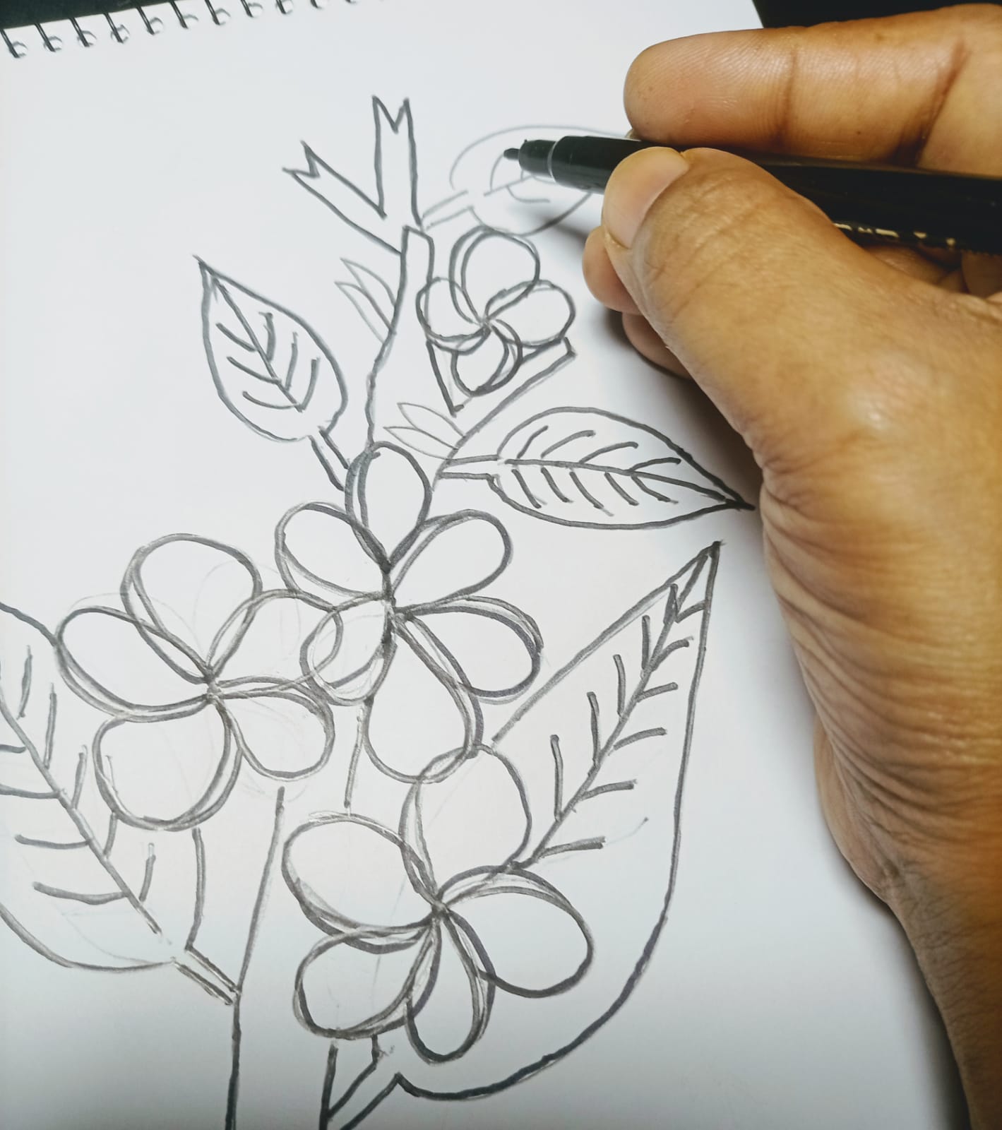 এই ধাপে আমি কাঠগোলাপ ফুলের পুরো অংশ এঁকে নিয়েছি। এরপরে কালো কালার মার্কার পেন দিয়ে আবারো সুন্দর করে উপর থেকে এঁকে নিয়েছি।